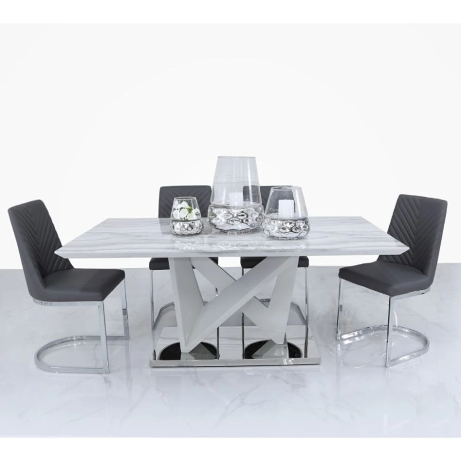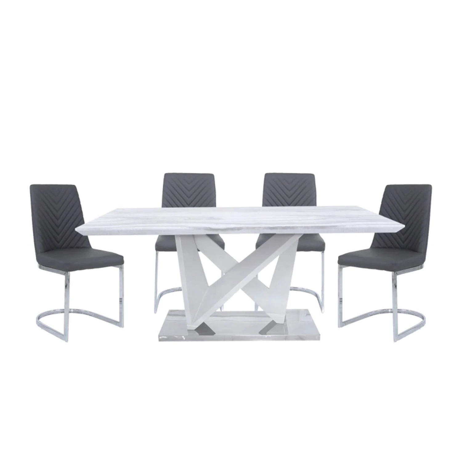 The Amara Marble Effect Dining Set with 4 Chevron Chairs features a stunning geometric marble veneer wood base with a chrome foundation, topped with a rich glossy marble style table-top. With 4 fabric chairs included in a grey chevron finish, they provide maximum comfort whilst dining. A stunning contemporary style dining set that is certain to impress and add that luxury appeal you’ve been looking for, it’s not to be missed out on!