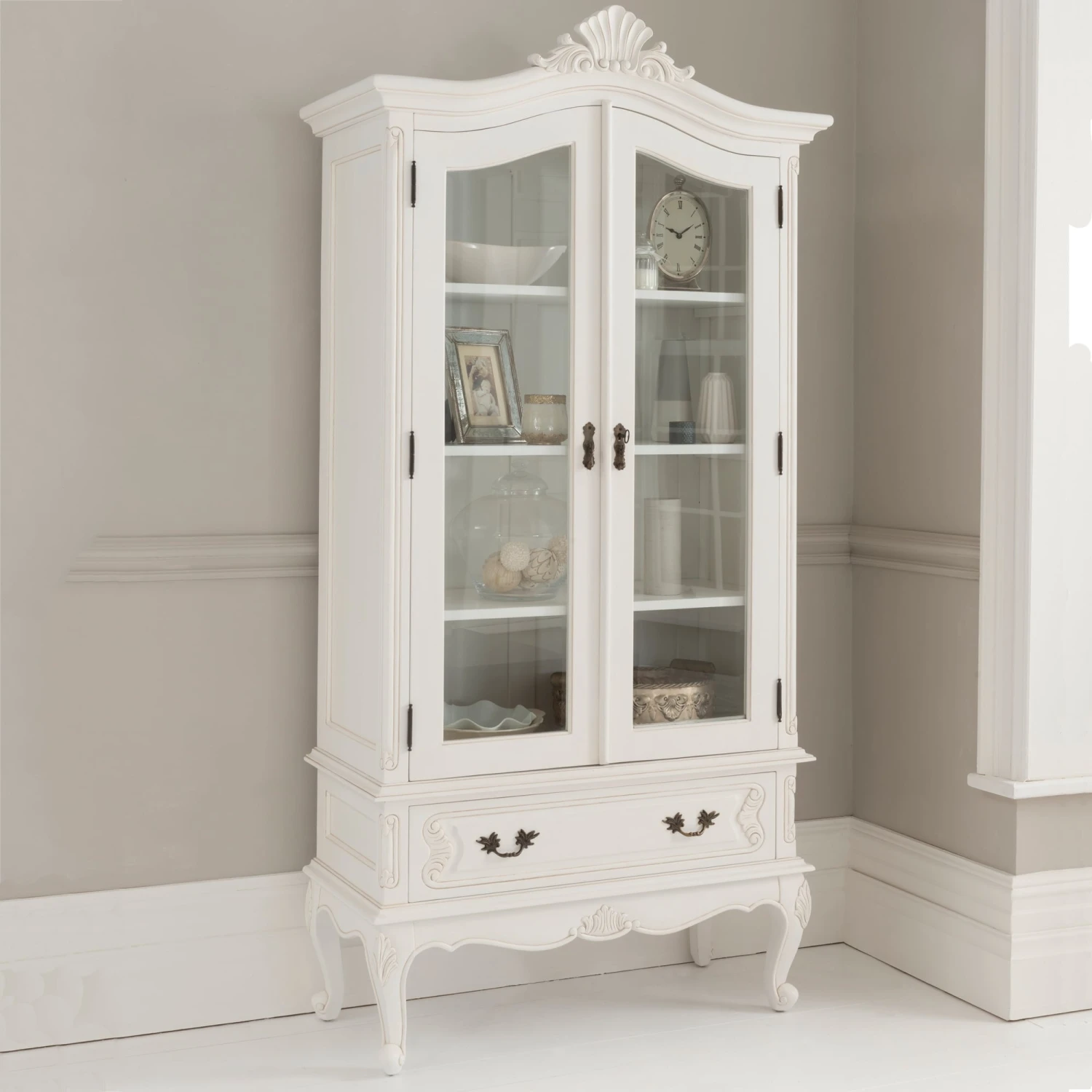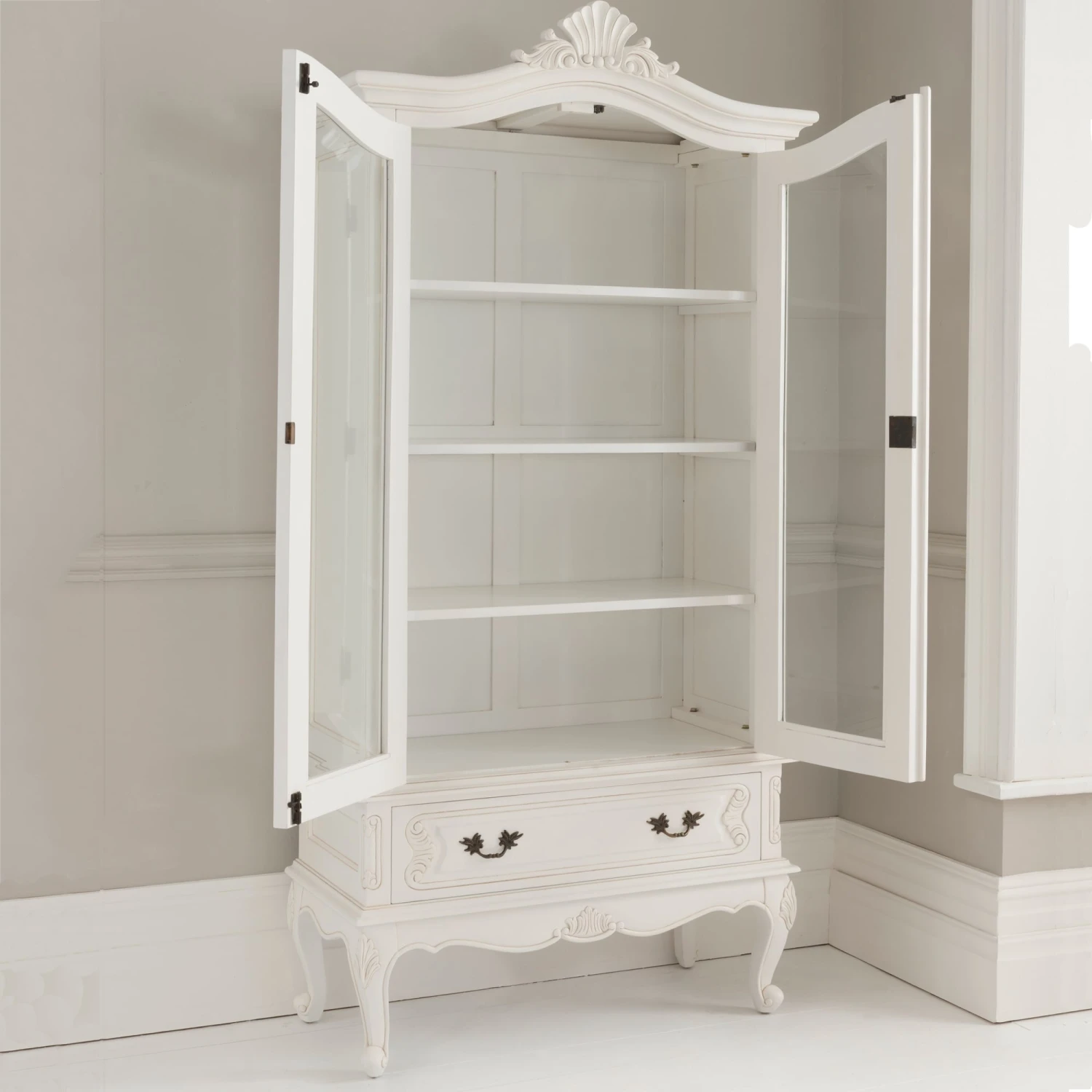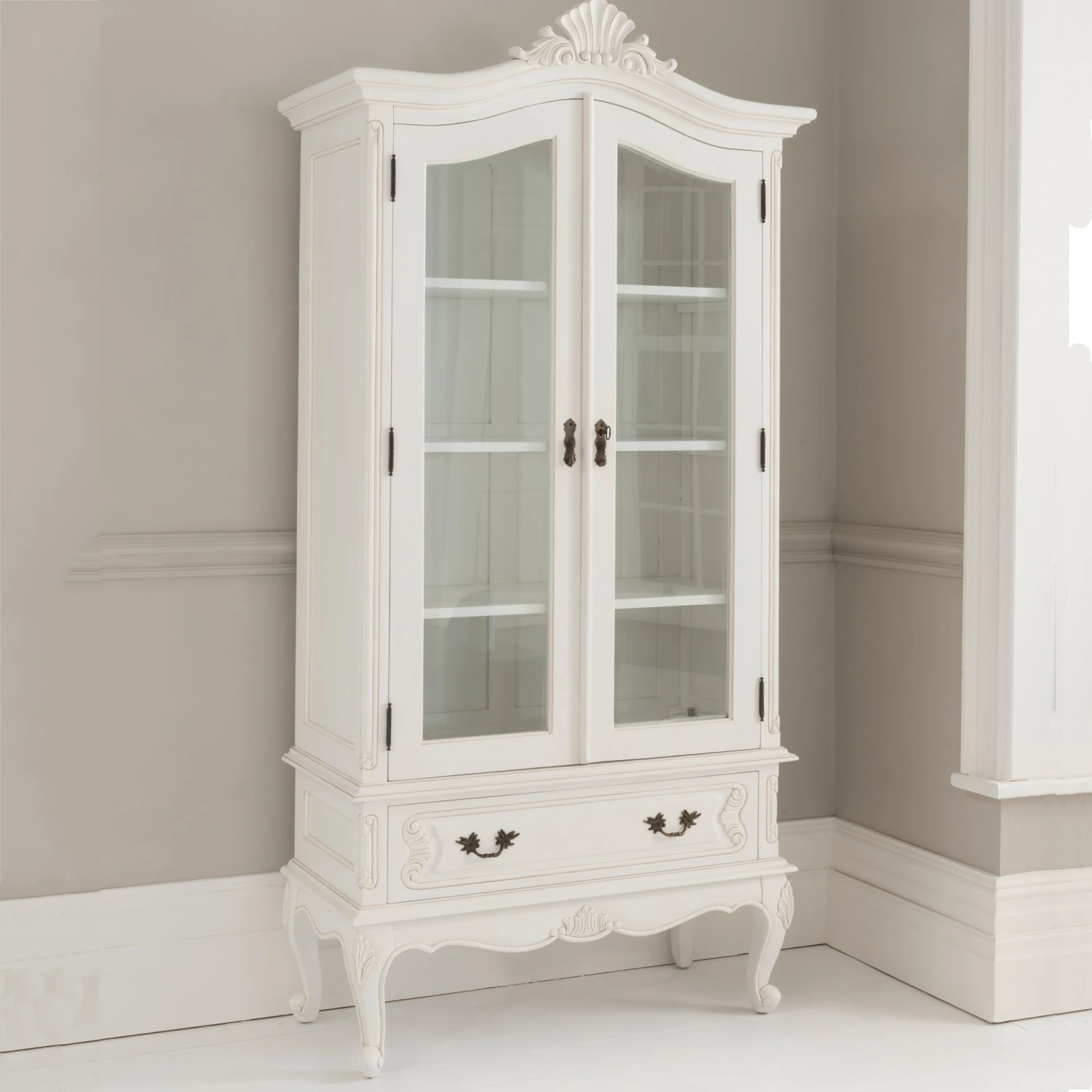 With it’s wonderful ornate detail this stunning Antique French display cabinet is a fantastic must have addition in any home. A truly exceptional item that is guaranteed to last generations. As is the case with all of our items, this cabinet is handcrafted by experts using only the finest of materials. Weather on its own or complimented with our stunning shabby chic furniture, this display cabinet is sure to impress.