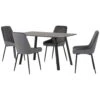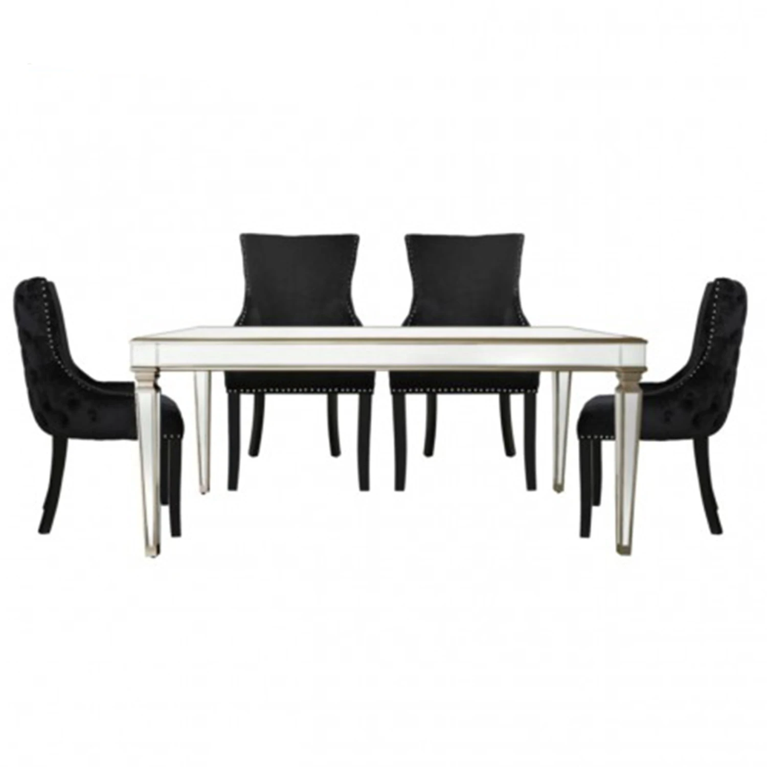 Modernise your home by welcoming this absolutely stunning new dining set. Coming with four black faux velvet chairs and a Venetian Apollo style table with gold trimmed edges and sturdy pillar legs, this bundle would be an added luxury to any home.