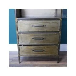 Crafted from metal this Arched Antique Metal with Glass Door Display Cabinet comes in an antique bronze finish for an industrial charm. The top of the cabinet is arched featuring 4 shelves behind a glass door with panel detailing. The bottom of the cabinet has 3 small drawers for extra storage.
