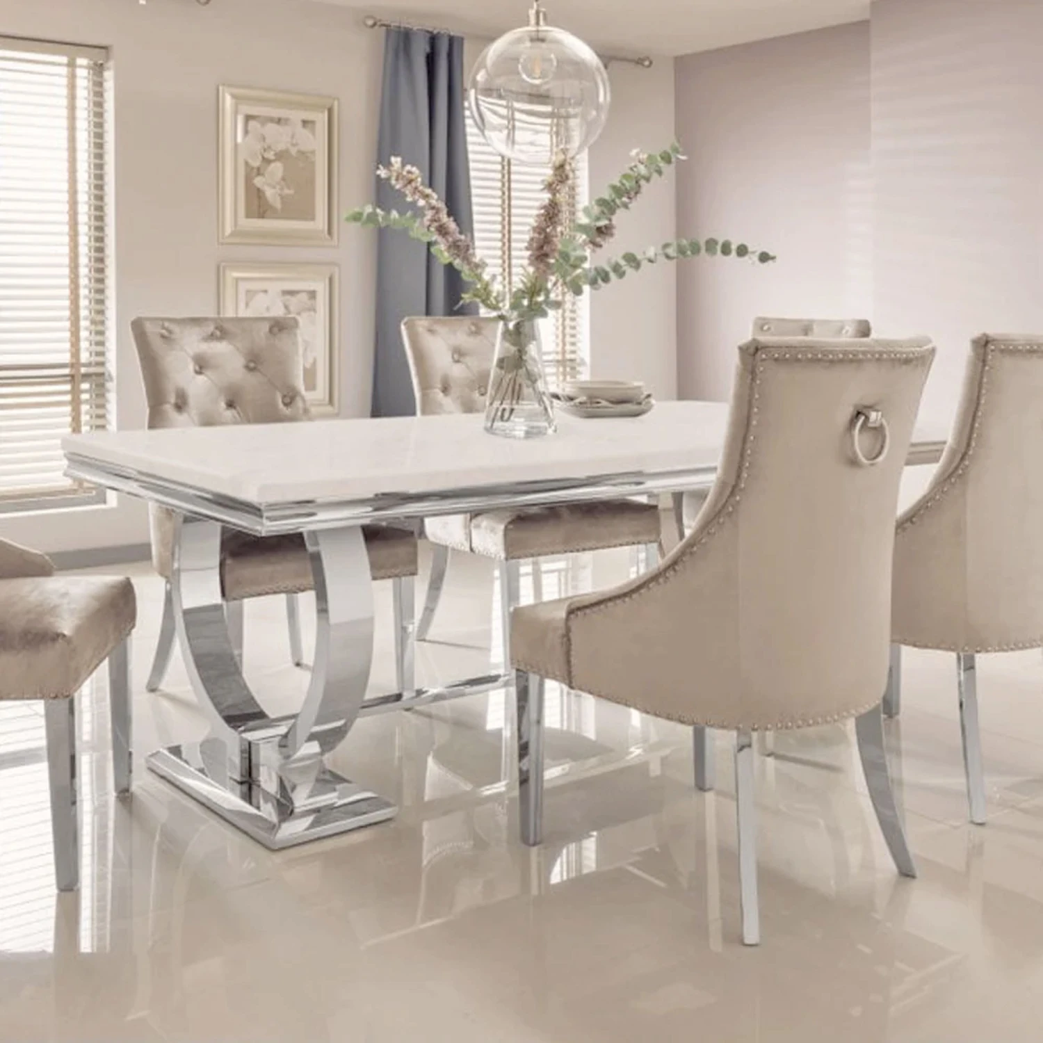 The Arriana White Glass 2 m Dining Table comes in a luxurious design with polished stainless steel circular legs adding a real statement in your dining room. The top of the table features a luxury white glass top made hardwearing and scratch resistant. The table comes with sleek lines and smooth materials adding elegance and making it easy to clean for a busy family. The dining table seats up to 8 people and can be displayed with your own choice of dining chairs or benches.