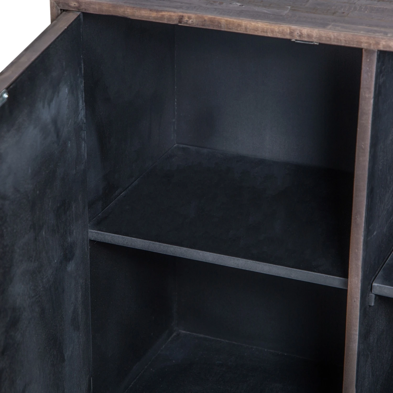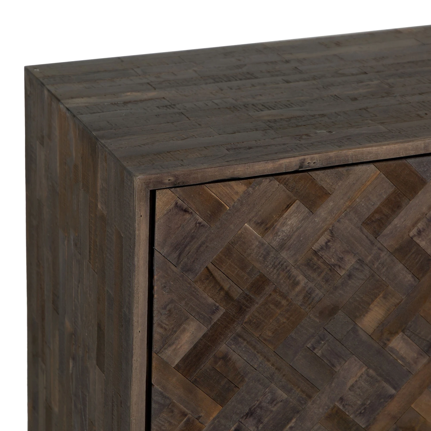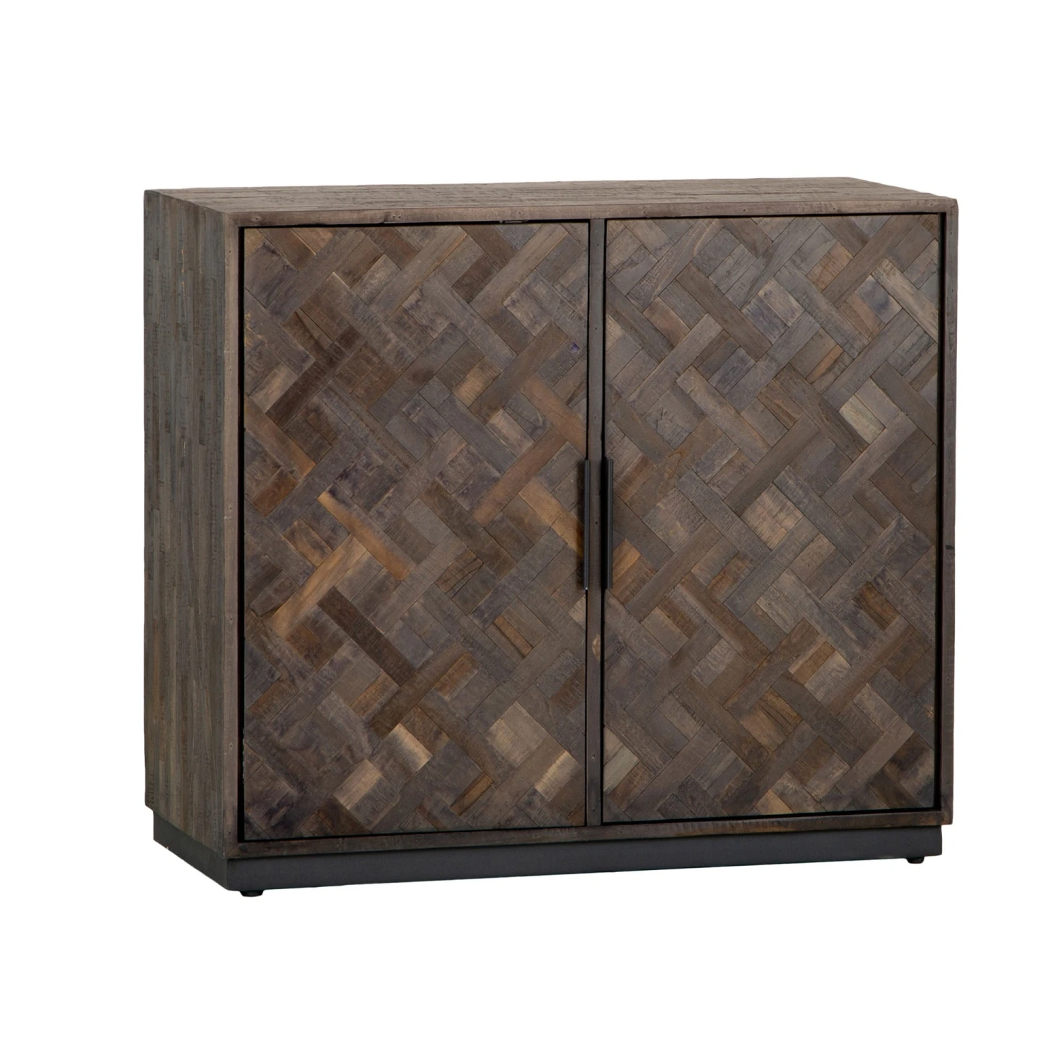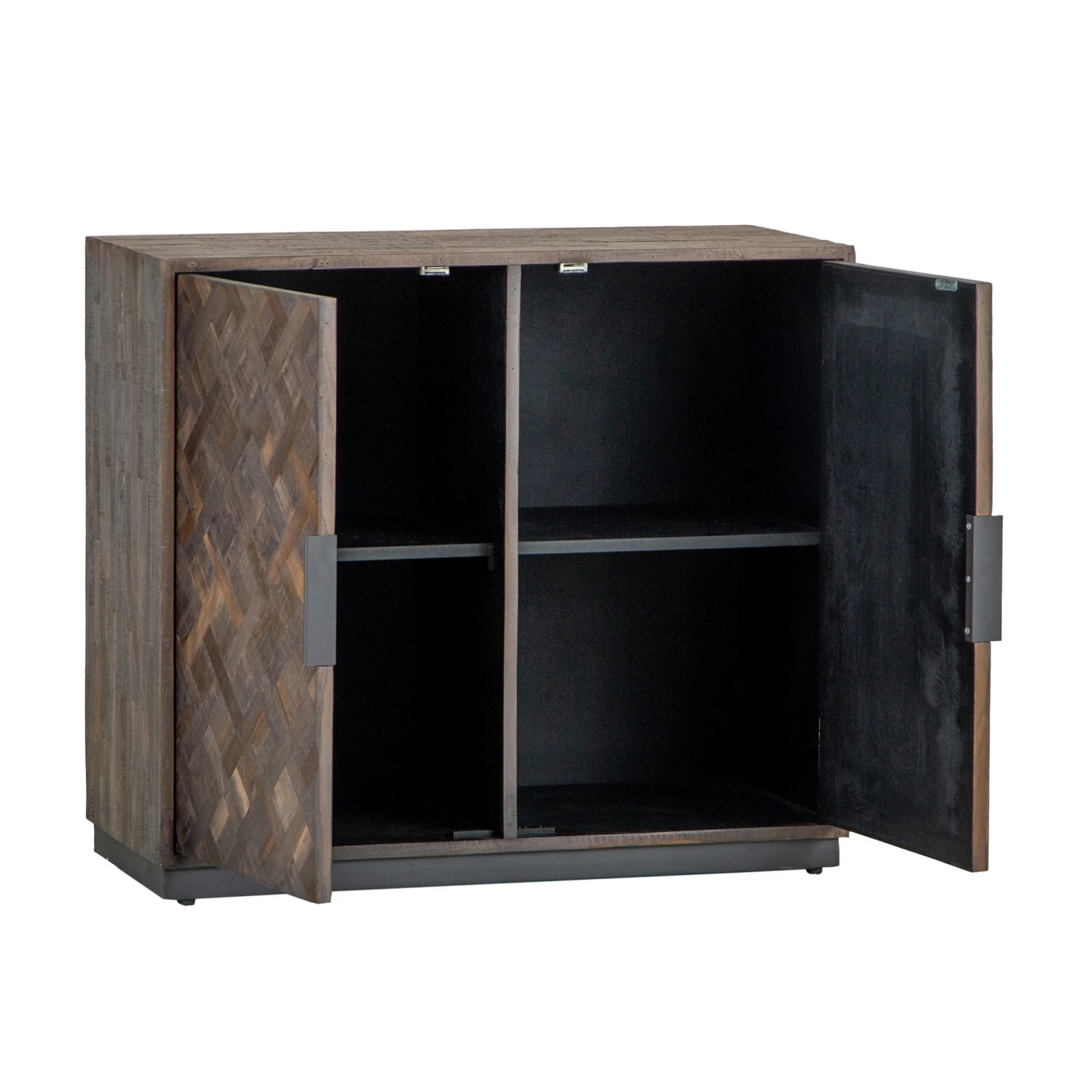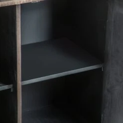 Bring a retro charm to your living or dining room with this stunning industrial style Banerra Teak and Iron Standard Sideboard. The sideboard features a stunning parquet design, a beautifully intricate and elegant, geometric pattern which is made from multiple wooden panels showing all the different tones and wood grain. The sideboard sits on a rectangular black iron base and feature 2 doors to the front with 4 cube shaped shelves inside and discreet handles on the outside. The stunning sideboard will look lovely displayed with matching items from the Banerra Teak Collection.