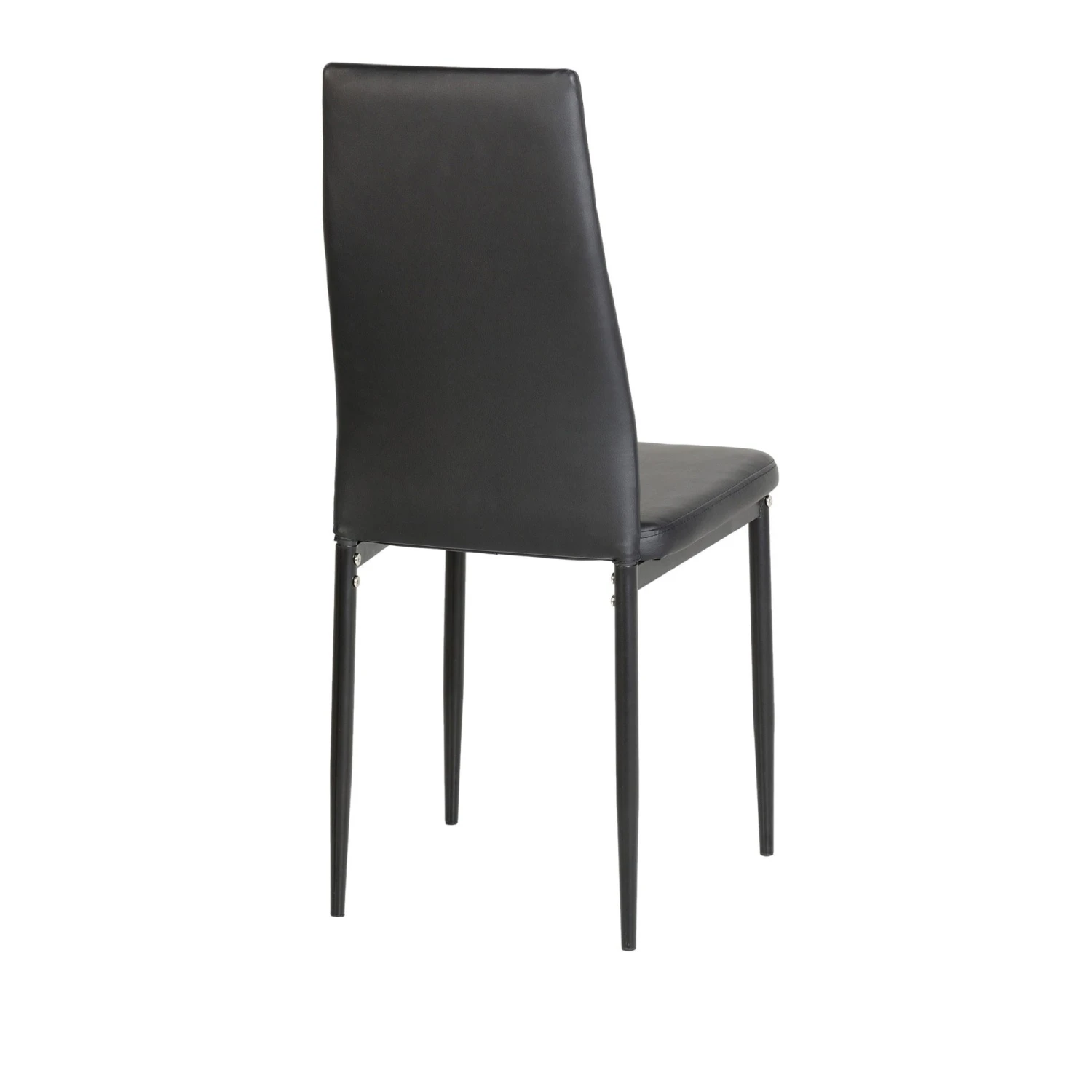 Boasting a contemporary design, this Black Faux Leather Abbey Chairs are both stylish and comfortable, making family meals more enjoyable. Coming crafted using a metal frame with a high back rest for additional support, they come upholstered in a black faux leather with horizontal stitching creating a panelled look. With foam padded seats to ensure maximum comfort, these dining chairs are a lovely addition to a modern dining area.