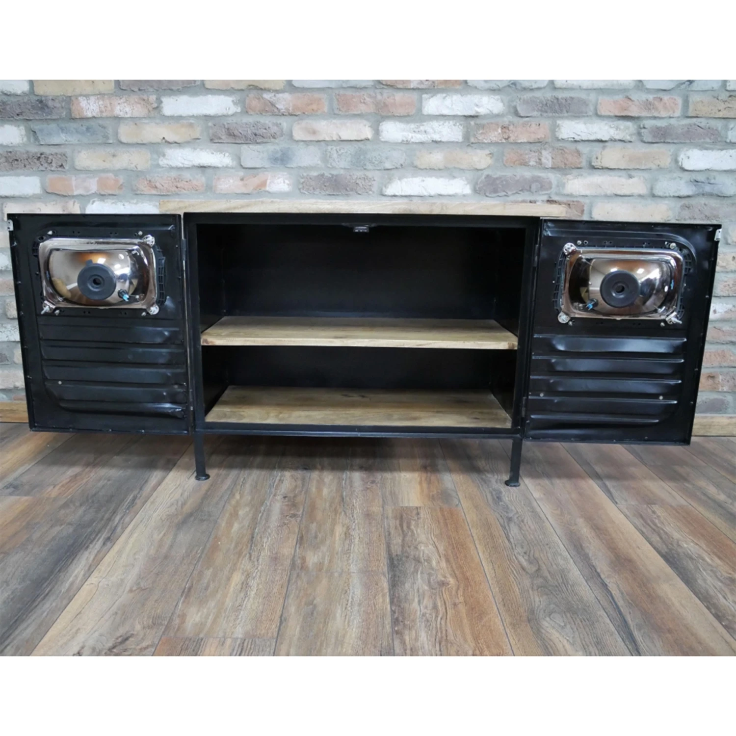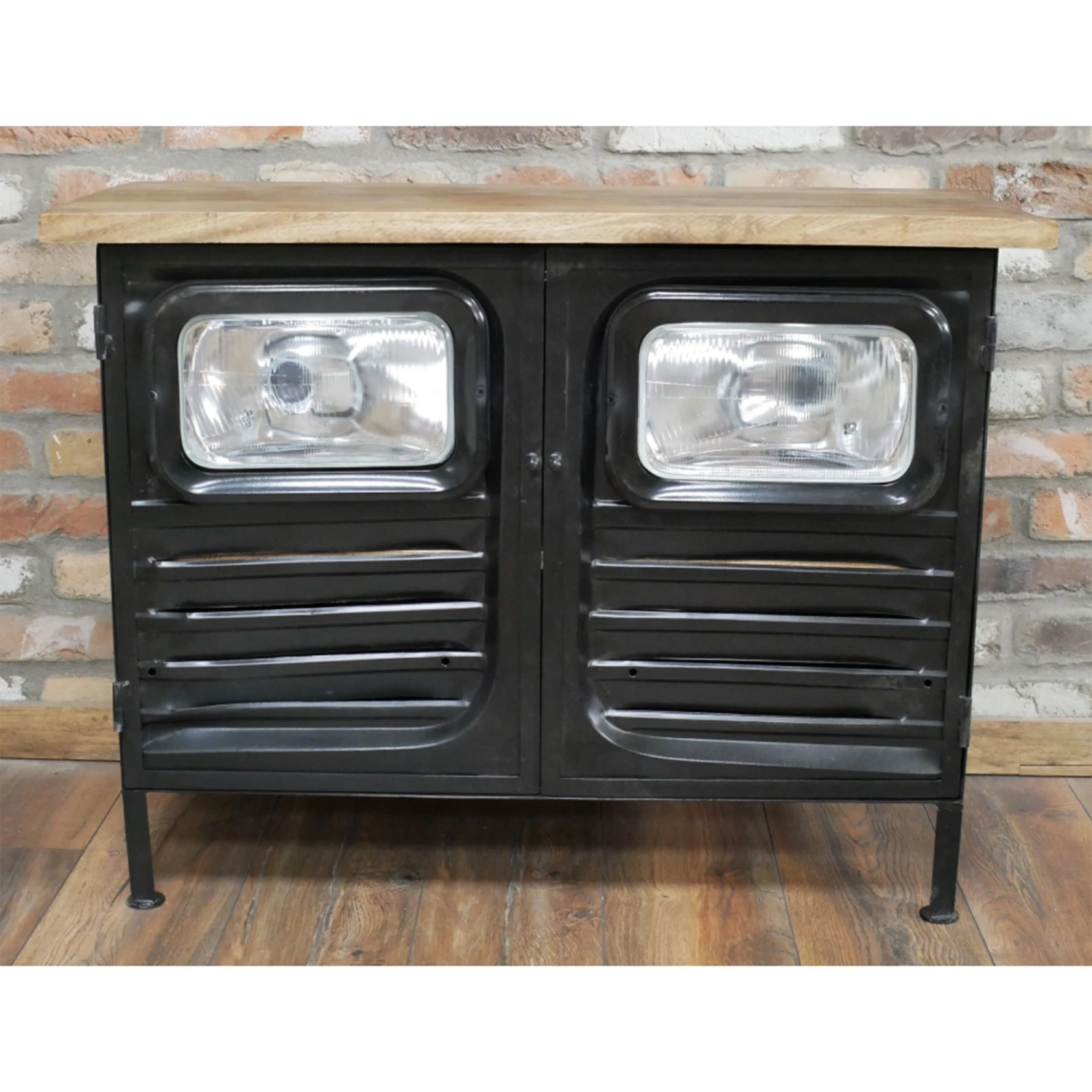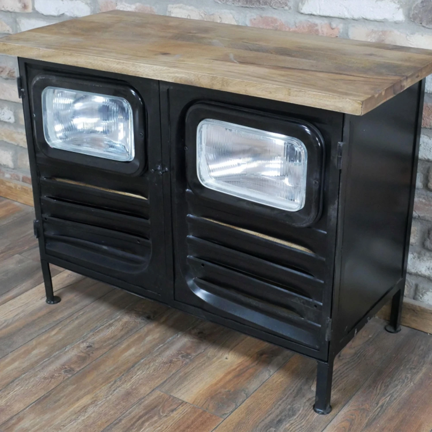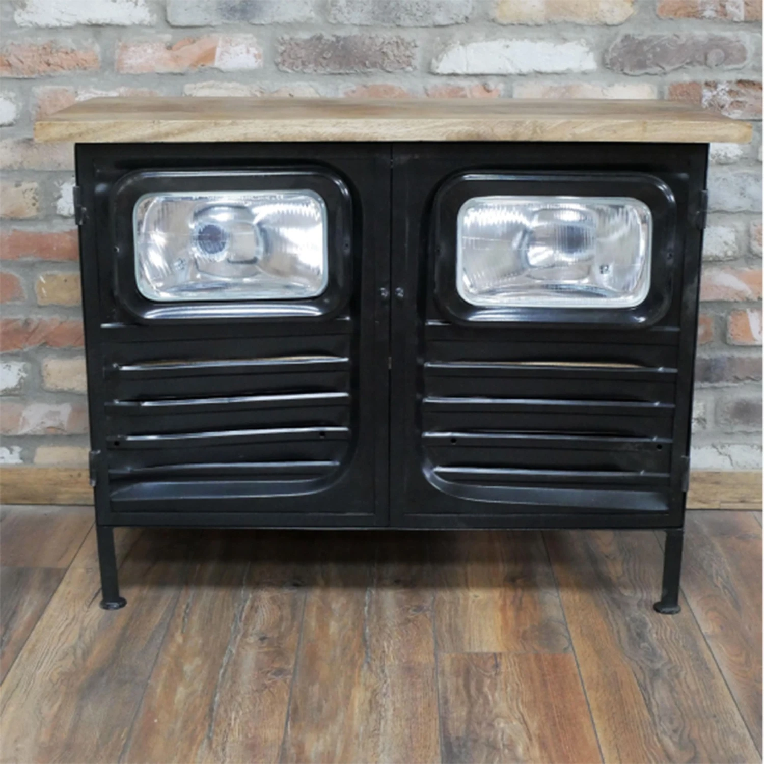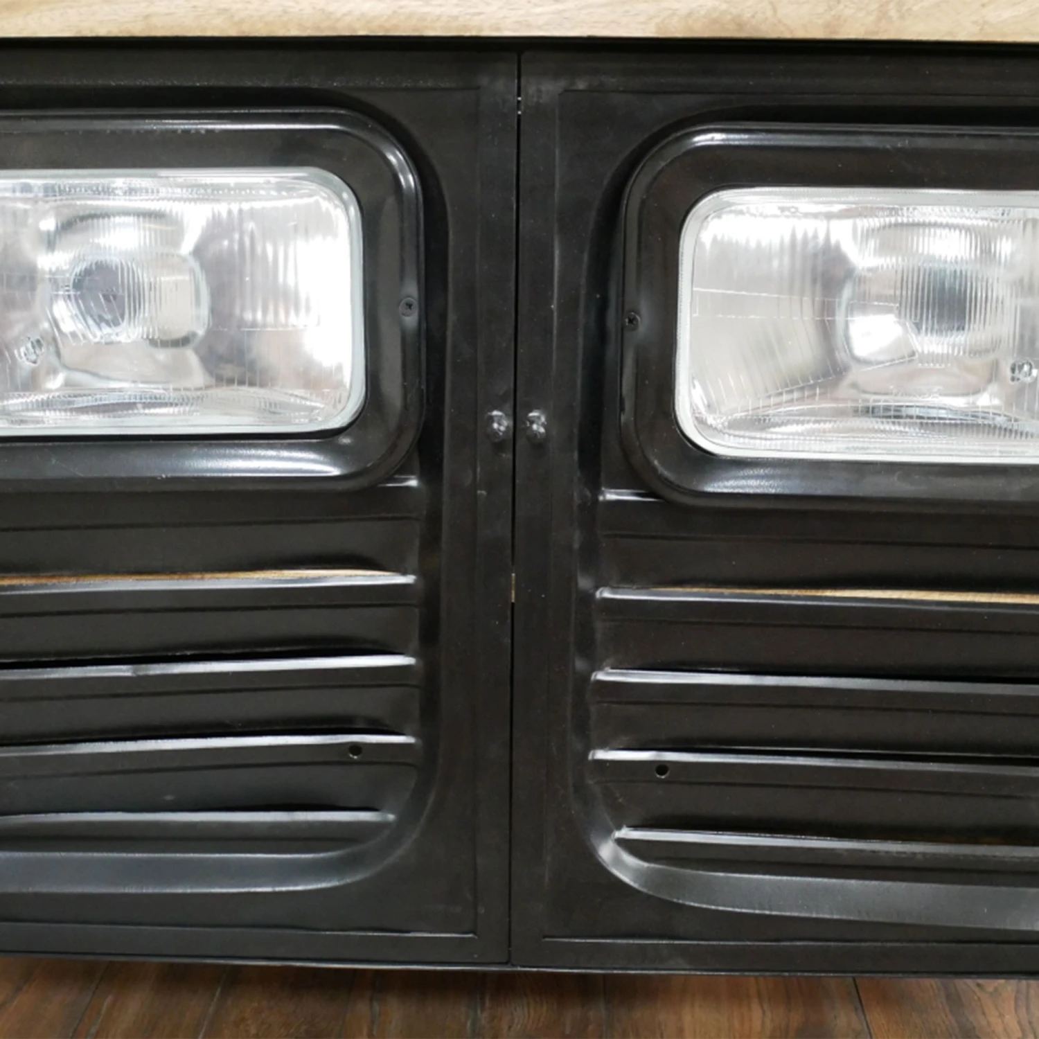 Adding an industrial design to your living or dining room with this Black Iron and Wood Trimmed Truck Cabinet. The cabinet is crafted with a black iron featuring a textured design to the 2 front doors and also has headlights inserted in. The cabinet is topped with a solid wood top and shelving inside. Used this cabinet for storage and decorate the top with ornaments and lamps.