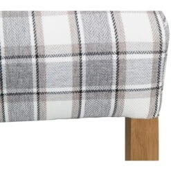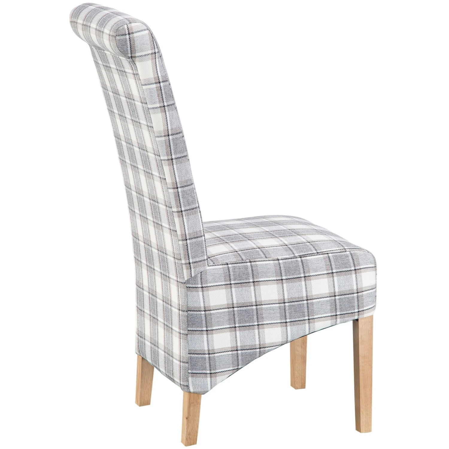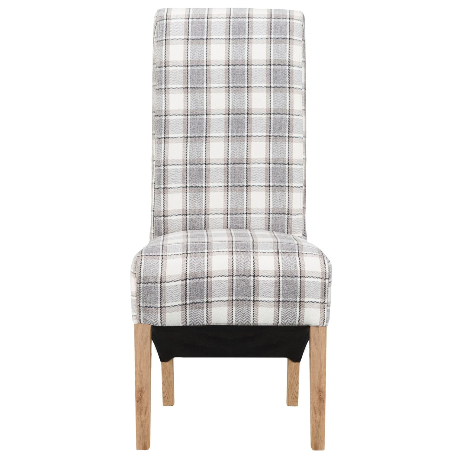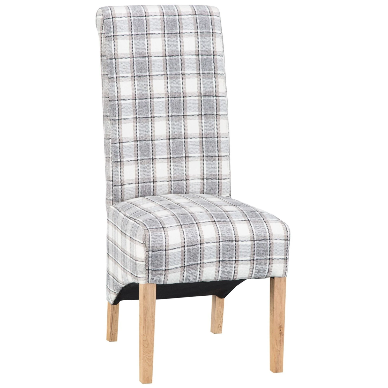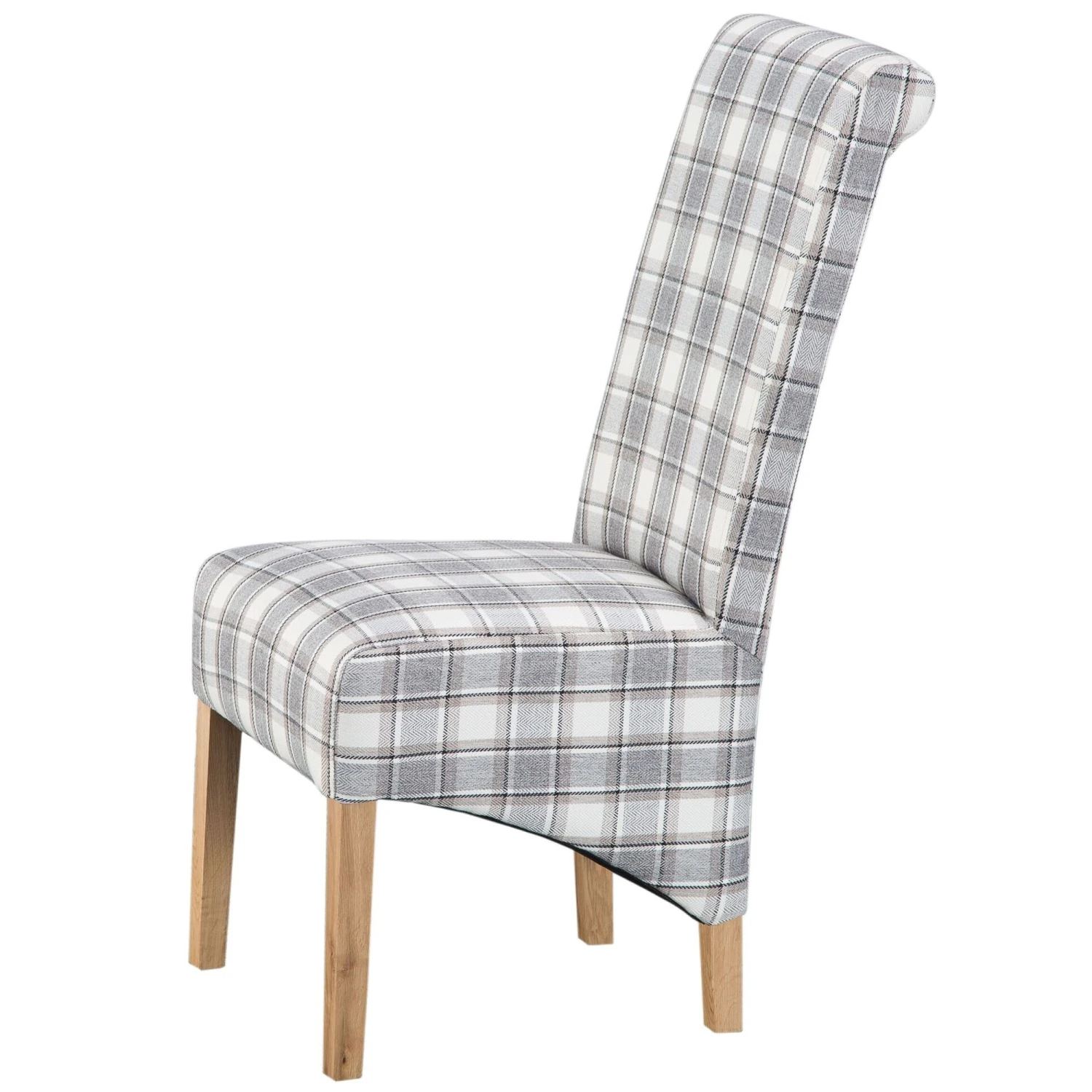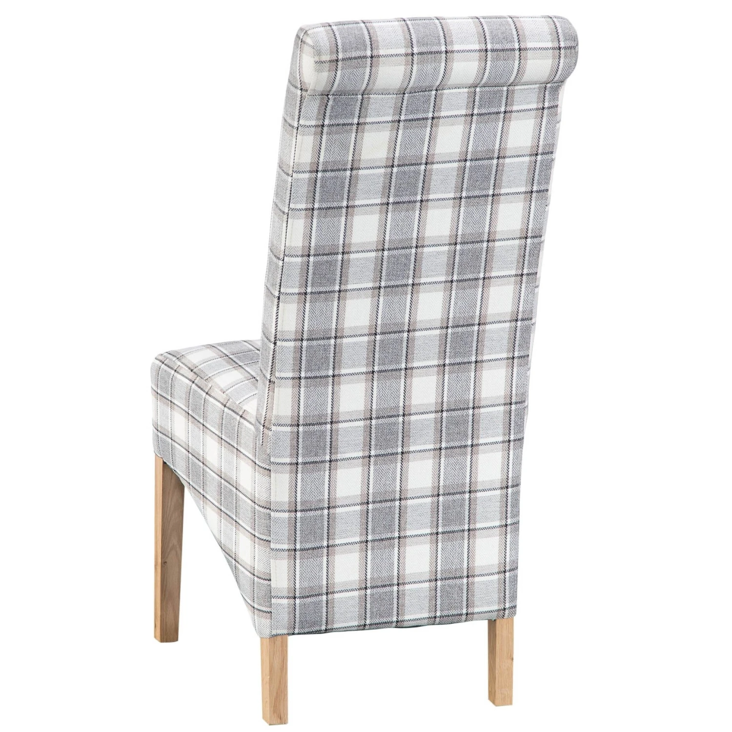The Cappuccino Check Scroll Back Chair is upholstered in a beautiful check fabric and has natural finished solid oak legs. This stunning chair is guaranteed to add some style to the home where ever it is placed. Featuring a scroll back for added elegance and a high back for extra comfort and support, this is the perfect addition to the modern home.