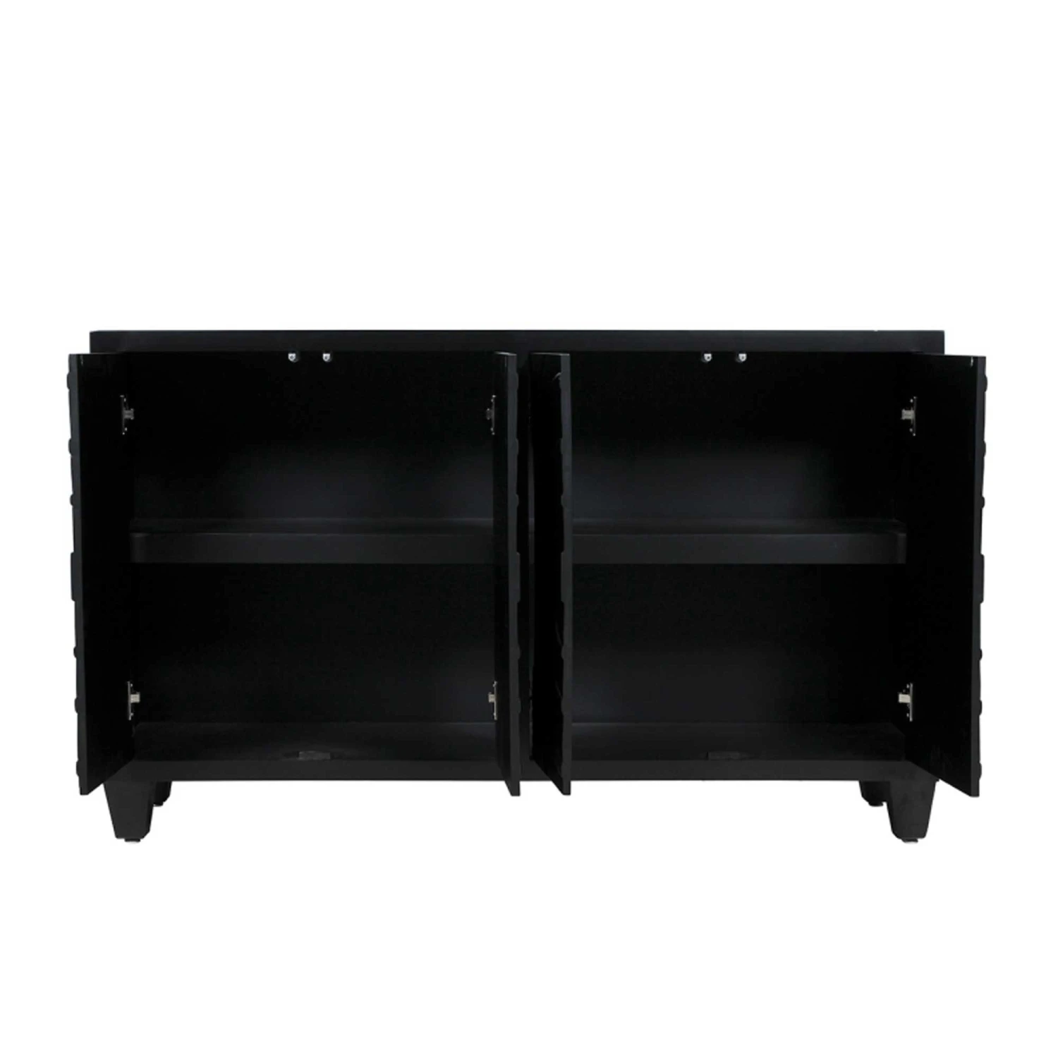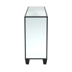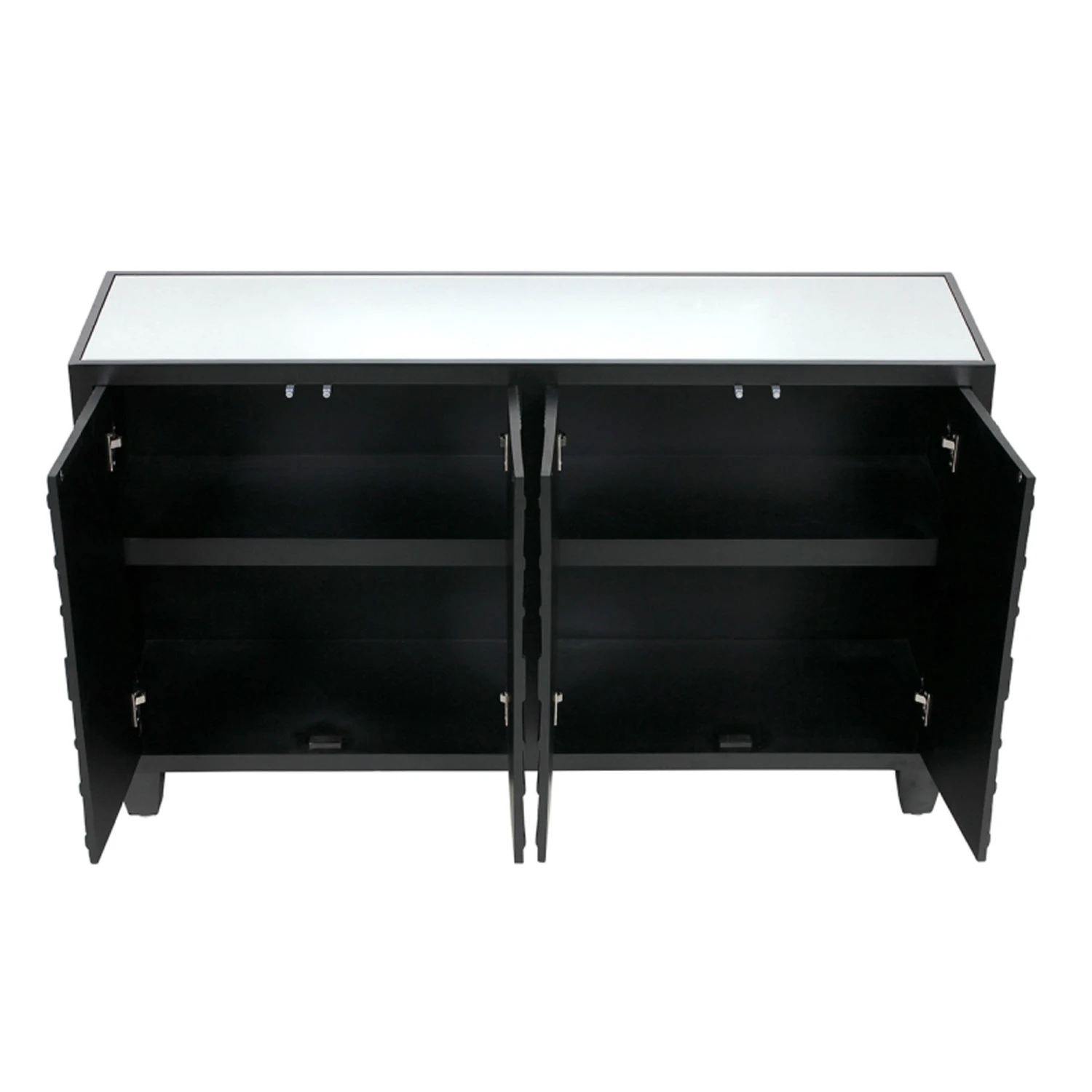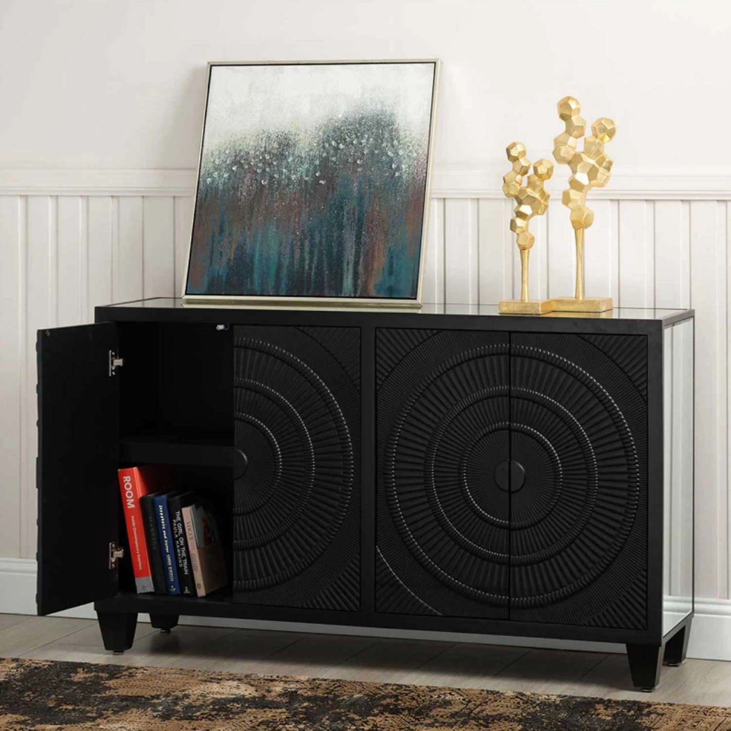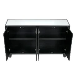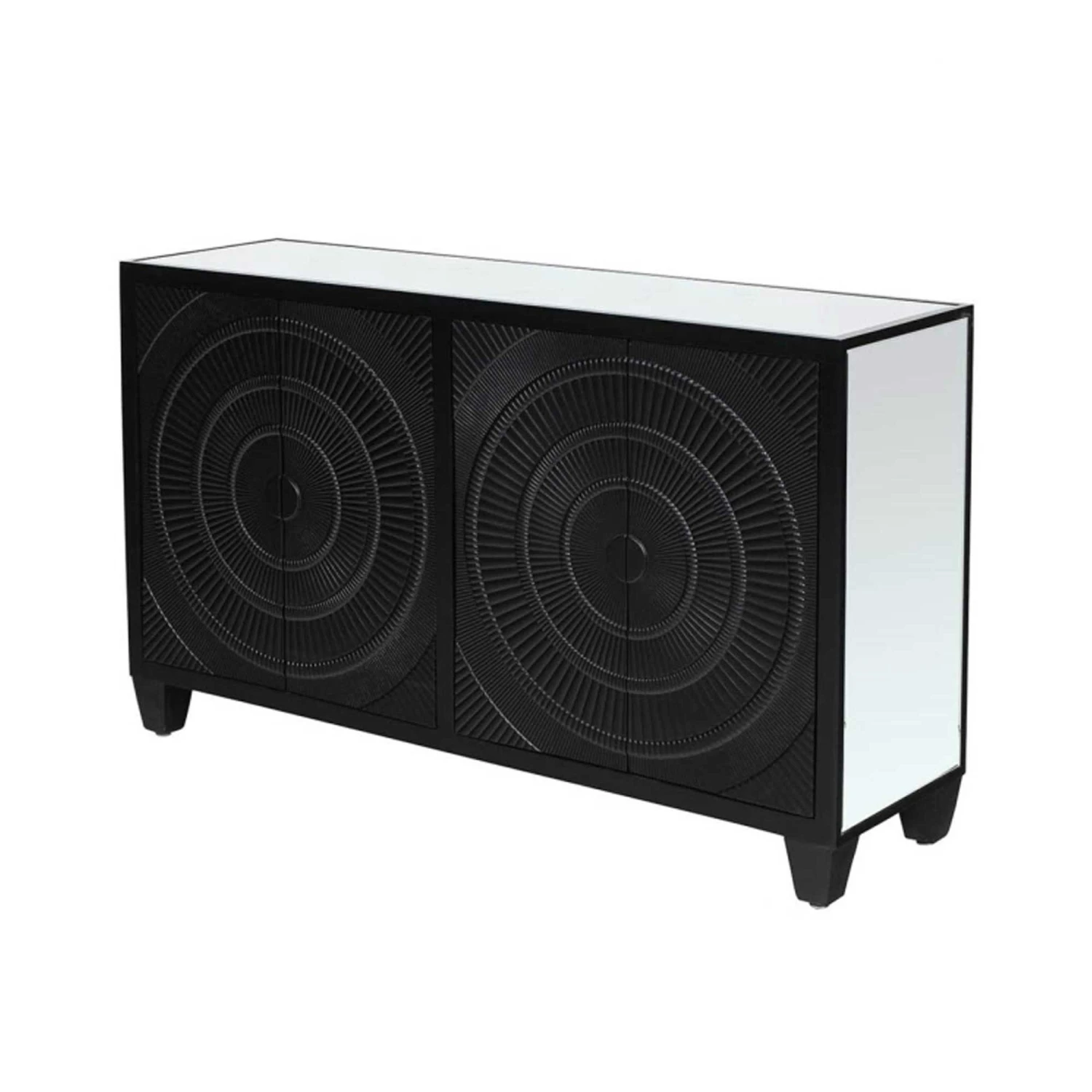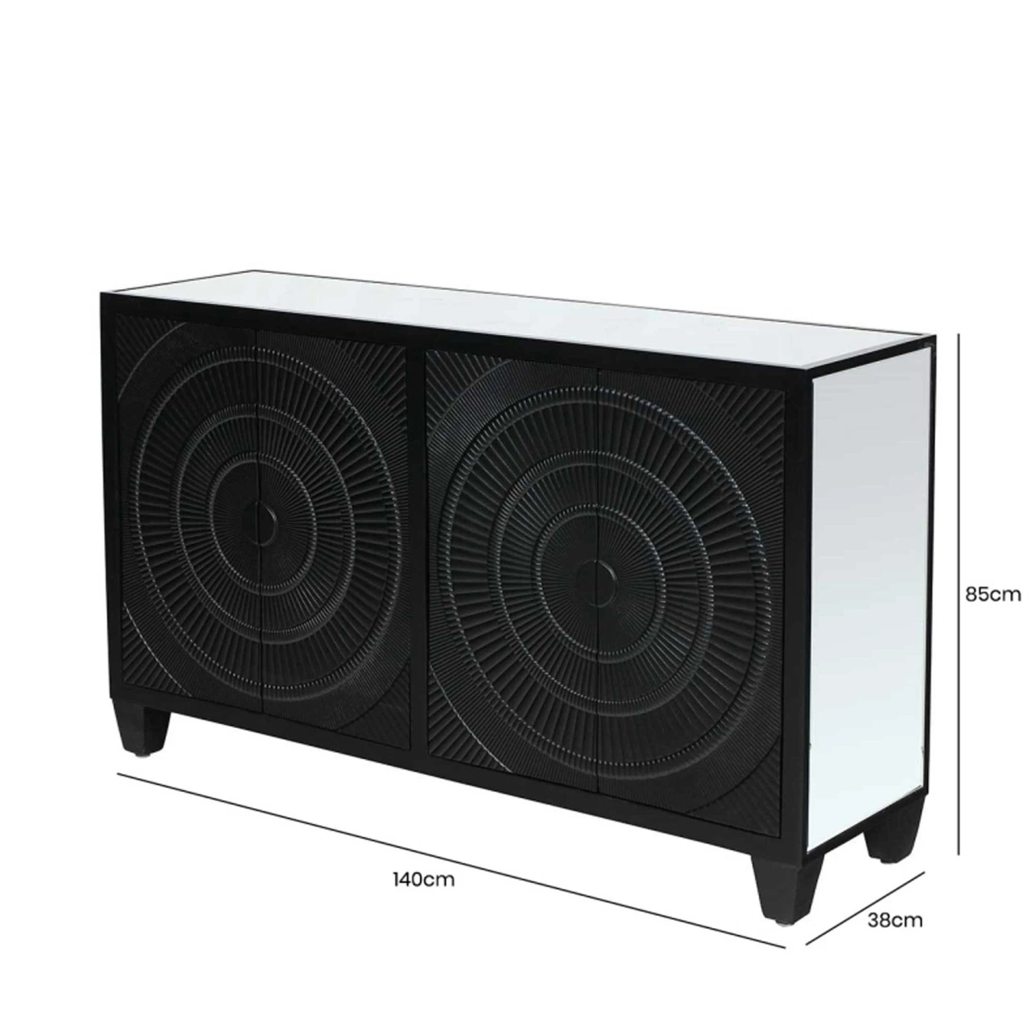 Bringing a glamorous addition to the home, the Cirque 4 Door Sideboard Black features an ornate circular pattern adding detail with a stunning black finish and mirrored top and sides. Crafted from MDF wood for a sturdy, durable build, it comes with 4 doors of storage for all your home essentials to keep them neatly tucked away ready for when you need them. Store almost anything inside, with it being perfectly suited to a kitchen, dining room or living room.