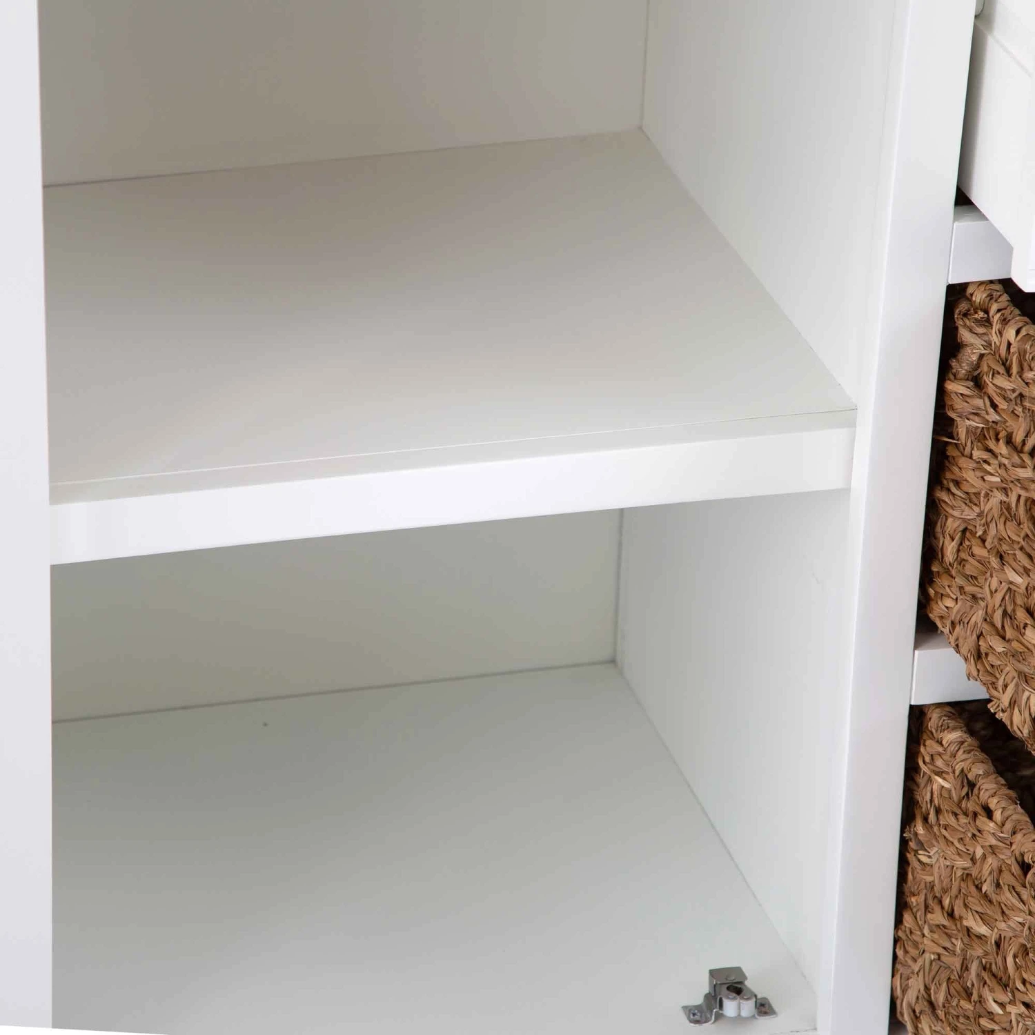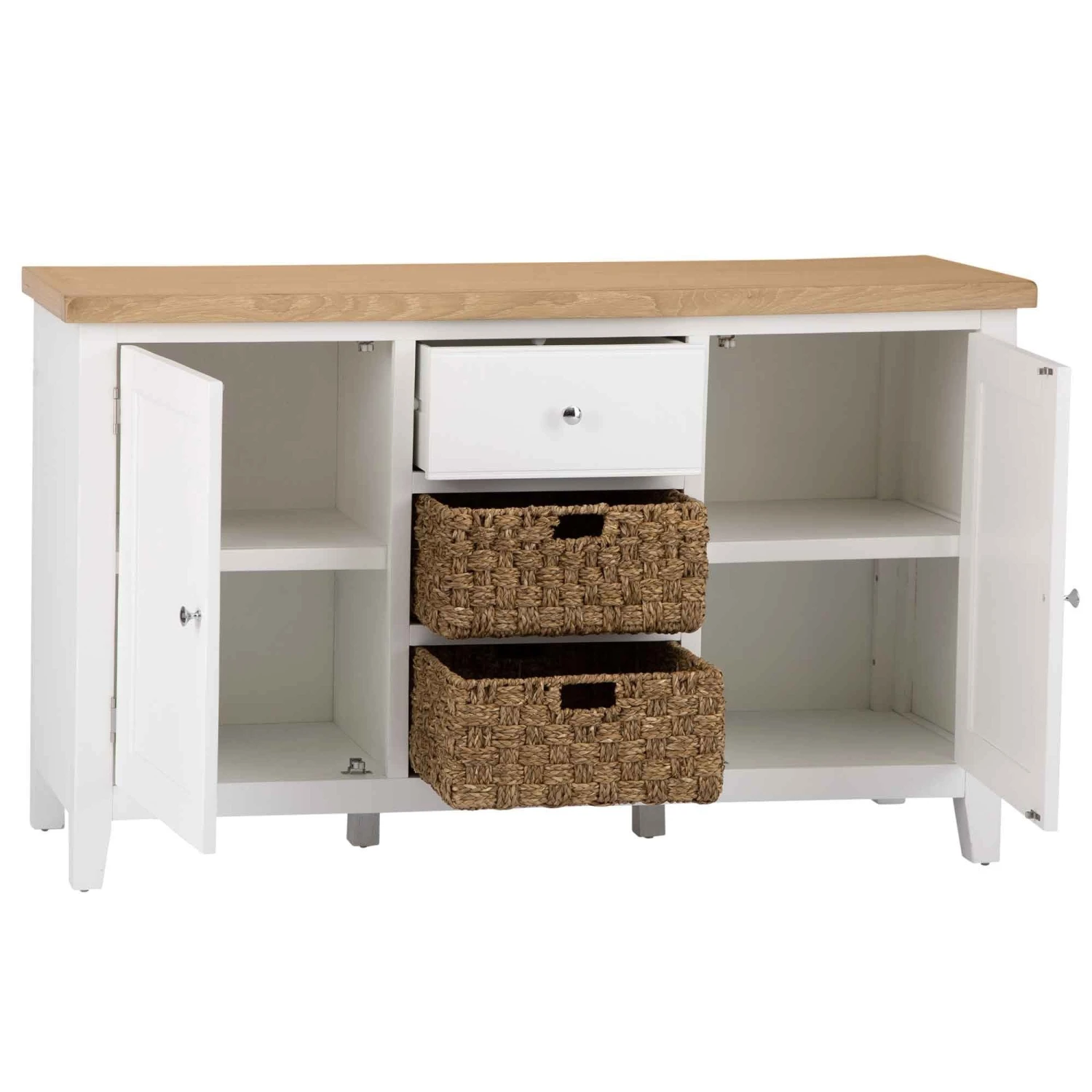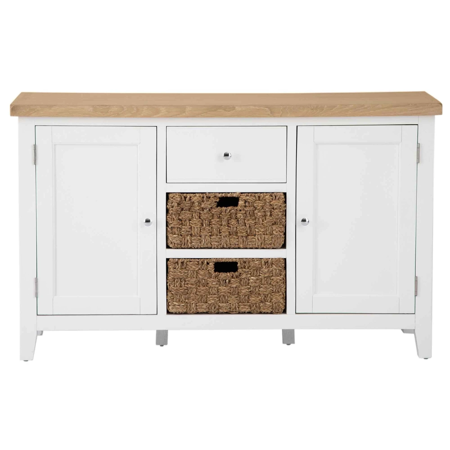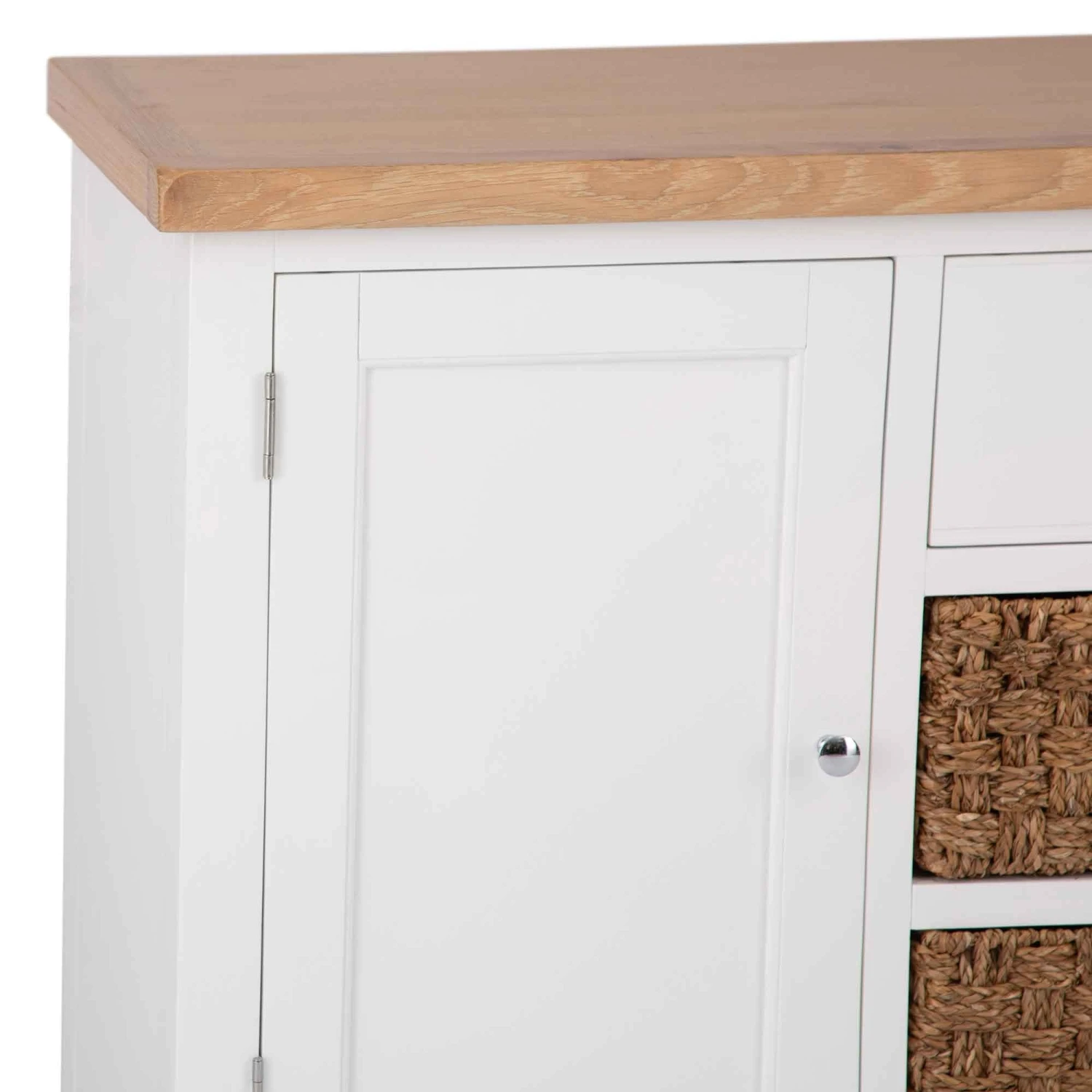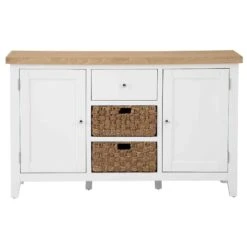 This stunning Eastbury White Large Sideboard seamlessly blends rustic warmth with a contemporary design. The sideboard comes with a white painted wood design to brighten up your dining room and is topped with a contrasting washed oak table top. The sideboard comes with storage featuring 1 small drawers in the centre with 2 brown wicker baskets below and 2 door opening cupboards with internal shelving. The drawer and doors are finished with complimenting chrome handles. The sideboard will look stunning paired with other matching items for the Eastbury White Dining Collection.