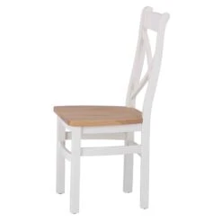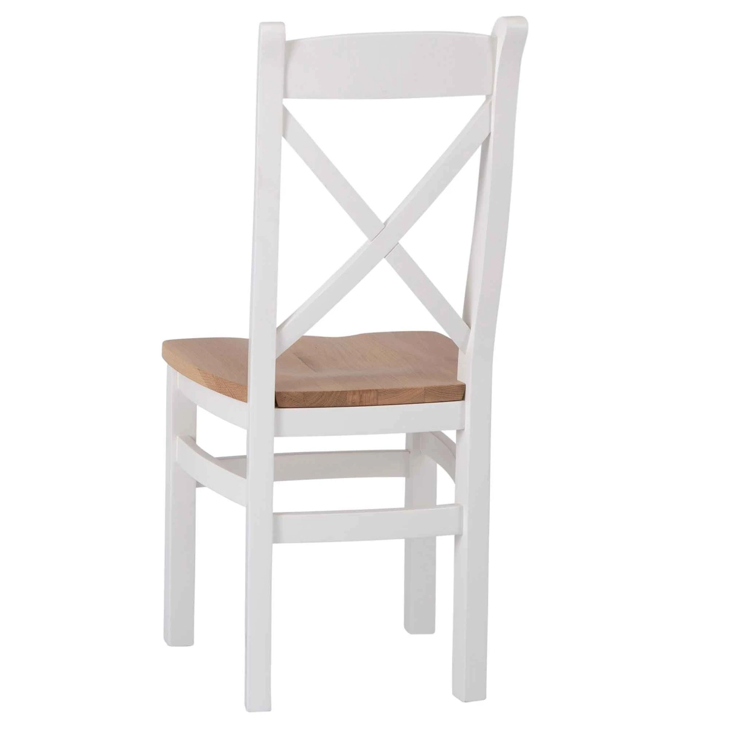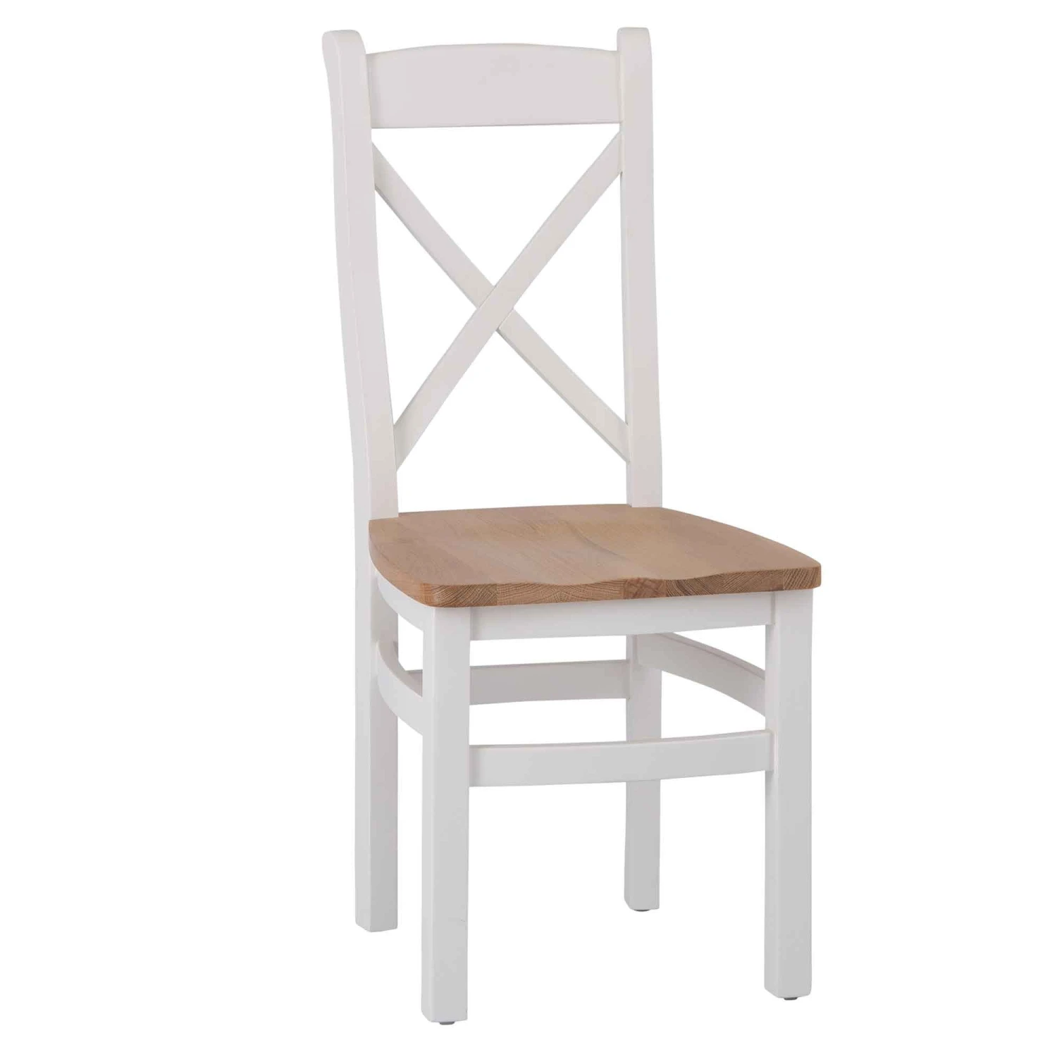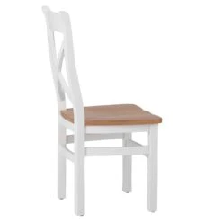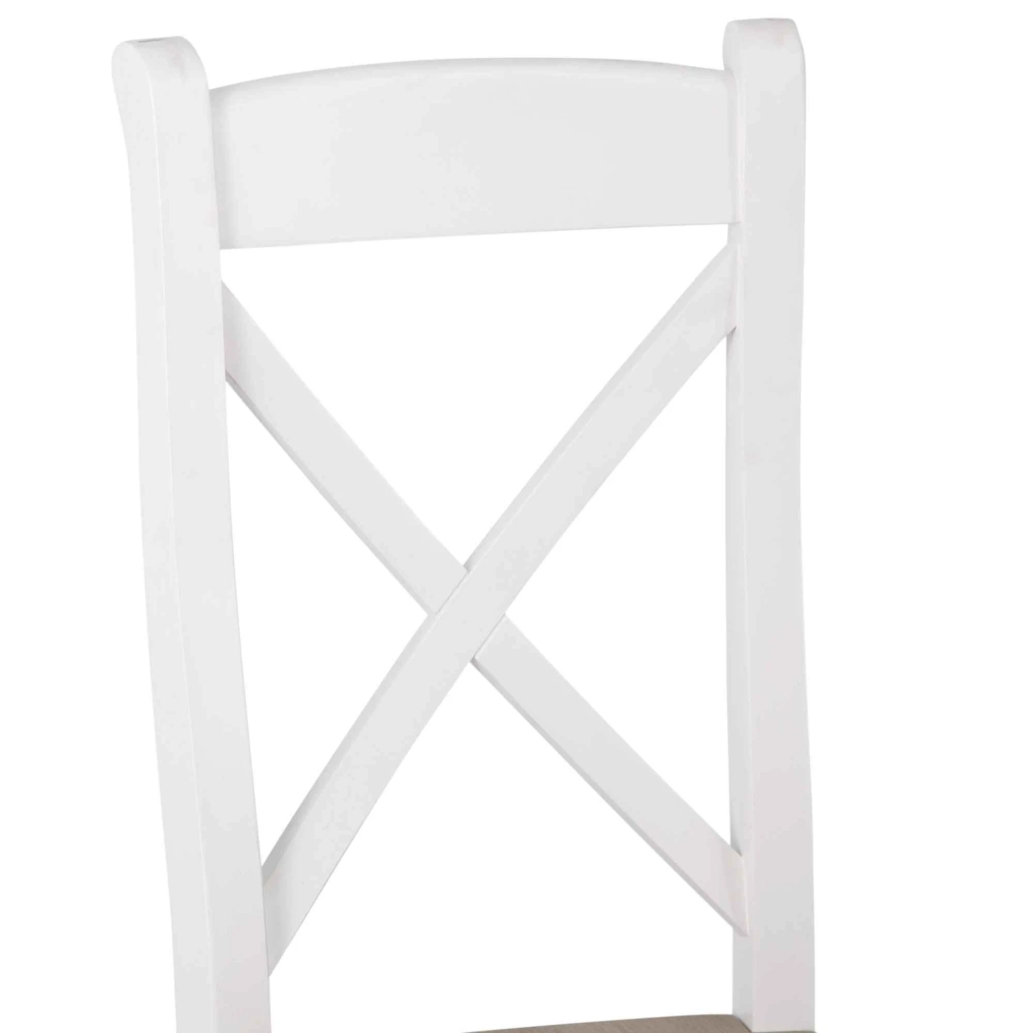 The Eastbury White Wooden Seat Crossback Dining Chair seamlessly blends rustic warmth with contemporary design. The base of the chair comes in a stunning bright white painted wood design with cross back pattern, the high back rest adds extra support. The seat is made of a contrasting washed oak in a shaped design for extra comfort. Display with a matching dining table from the Eastbury White Dining Collection, as well as other items from the range for a uniform dining room..