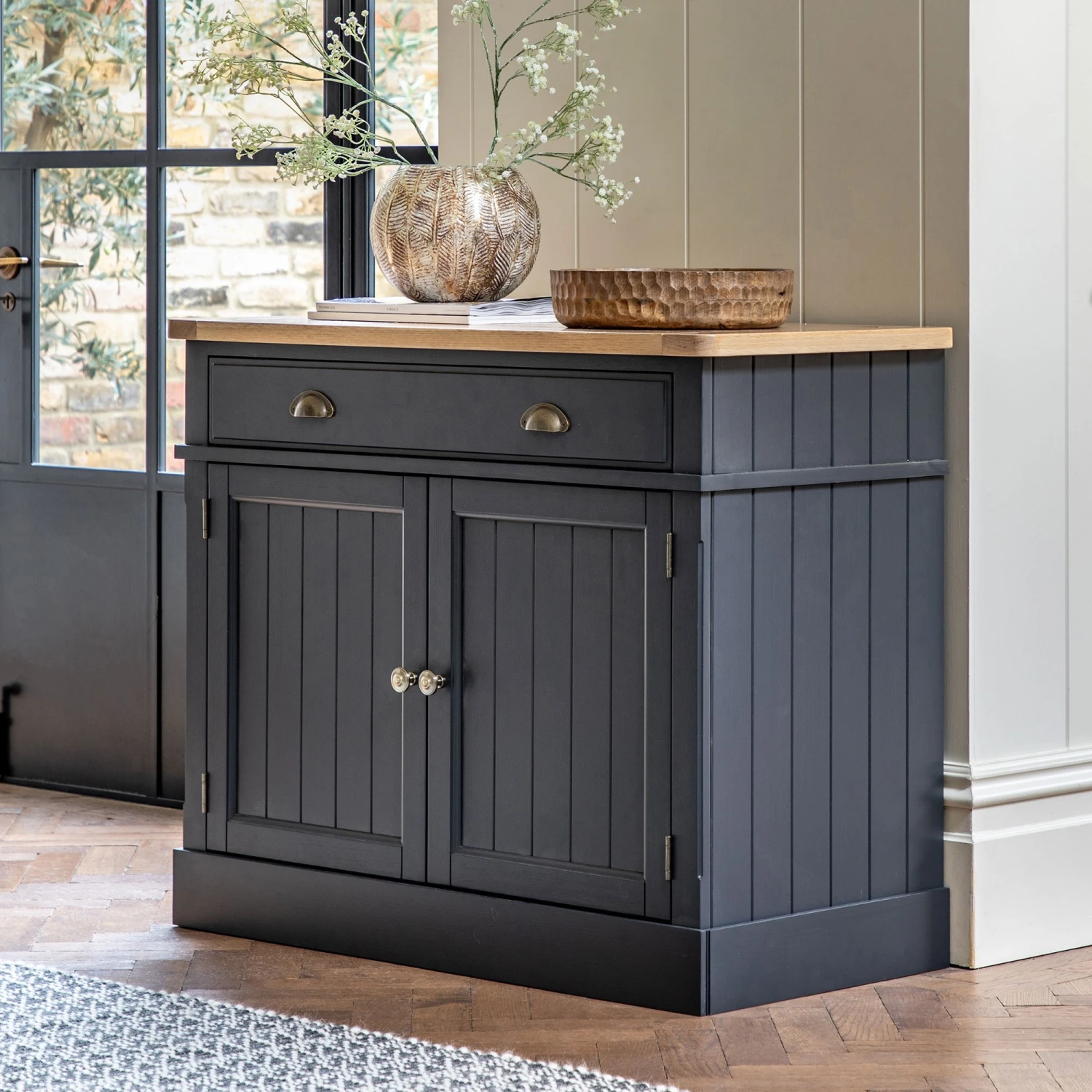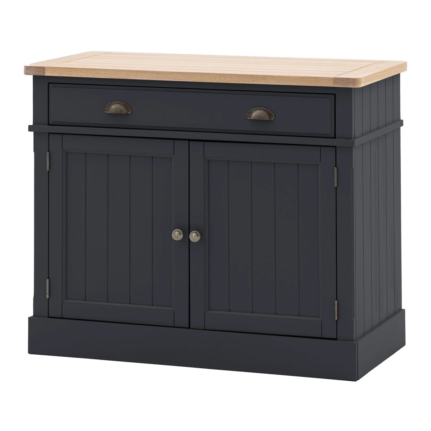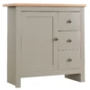 The perfect addition to a country style kitchen or dining room with this rustic looking Eton Meteor 2 Door Sideboard 96 x 45 x 80 cm. The sideboard comes in a stunning meteor grey tone with a grooved and planked oak top. Offering plenty of storage the sideboard features a large drawer to the top and 2 door cupboard underneath with adjustable shelving. The door feature a grooved design and finished with traditional metal handles.