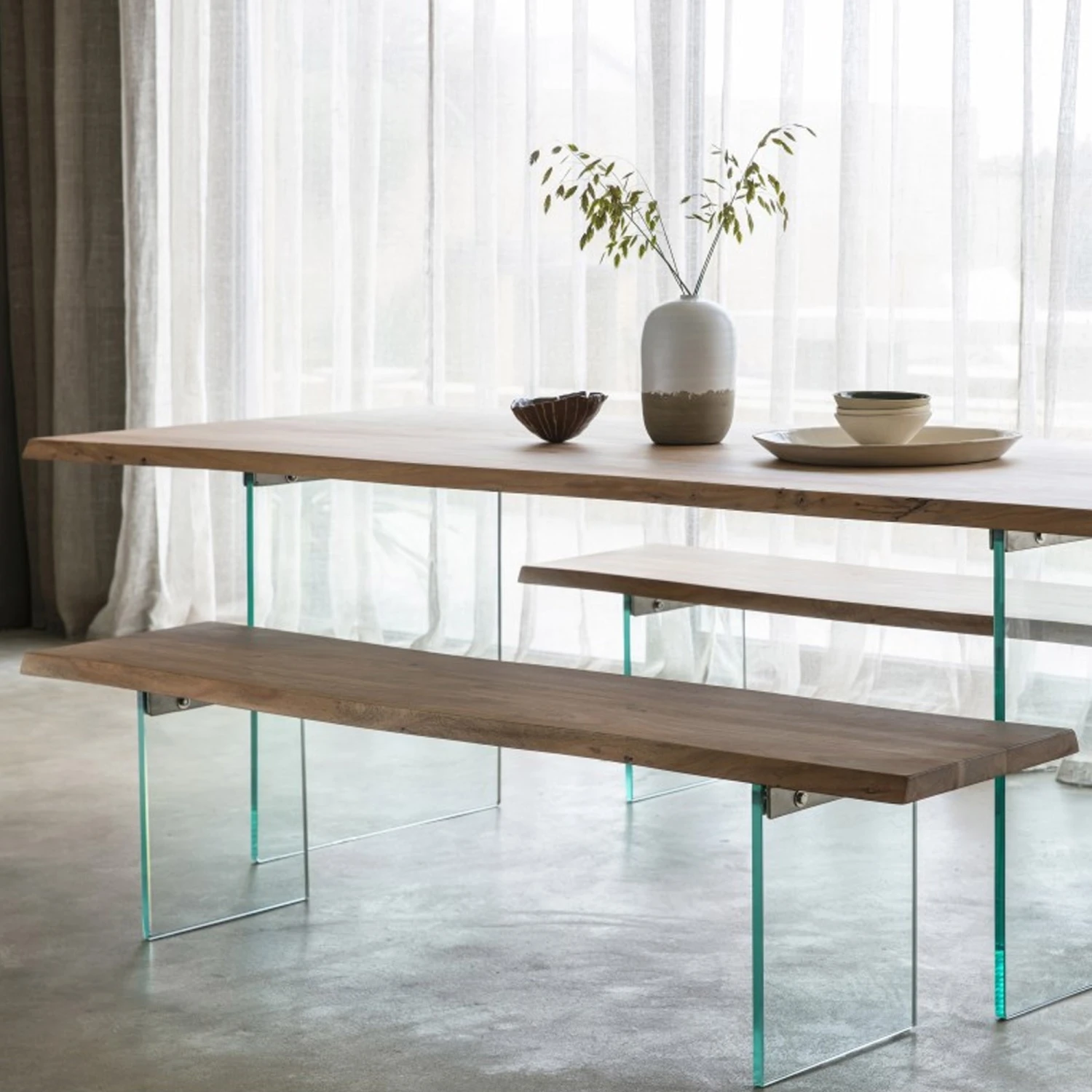 Introducing to you the Ferndale Dining Bench, This beautiful dining bench is crafted from a high quality wooden seat with stylish contrasting glass legs, the unique combination of materials creates a striking focal point in the home. Perfect for creating a modern look and showcasing your eye for style.