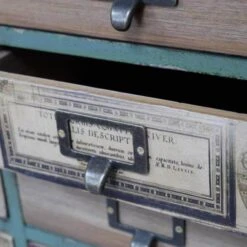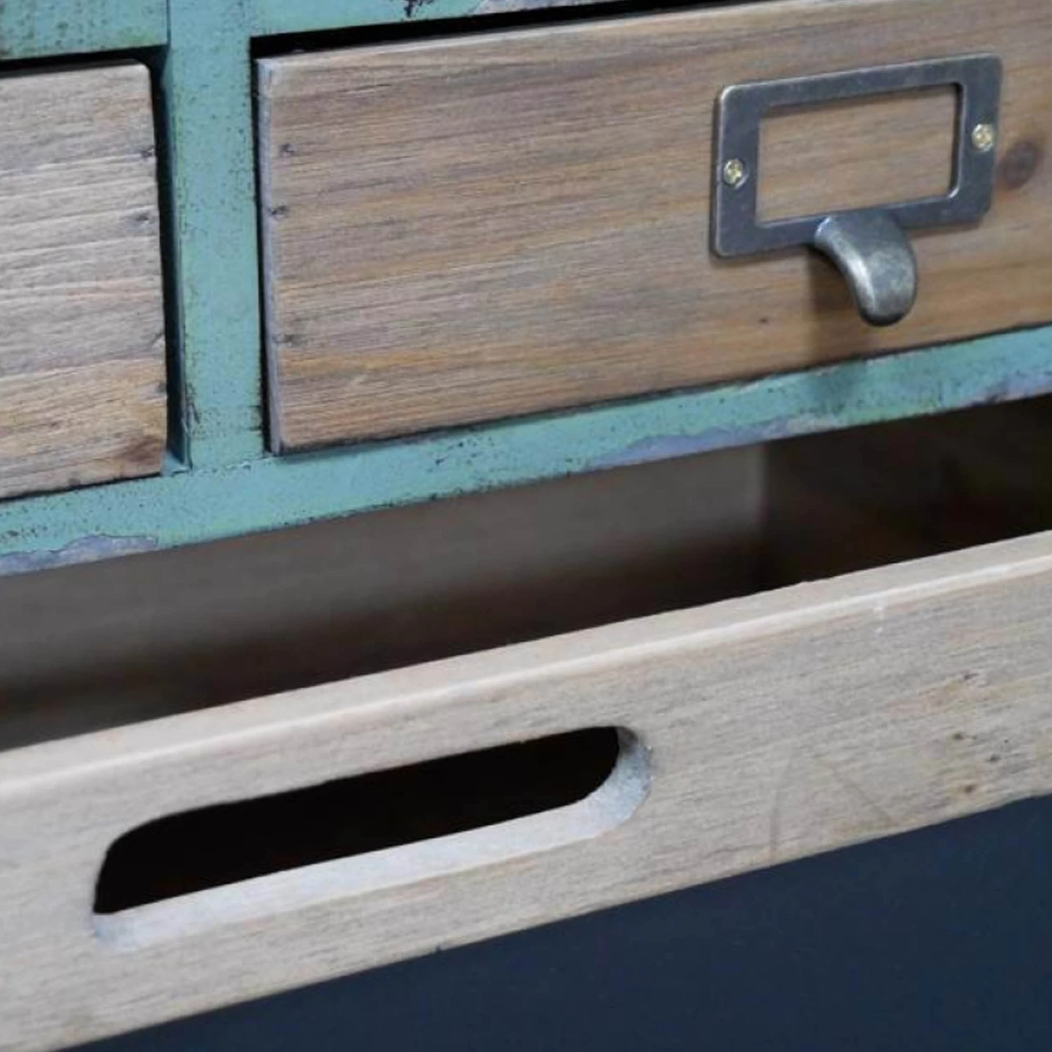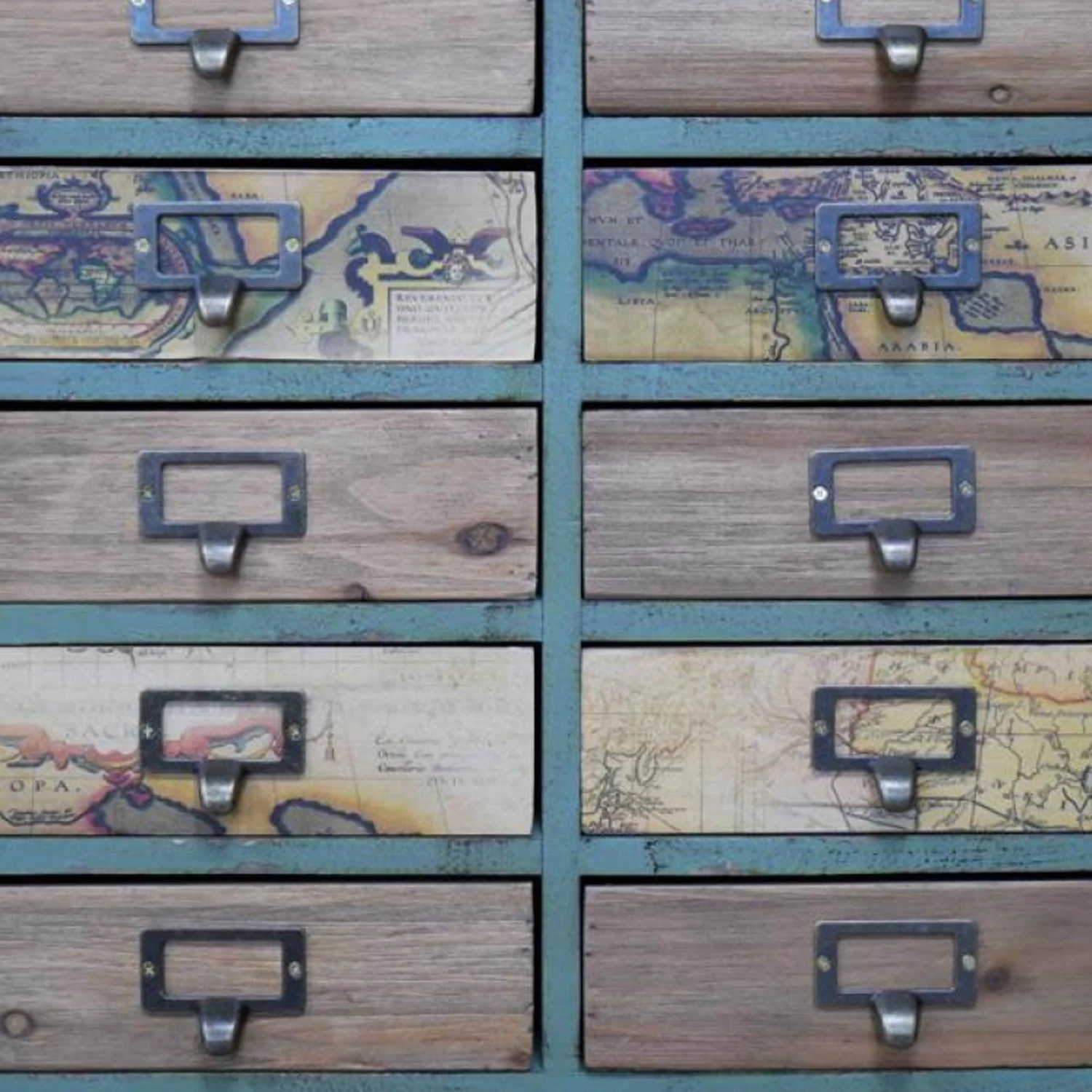 We are proud to introduce the latest addition to our industrial range with this storage cabinet. Home to seventeen different sizes of drawers, this piece is practical as well as stylish. The distressed green, fir wood and map print will add a splash of colour to any room.