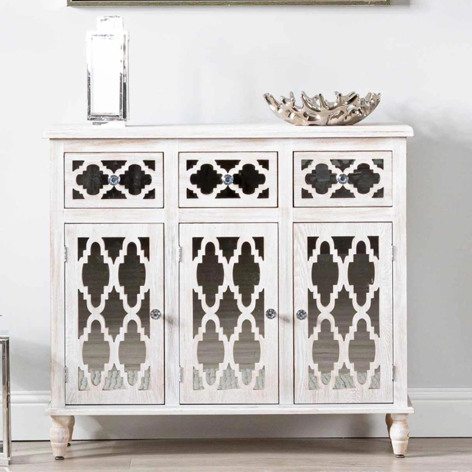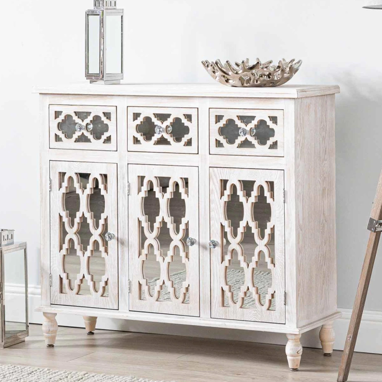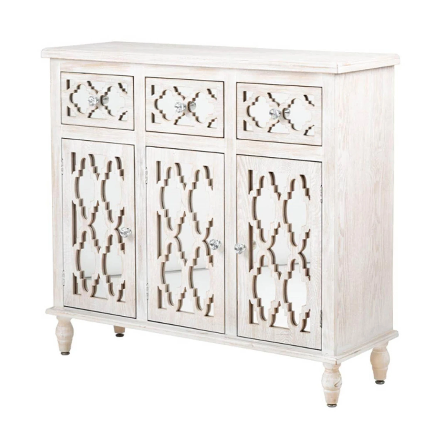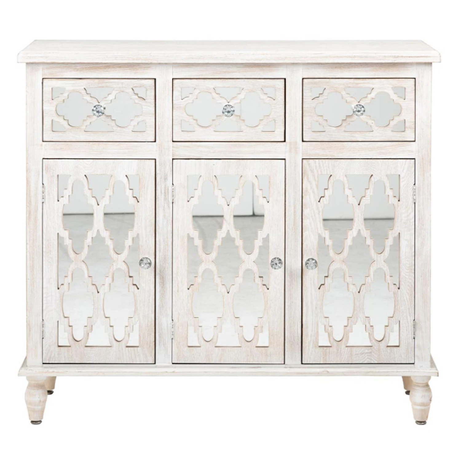 Introducing the newest addition to our antique French style furniture range, straight from the Hampton Beach range, this beautiful 3 drawers, 3 door sideboard features a detailed wooden pattern with a mirror design overlaid with intricate fretwork detailing. Complete with lovely crystal handles, this is a perfect addition to add to your home. The Hampton Beach 3 Drawer And 3 Door Cabinet takes inspiration from the understated elegance of New England beach homes, featuring a stunning washed ash effect finish.