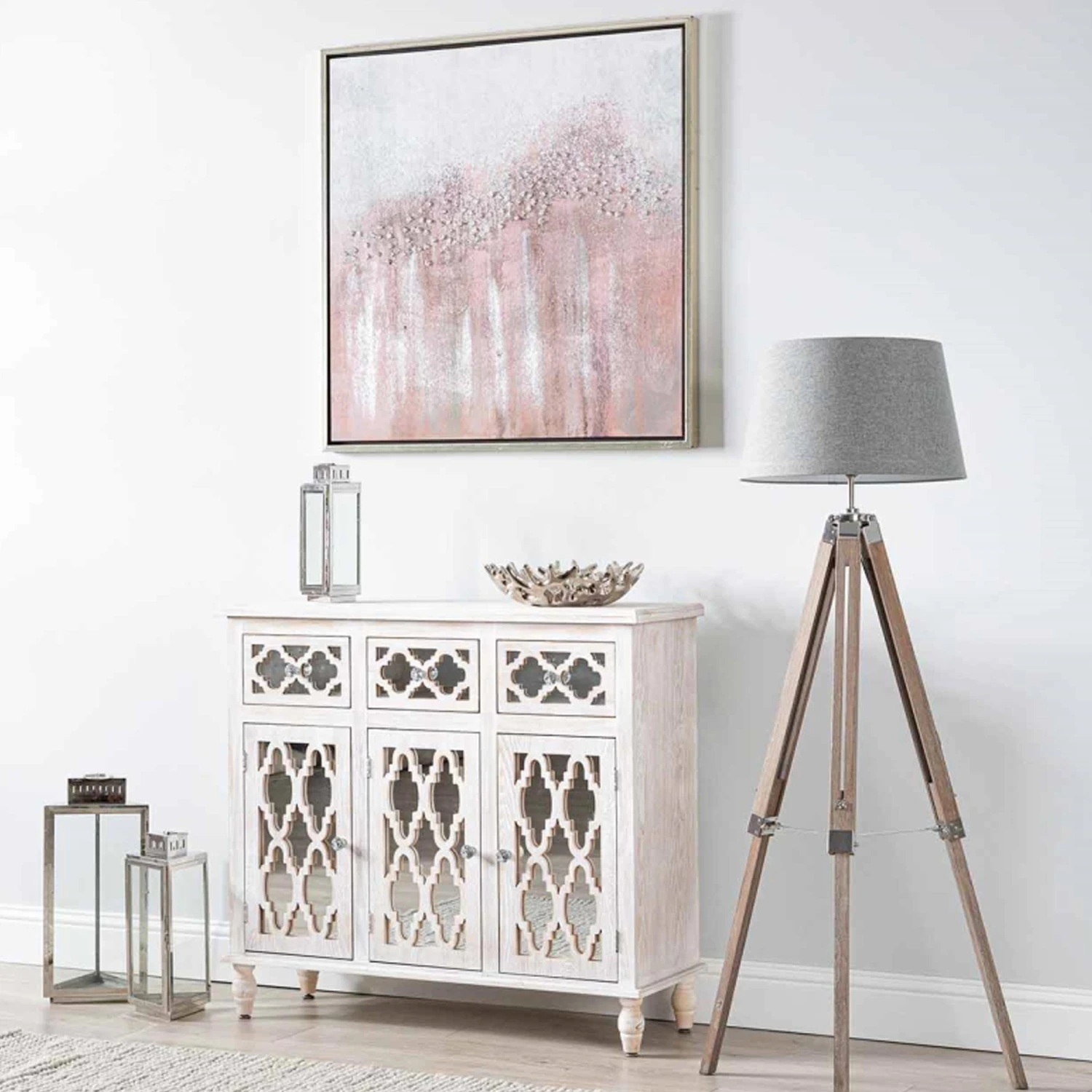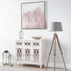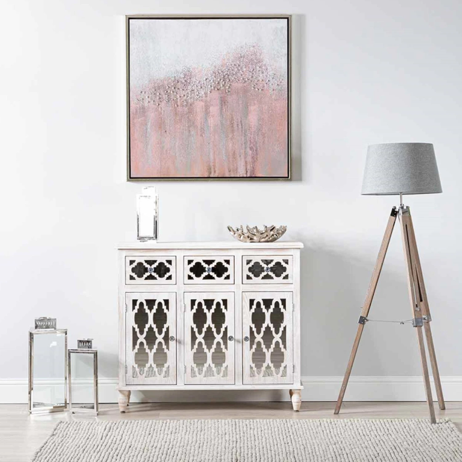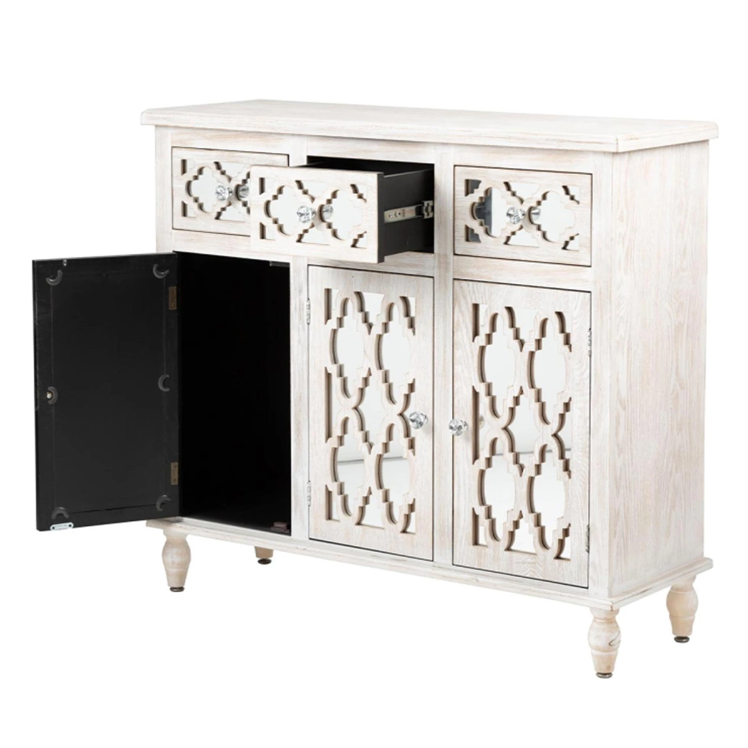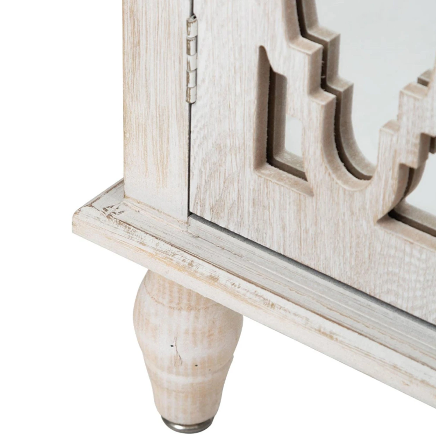 Introducing the newest addition to our antique French style furniture range, straight from the Hampton Beach range, this beautiful 3 drawers, 3 door sideboard features a detailed wooden pattern with a mirror design overlaid with intricate fretwork detailing. Complete with lovely crystal handles, this is a perfect addition to add to your home. The Hampton Beach 3 Drawer And 3 Door Cabinet takes inspiration from the understated elegance of New England beach homes, featuring a stunning washed ash effect finish.