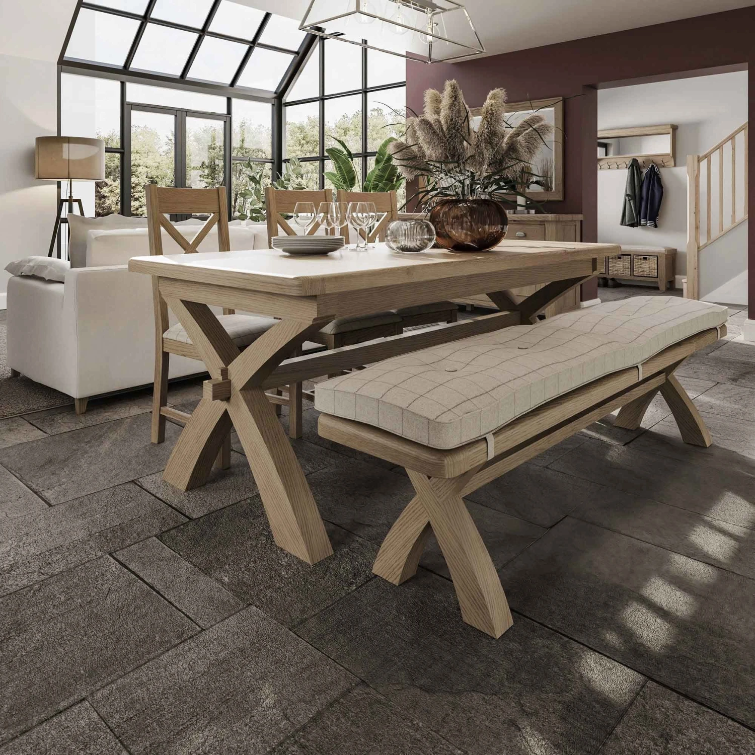 This Hampton Oak 2.0m Cross Legged Fixed Table is part of the Hampton Oak Dining Collection and will match any of the dining chairs and benches from the same range. The beautiful rectangular dining table seats up to 6 people comfortably has a unique rustic oak look.