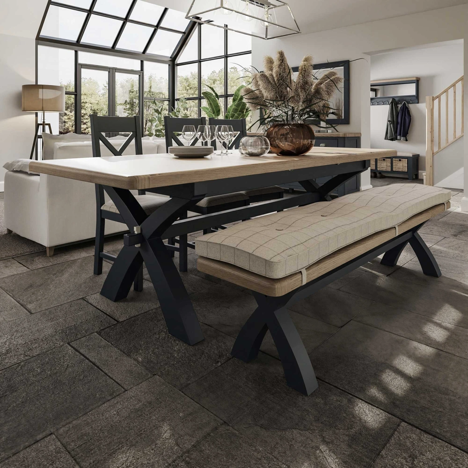 This Hopton Blue 2m Cross Leg Dining Table is ideal for large families or homes that host a lot of parties! Seating up to 8 people, this dining table features a stunning cross leg design and is finished in modern blue for a rich and classical look. The rectangle dining table is topped with a high quality thick oak top that is easy to clean. Matching items available.