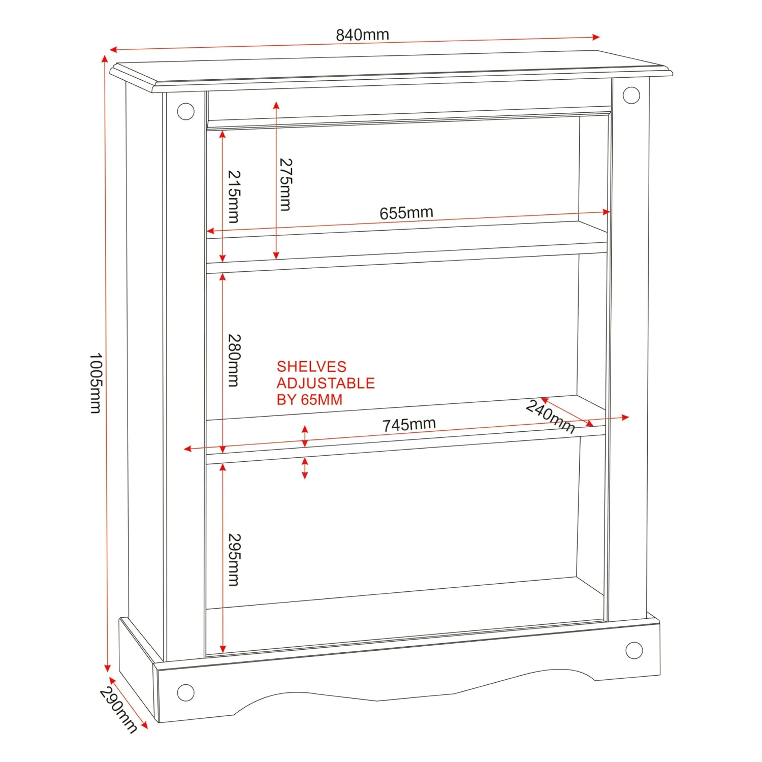 Made from Distressed Waxed Pine, this Huxley Pine Low Bookcase has 3 shelves storage space. Just over 1 metre in height, the Huxley Pine Low Bookcase is suitable for nurseries and children’s rooms. Metal studded design. Also available in White.