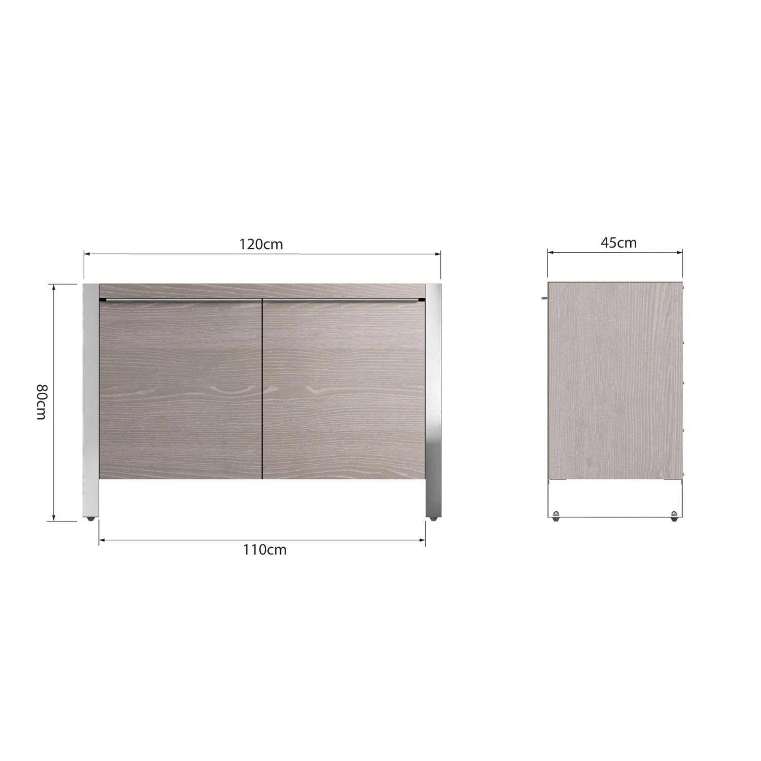The stunning Idenhoe Dining Standard Sideboard will add a sophisticated and contemporary design to your living or dining room. The sideboard features a beautiful silver oak frame with 2 doors to the front and 4 internal shelves giving you plenty of storage. The sideboard stands on complimenting metallic chrome u shaped legs with non-scratch feet to protect your flooring. Display this stunning sideboard with matching items from the Idenhoe Dining Collection for an elegant and glam look.