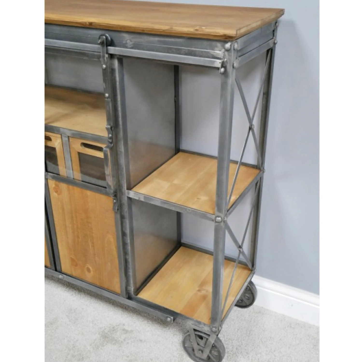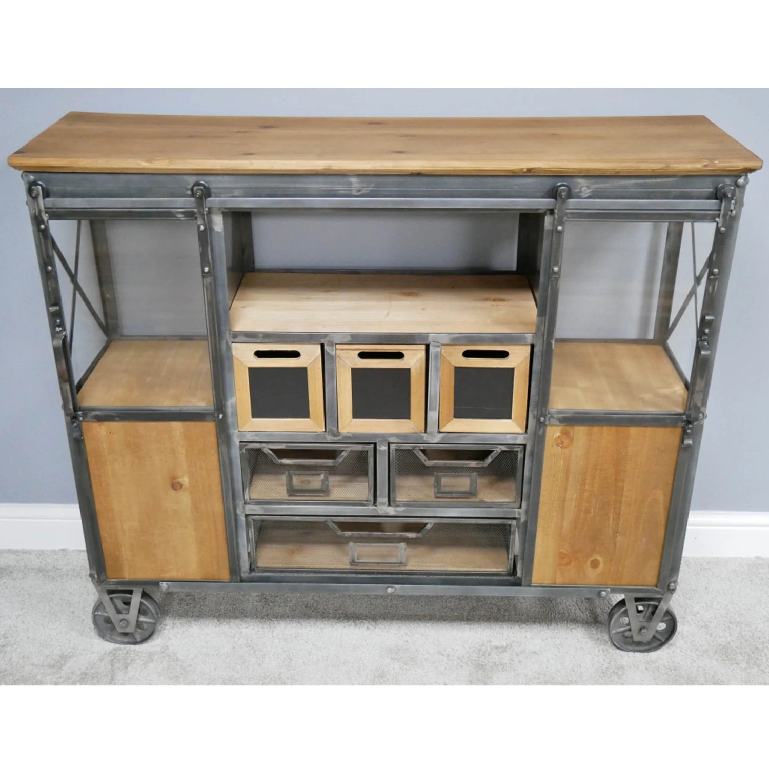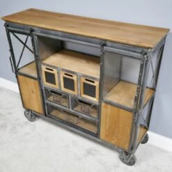 Our Industrial Cabinet is the latest addition to our Industrial range. Crafted from metal and wood this impressive cabinet showcases various open shelf spaces, drawers and cupboards providing closed storage to become a practical piece to have around the home whilst providing a real style statement.