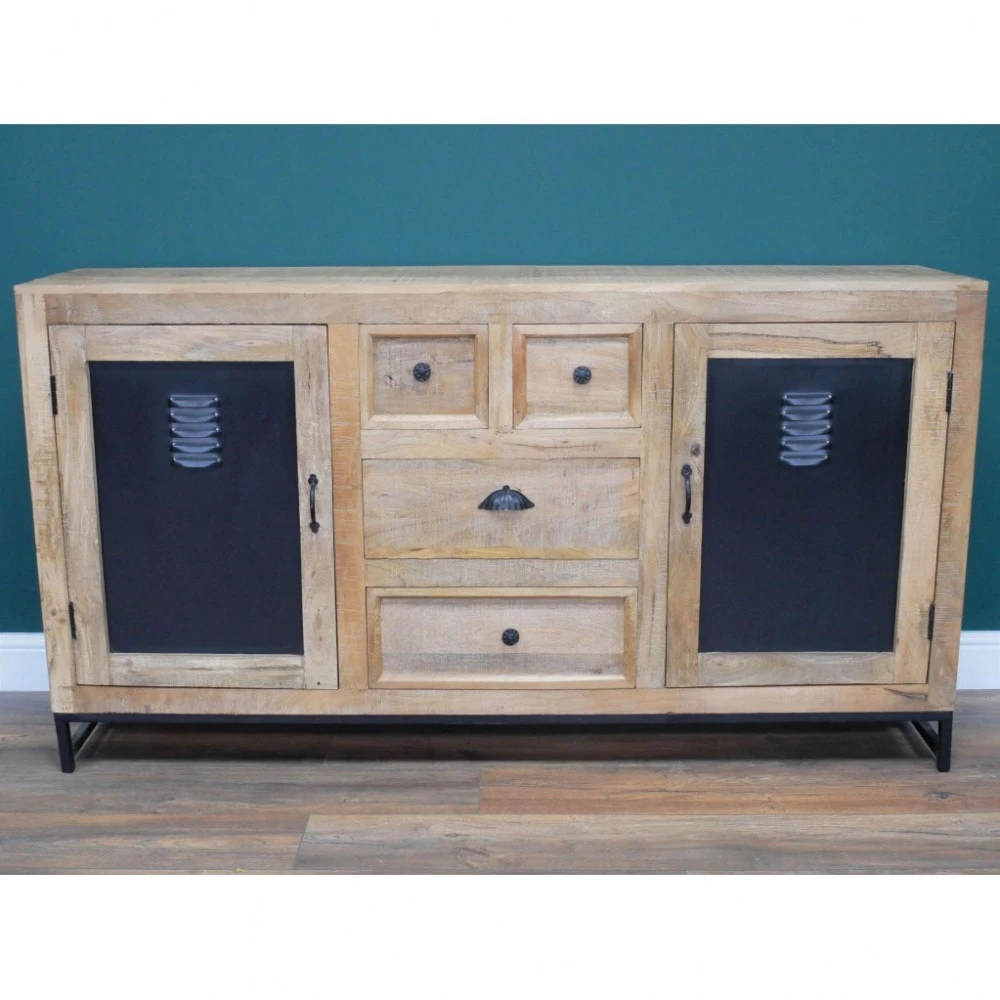 Crafted with mango wood these Industrial Mango Wood Sideboard are trimmed with iron handles and door inserts for an industrial feel. The sideboard features plenty of storage with 4 drawers down the centre and 2 cupboards at each end, the cupboard have a shelf inside as well. At this stylish design to your lining room or dining room to showcase your ornament and plants.