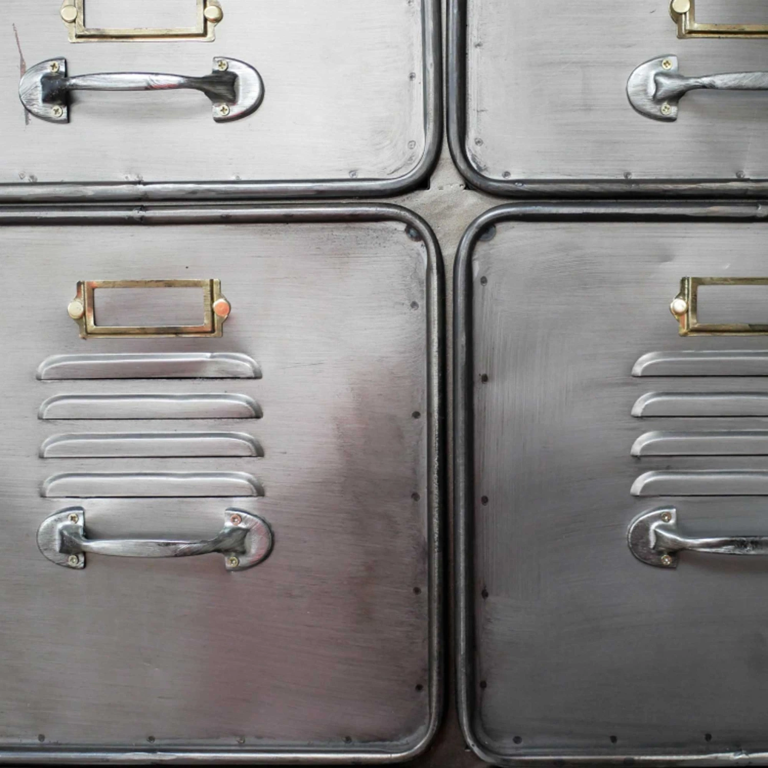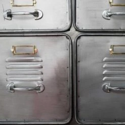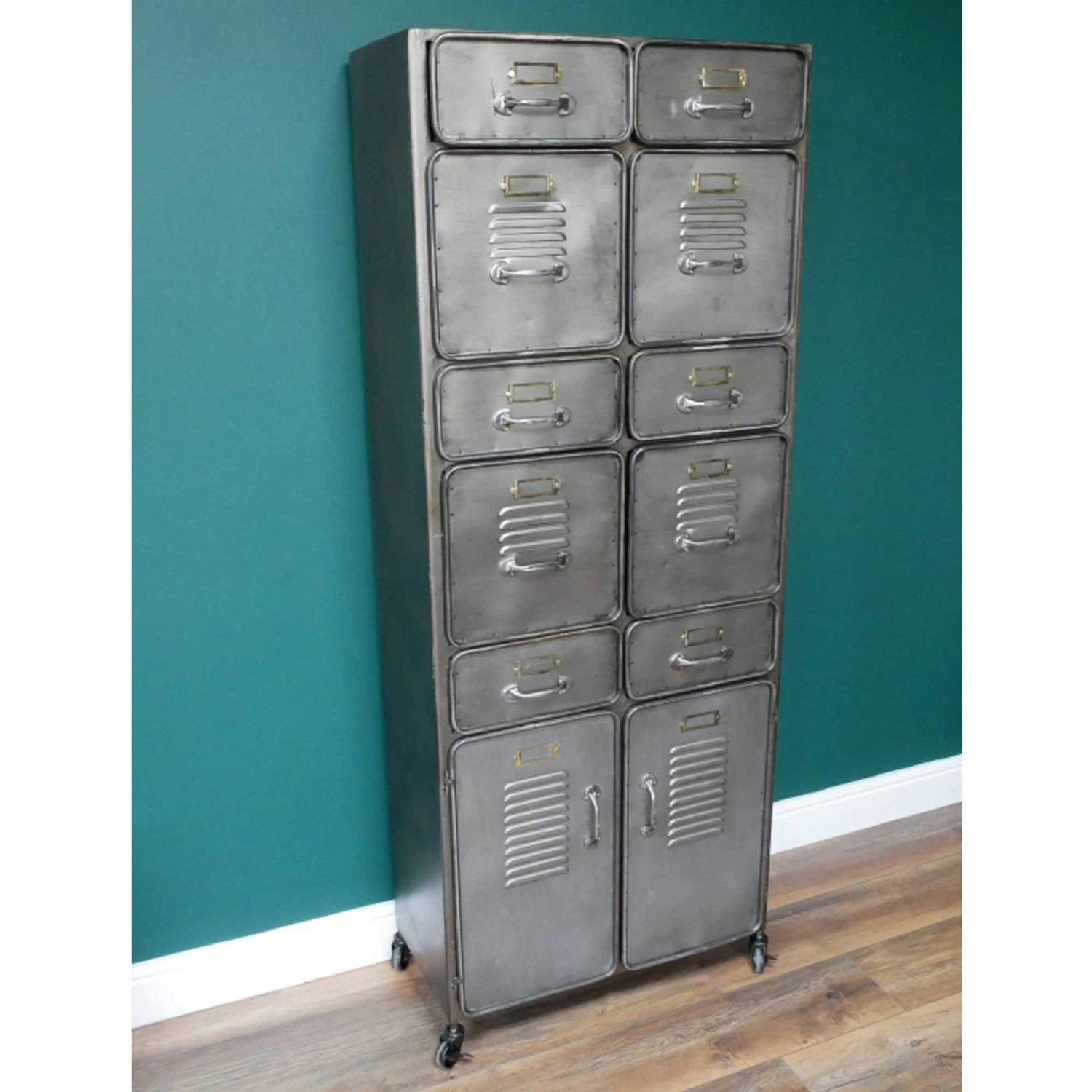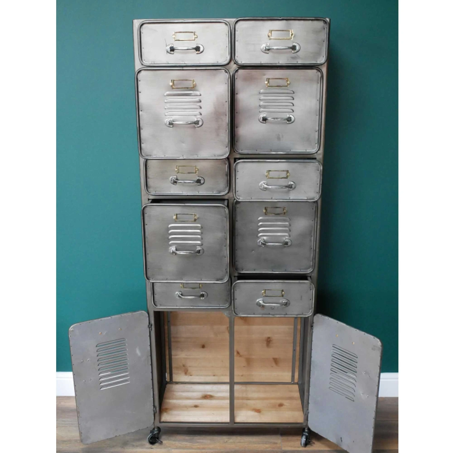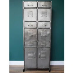 This Industrial Metal Cabinet on Wheels features a multi-drawer design allowing you to store many items in different compartments. Providing 10 drawers in various sizes, this 2 door metal cabinet is suitable for the dining room or living room. Complete with 4 wheels for easy transportation.