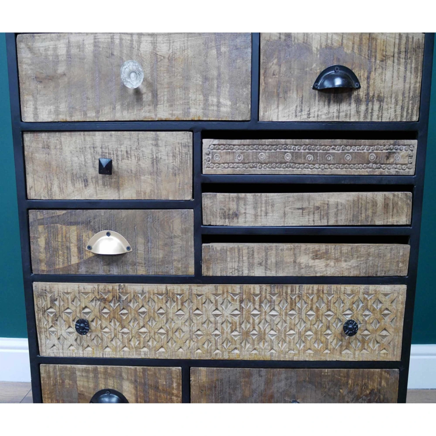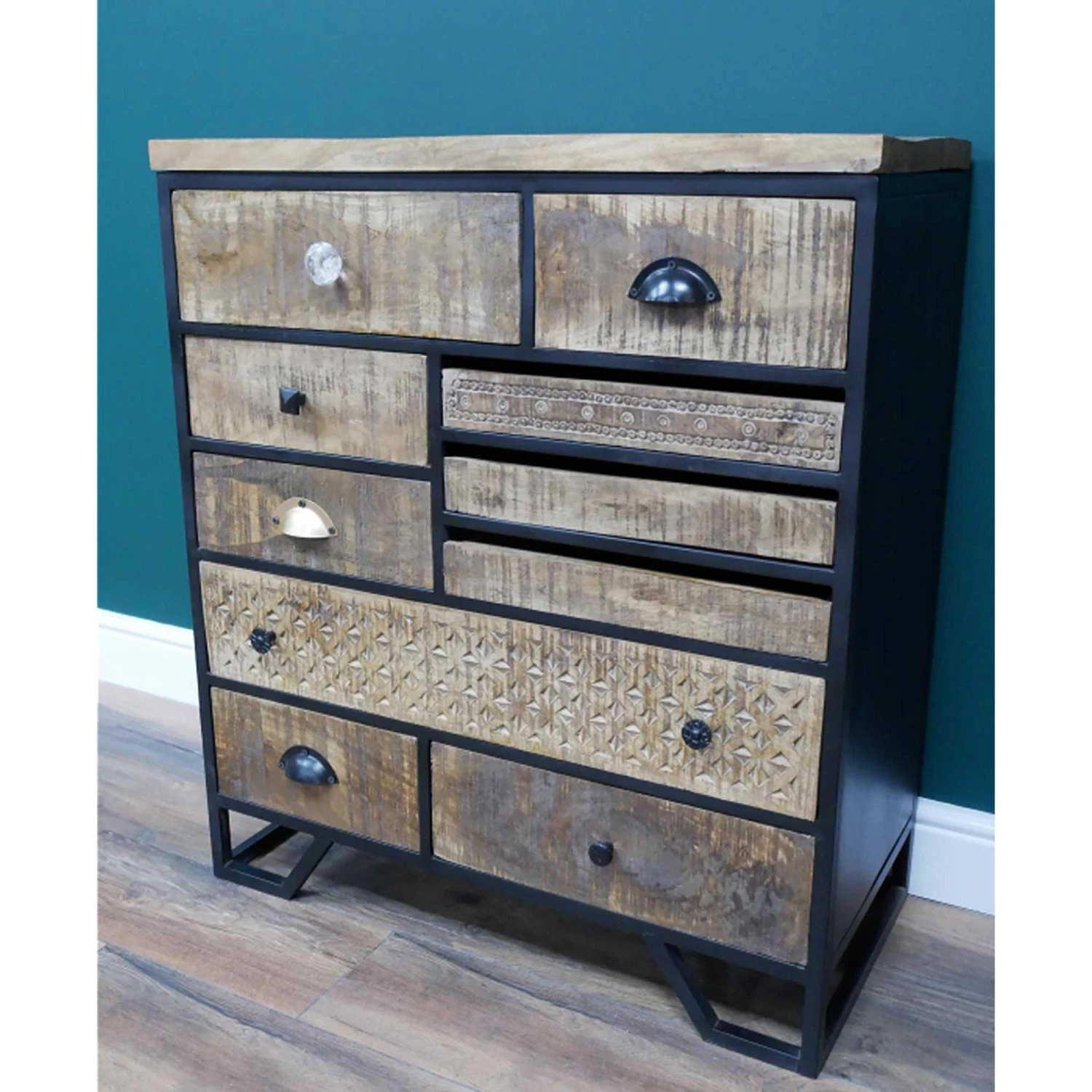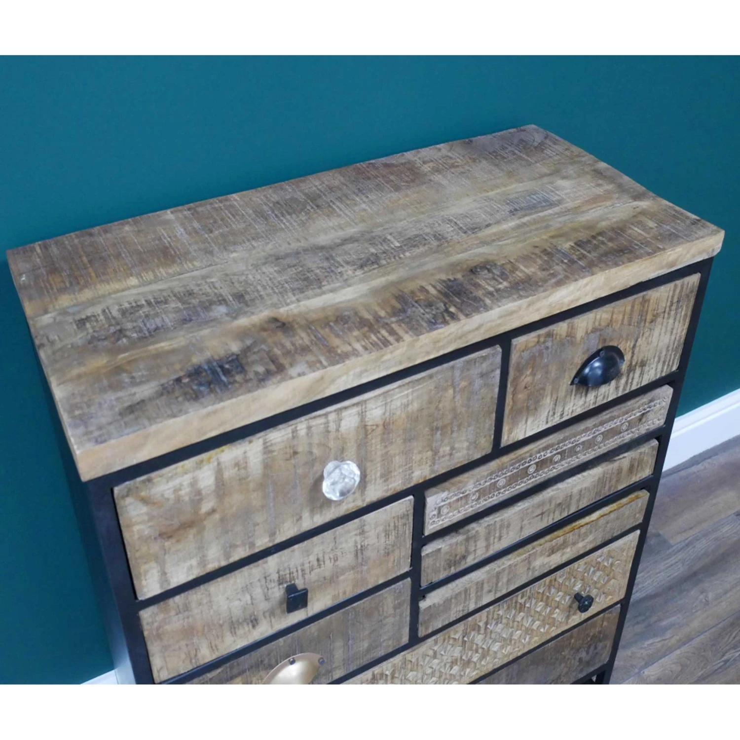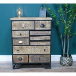 An excellent choice for creating additional storage space in the home, this Industrial Multi Drawer Cabinet is ideal for those wanting a retro, industrial style of decor in their home. Crafted from beautiful mango wood and metal, it’s solidly built to be long-lasting and has a multi-handle design to add to its retro styling. With multiple drawers for storage space in a variety of sizes, there’s room for all types of household items. Ideal for tidying up the home and making it feel more organised!