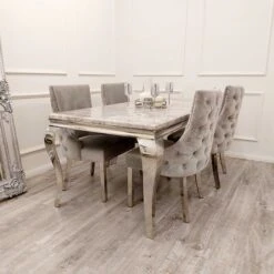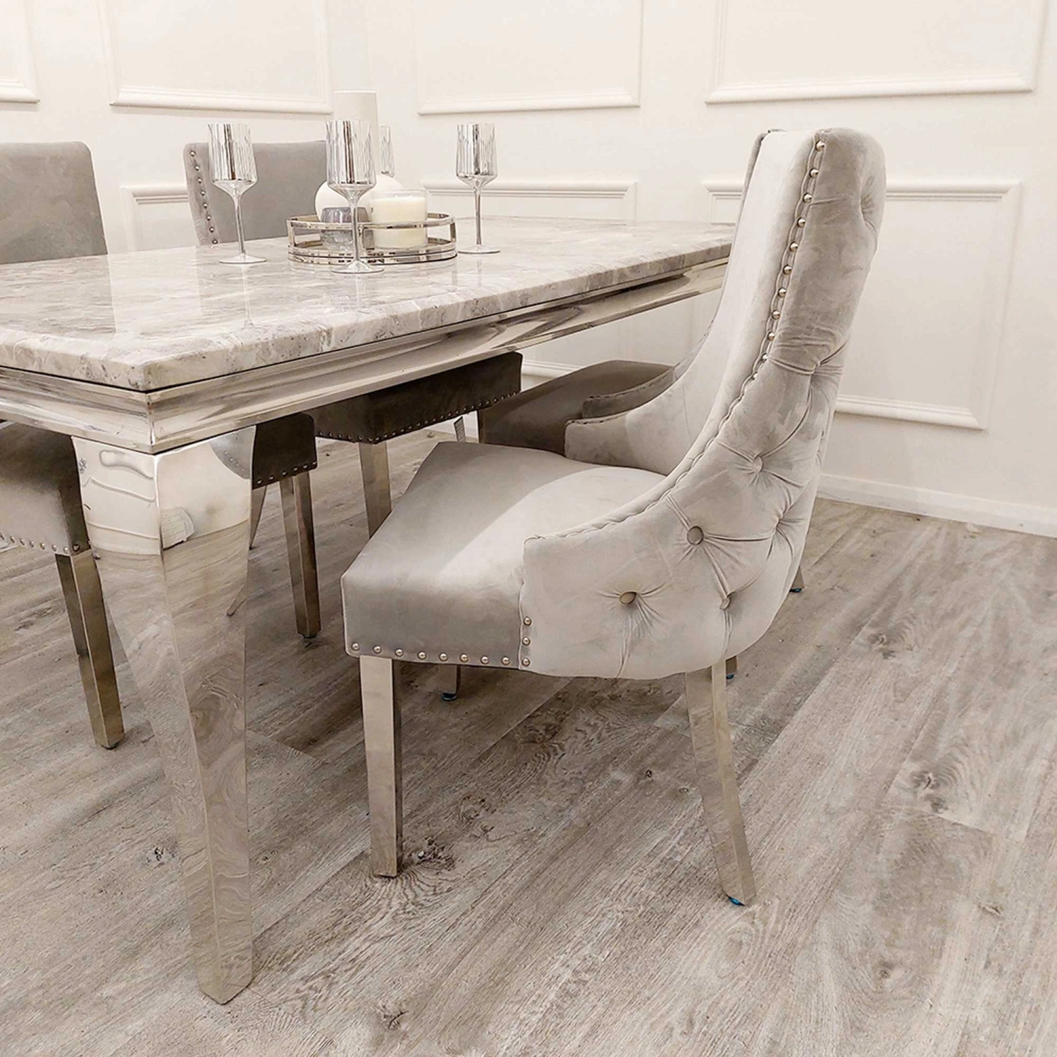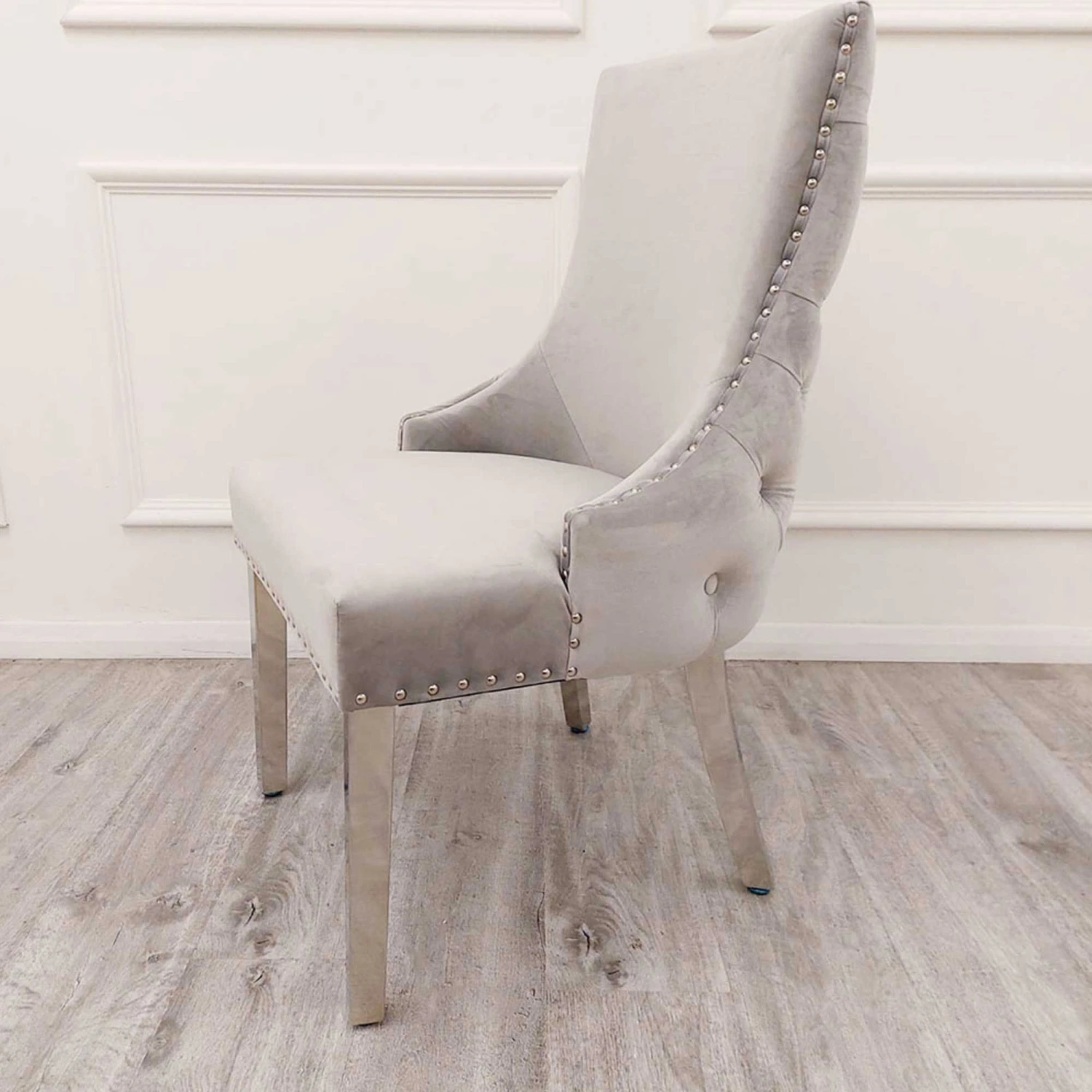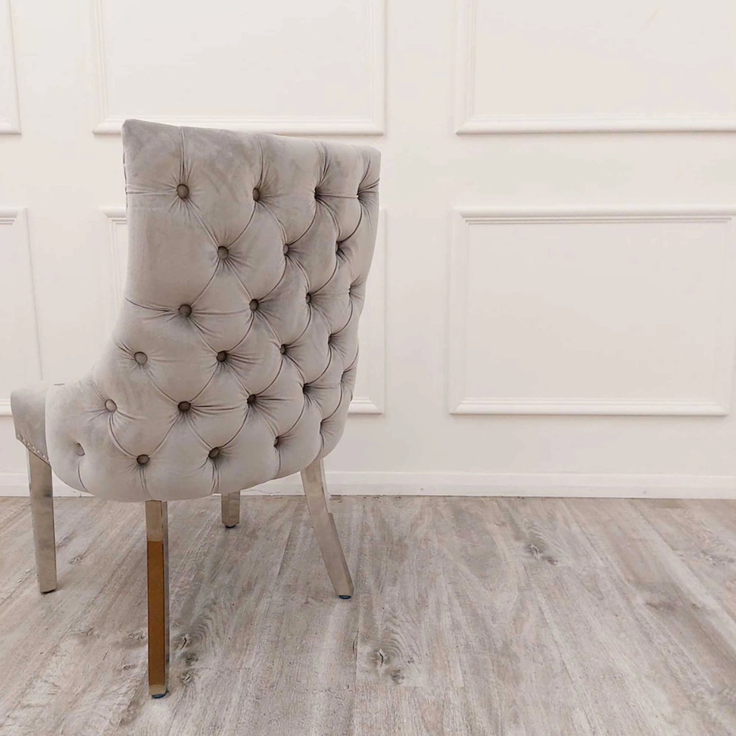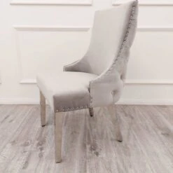 An exquisite looking dining chair featuring deep button back design, stud detailing and coming upholstered in a sumptuous soft velvet fabric, this Kensington Light Grey Dining Chair is certain to be comfortable and supportive when sat round the dining table. Stood upon chrome metal finished legs, it’s solidly built to last you many years.