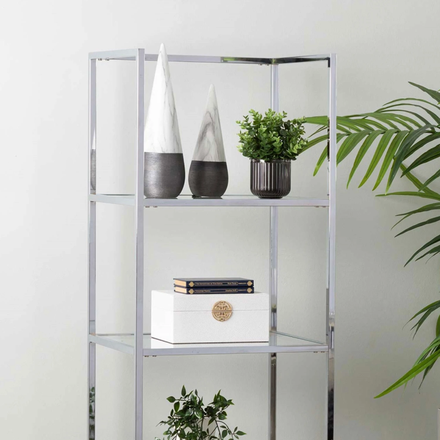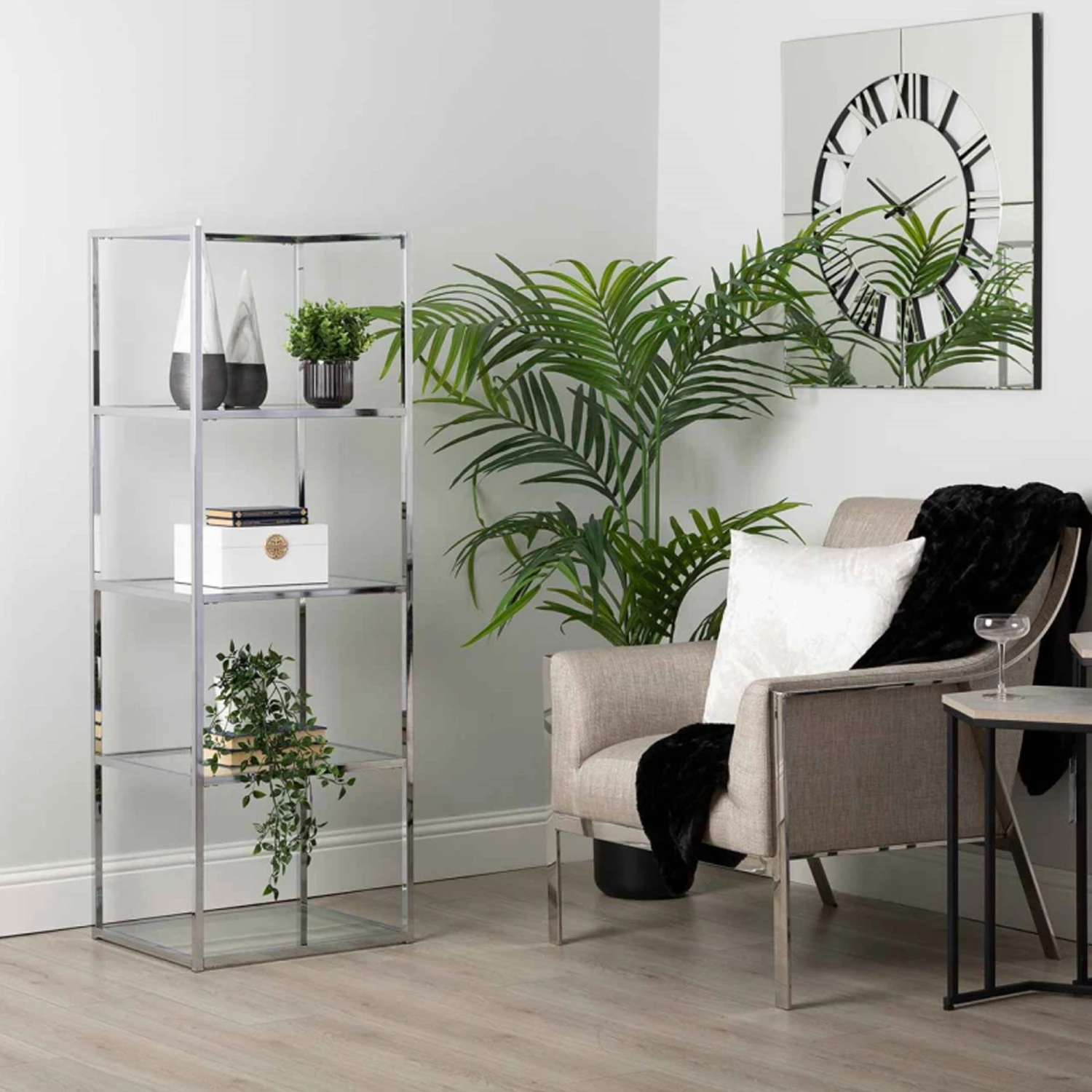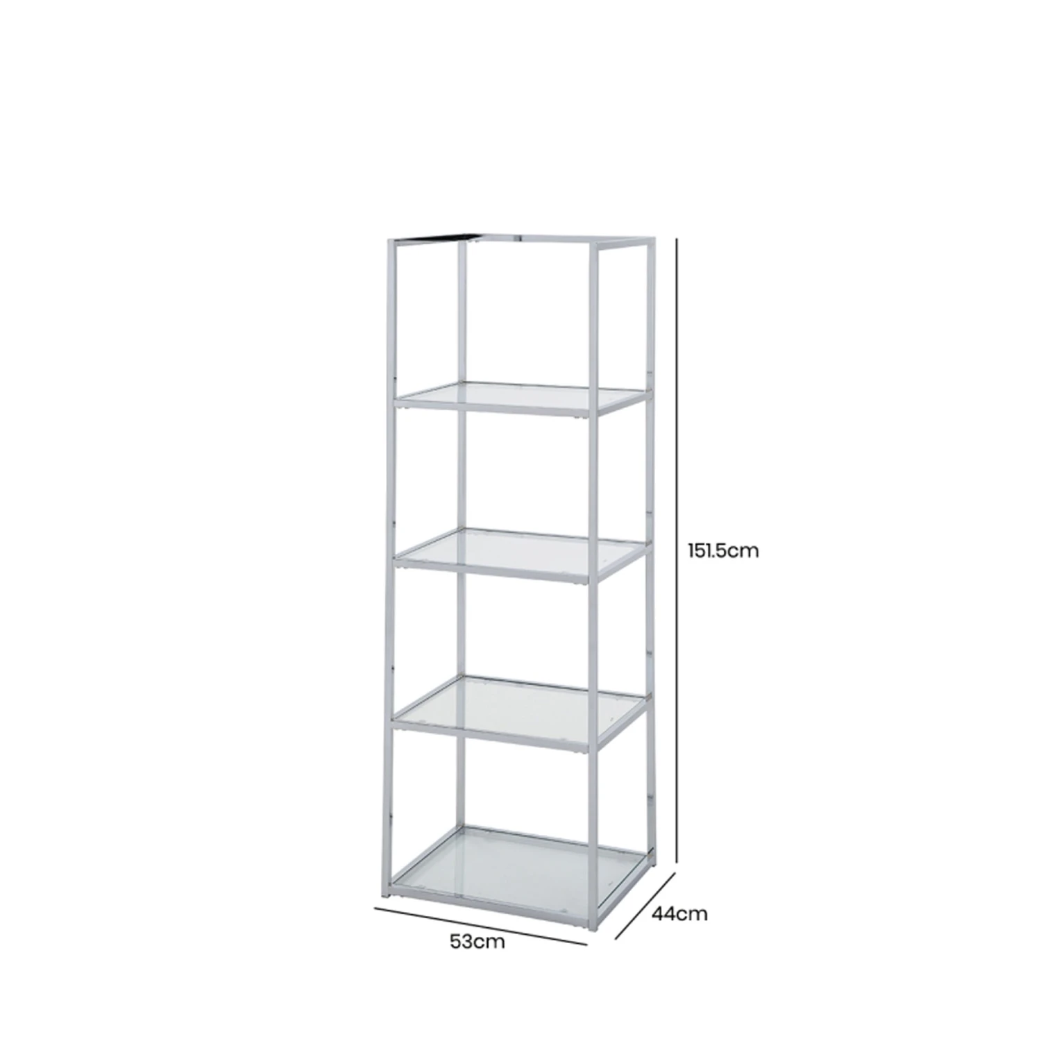 A great way to bring added decoration into the home is with this Logan 151.5cm Chrome and Glass 4 Tiered Rectangular Display Unit. Manufactured with a stainless steel frame with tempered glass shelving, it has a chrome finish and comes with a 4 tiered design, giving you plenty of space for ornaments, photos, and houseplants. Designed as a vertical storage solution, it’s compact enough to fit in the corner of a room, making it a practical addition in any modern home.