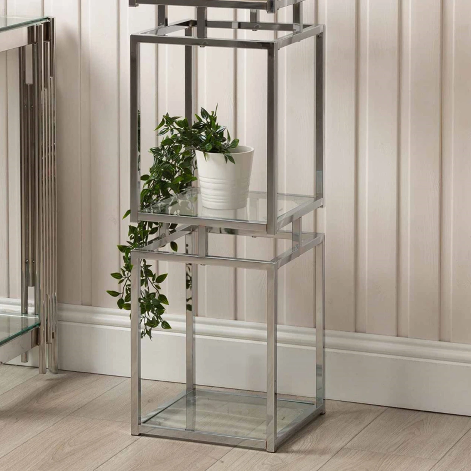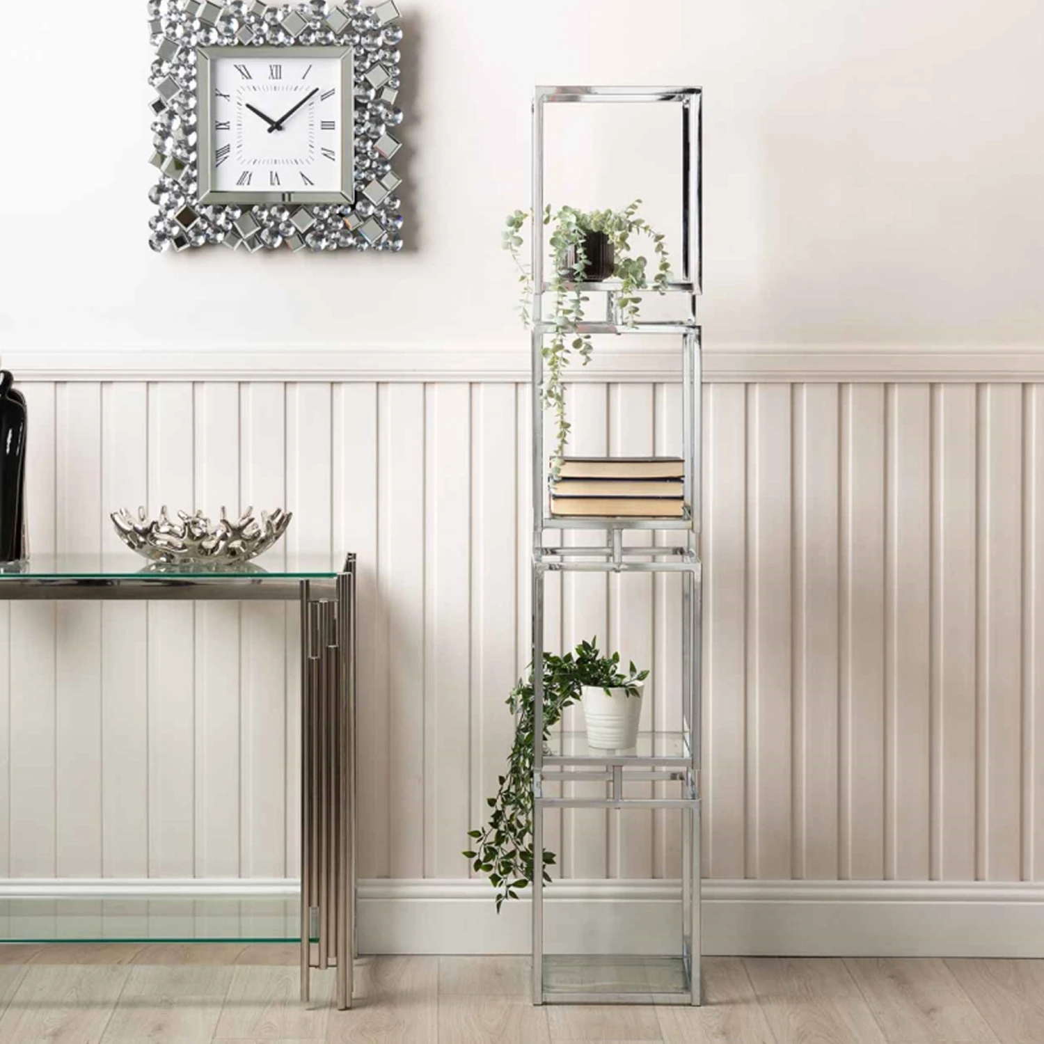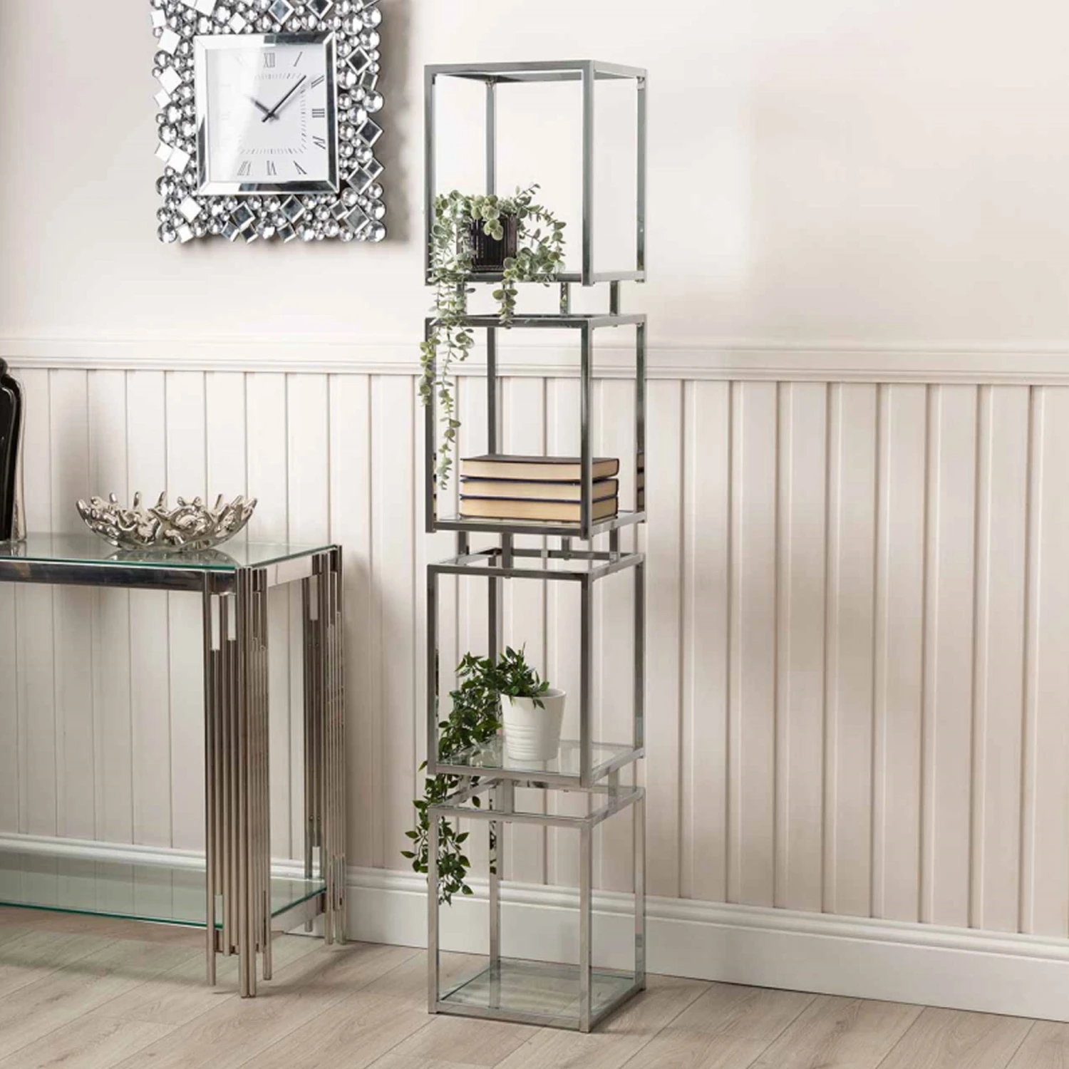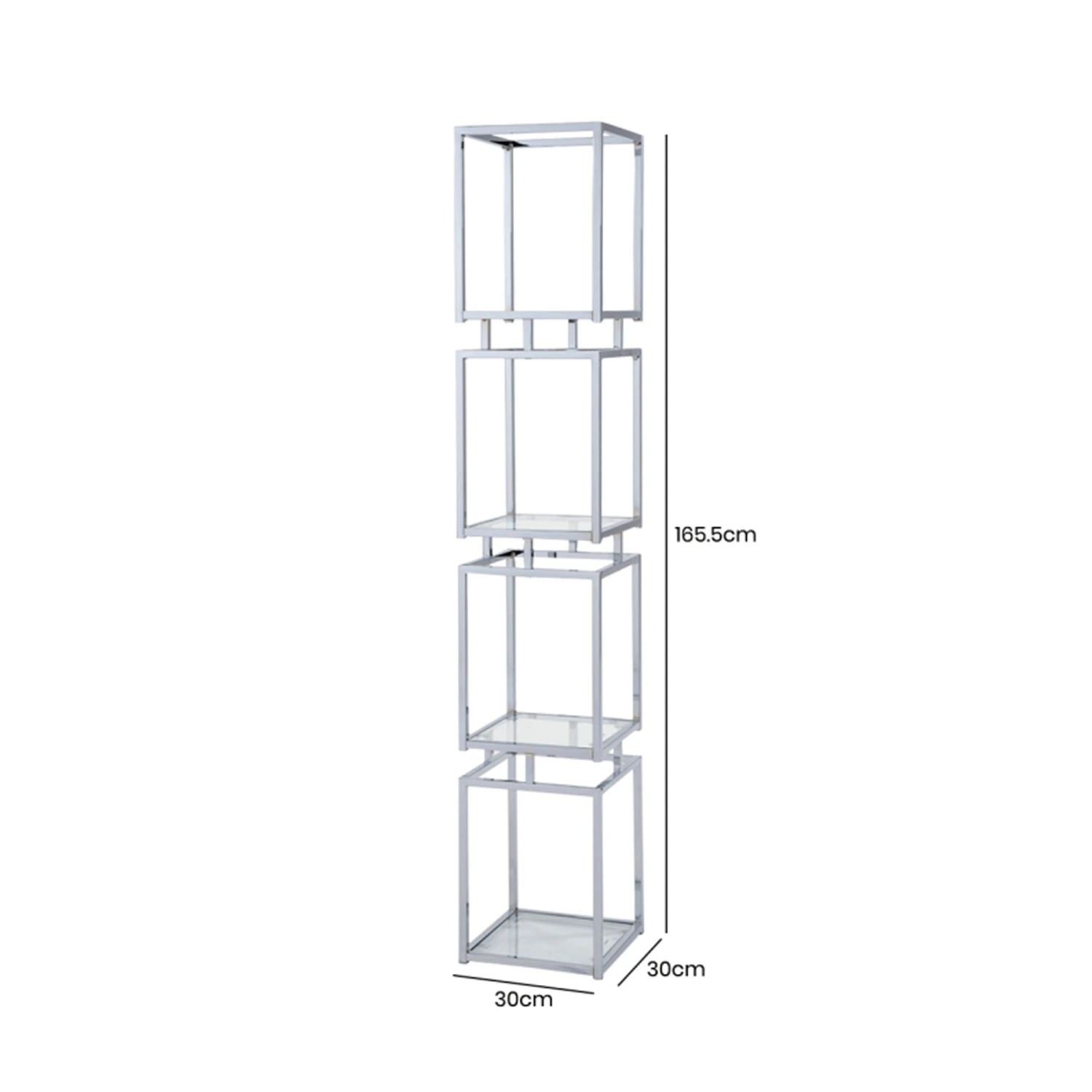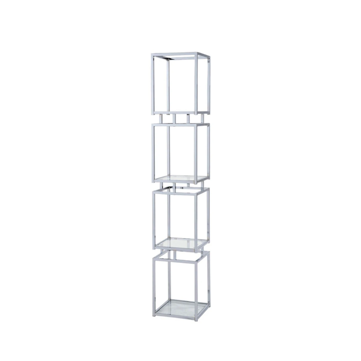 Display works of art, decorative ornaments, photo frames and much more on this Logan 165.5cm Chrome and Glass 4 Tiered Square Display Unit and bring your interior decor to life! Crafted with a stainless steel frame in a silver chrome finish, it has a 4 tiered design with tempered glass shelves, making it a modern display unit that will certainly impress when filled.