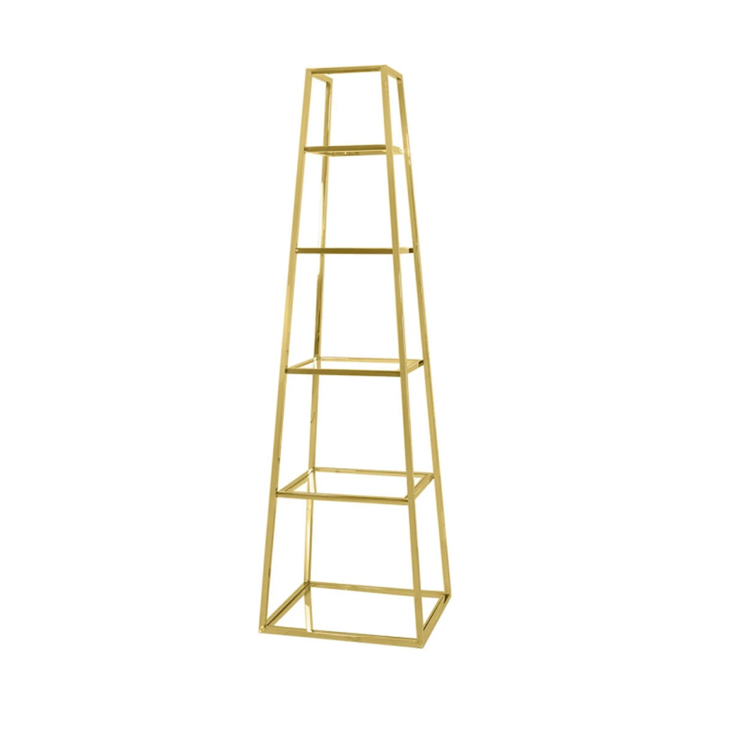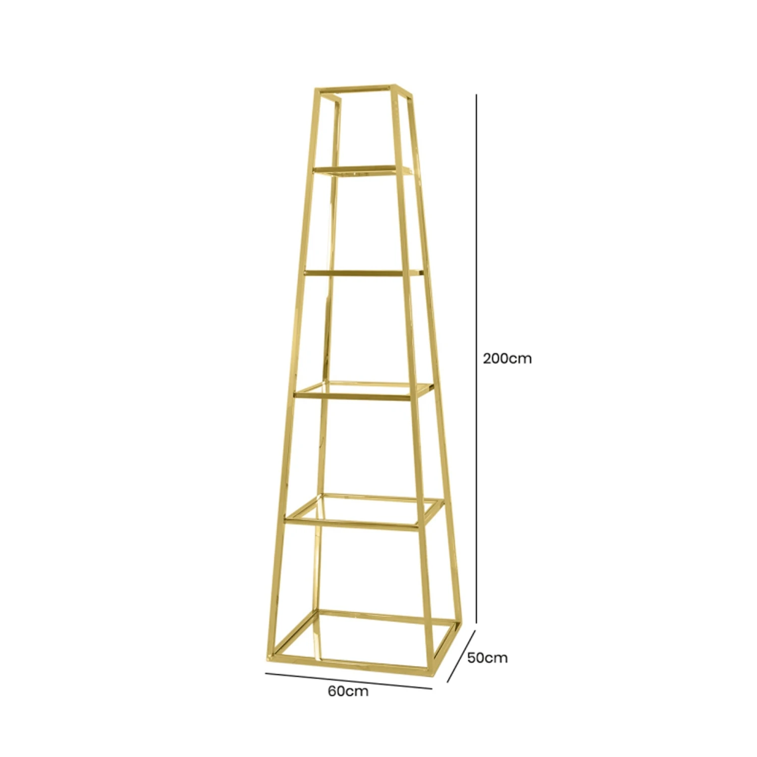 Discover our Logan 200cm Gold and Clear Glass 5 Tiered Ladder Display Unit, both sleek and stylish, it’s great for adding a display section to your indoors, showcasing your favourite art pieces, projects, and ornaments. With a 5 tiered design, it’s manufactured with a gold stainless steel frame with tempered glass shelves in a ladder design to add detail and a touch of modern furnishing. Perfect for the corner of a room, it won’t disappoint when filled with decorative staples.