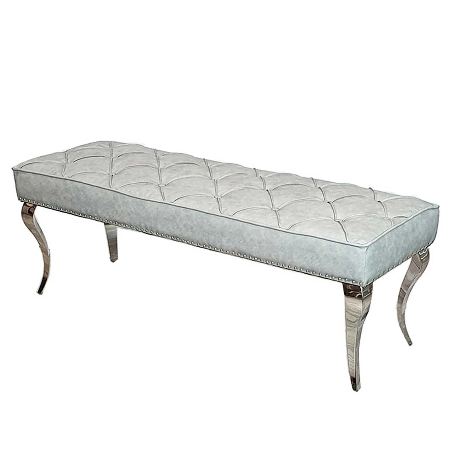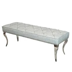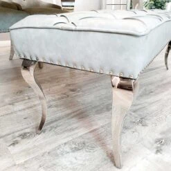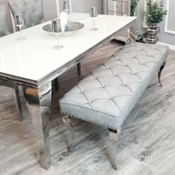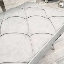 Upgrade your dining seating with this beautiful Louis 1.3m Light Grey Leather Dining Bench. Designed with a deep button detail with studded edging, it comes upholstered in a light grey leather fabric that is both hard-wearing and easy to wipe down. Great for adding extra people to join you to dine, whilst also being space-saving, fitting snugly underneath the dining table.