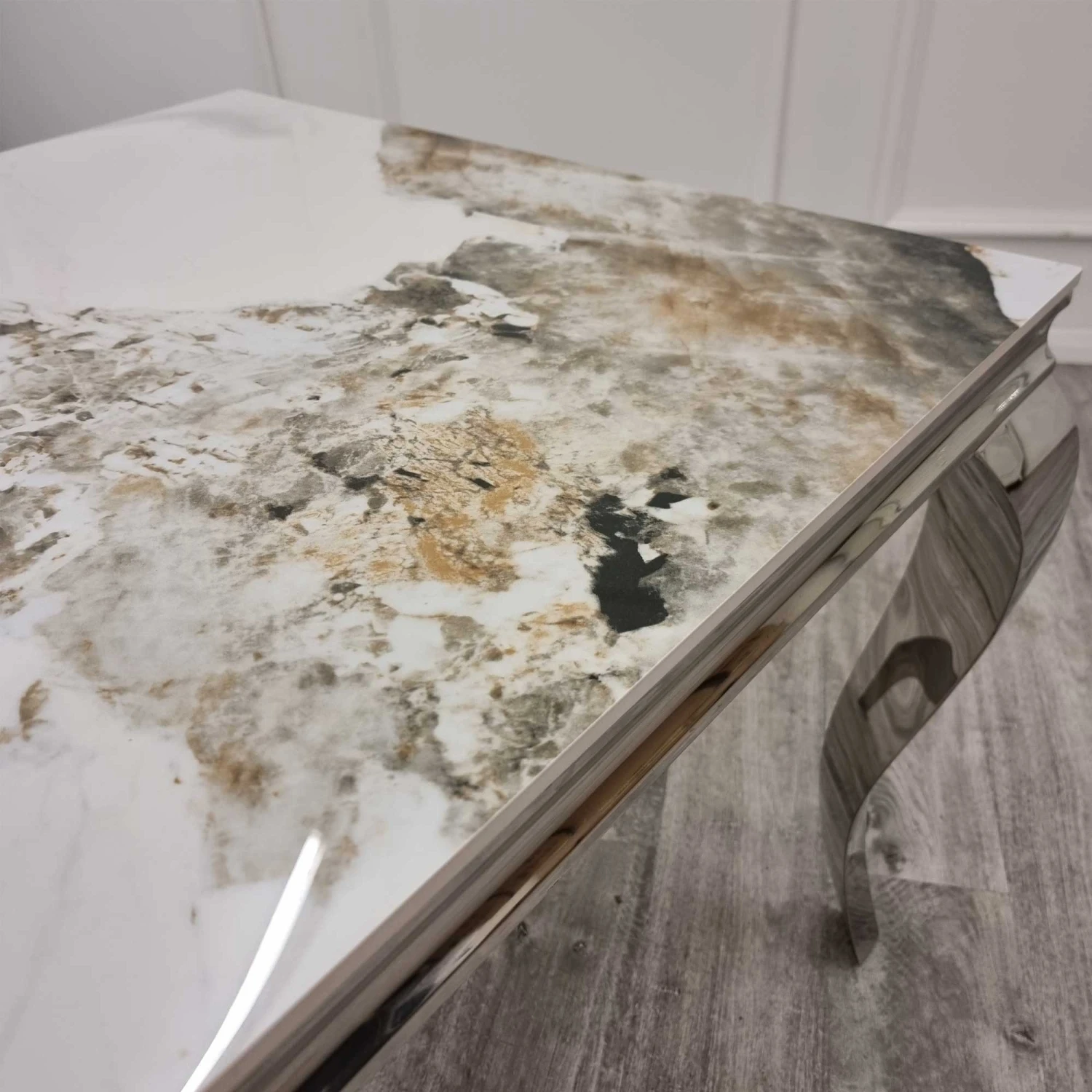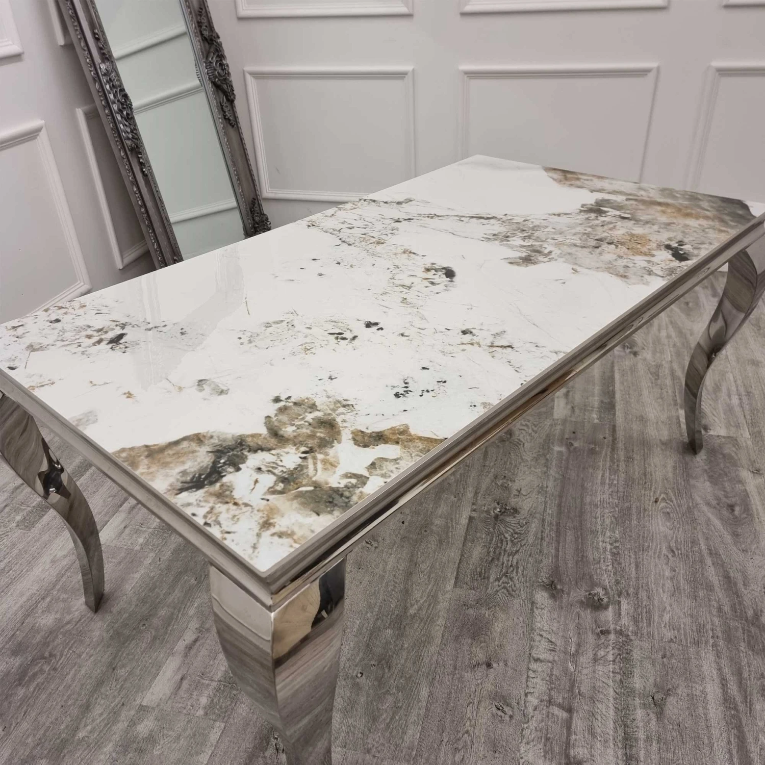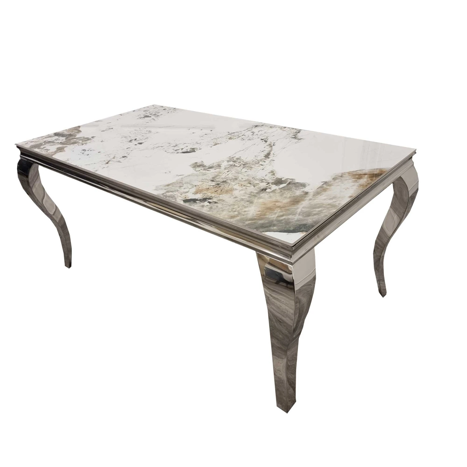 Gather the family for dinner on an evening and dine around this Louis 1.8m Chrome Dining Table with Pandora Gold Sintered Stone Top. A luxury designed dining table that is guaranteed to upgrade your dining furniture in an instant. It has a rectangular shape with a pandora gold stone top, and chrome base with 4 solid metal legs. The sturdy base ensures a durable build, creating a dining table that will last you many years.