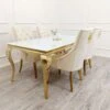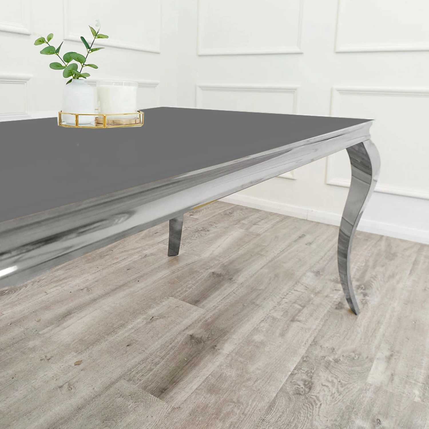 Crafted with a stunning grey glass top and chrome base the Louis Chrome 1.4m Dining Table with Grey Glass Top is the epitome of luxury. The table comes with fancy curved legs and a decorative trim around the table edge and is made with hardwearing and scratch resistant materials. This dining room table will bring Parisian Chic to your dining room and will look beautiful pair with other matching items of furniture for minimalist glamour.