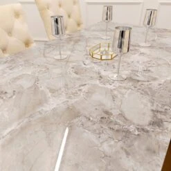 Bringing a luxury feel to your home with this stunning Louis Gold 1.6 m Dining Table with Stomach Ash Grey Sintered Stone Top. The dining table features a beautiful stomach ash grey sintered stone top and golden base. The gold base comes with beautiful fancy curved legs and a decorative trim around the edge of the table. The dining table will seat up to 4 to 6 people around and will look lovely with matching dining chairs and other items of furniture.