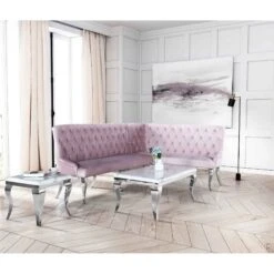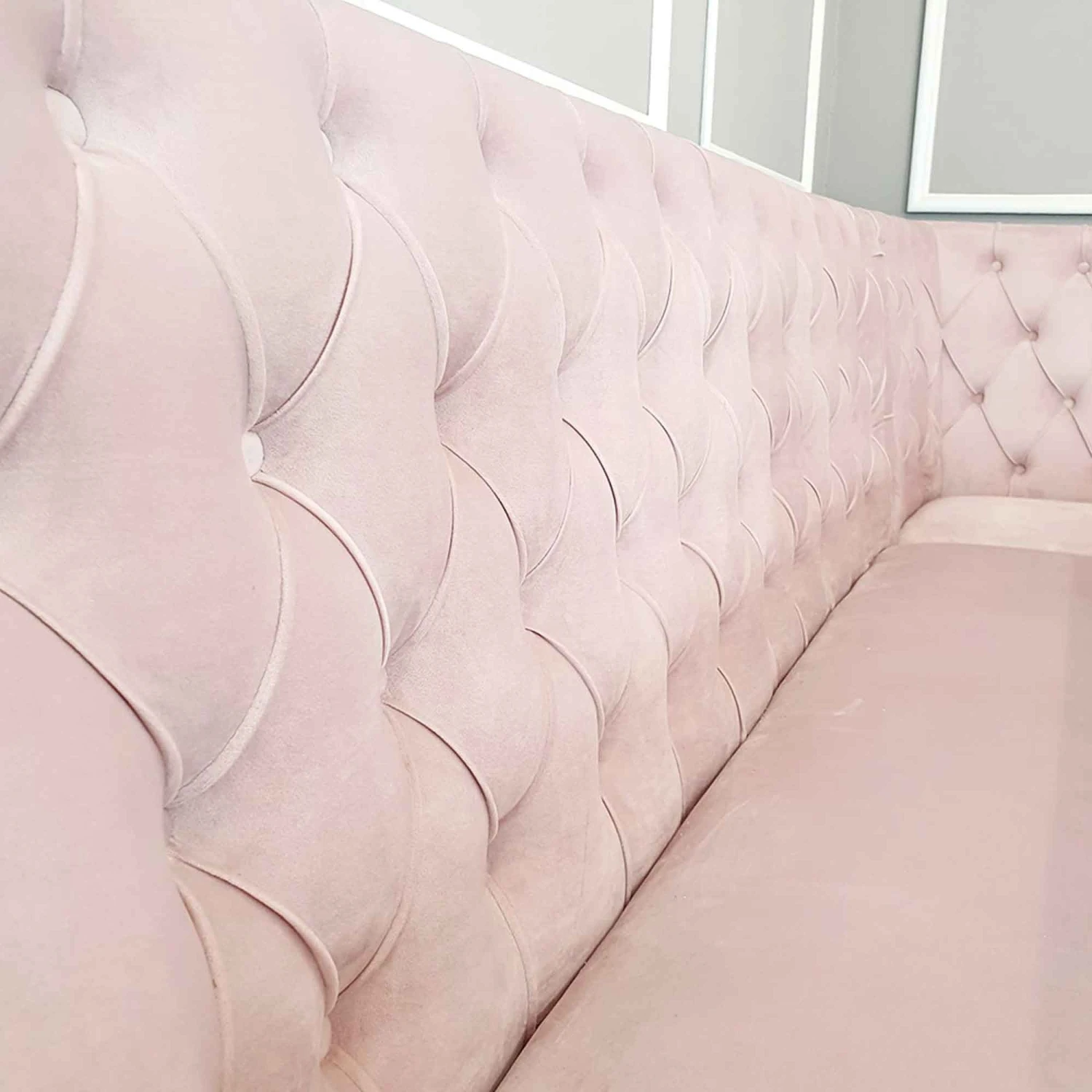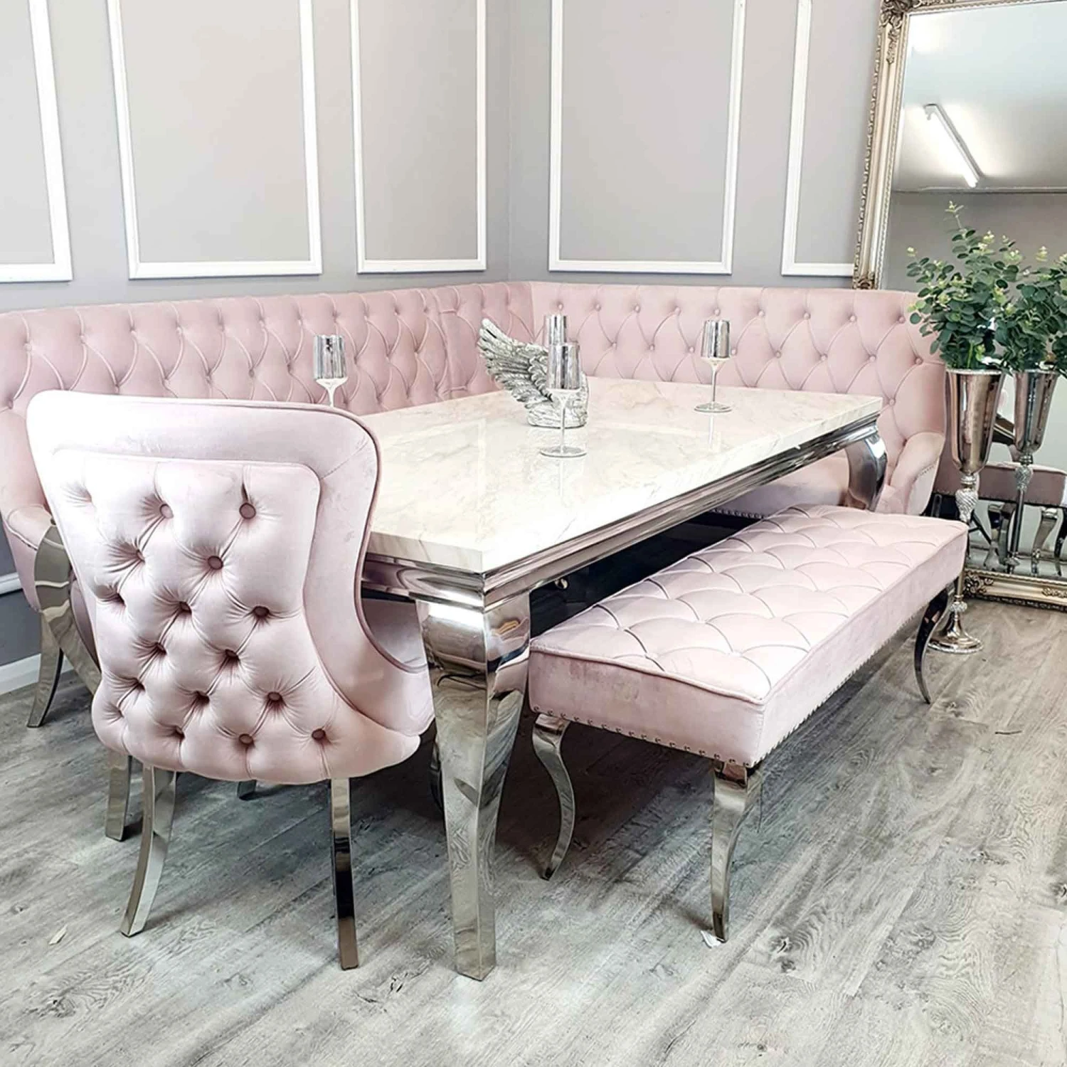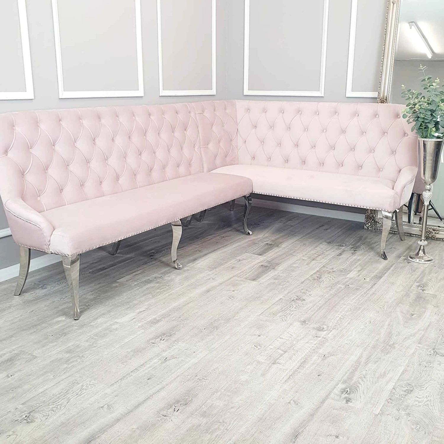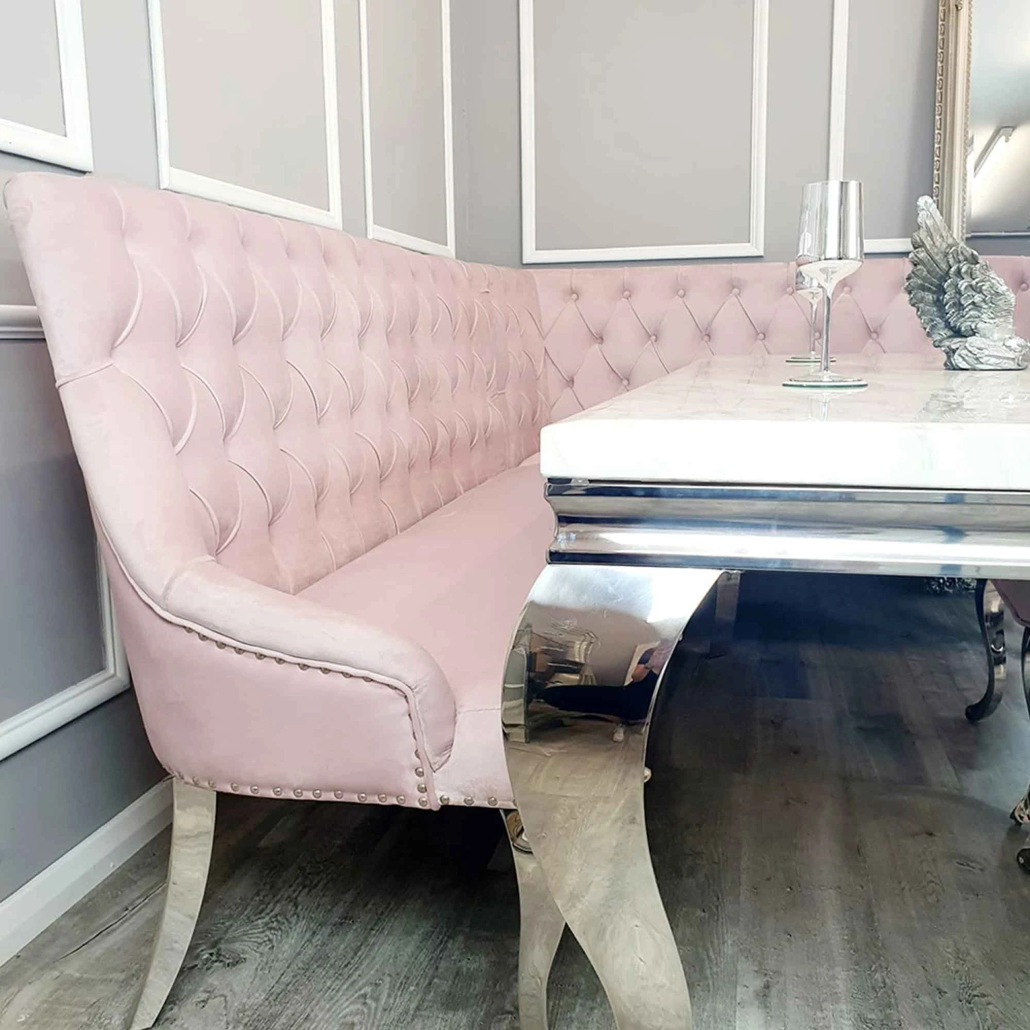 This deeply padded Louis Pink Corner Sofa Bench is a contemporary style of seating that is suitable for your dining room or open-plan kitchen. Freeing up floor space by allowing you to place your dining table in the corner of the room, it has been velvet upholstered in a lovely pink colourway, featuring button back detailing with studs around the edge. Adding elegance and style as well as comfort through its supportive high back rest, it will be a wonderful addition to seat more people whilst dining.