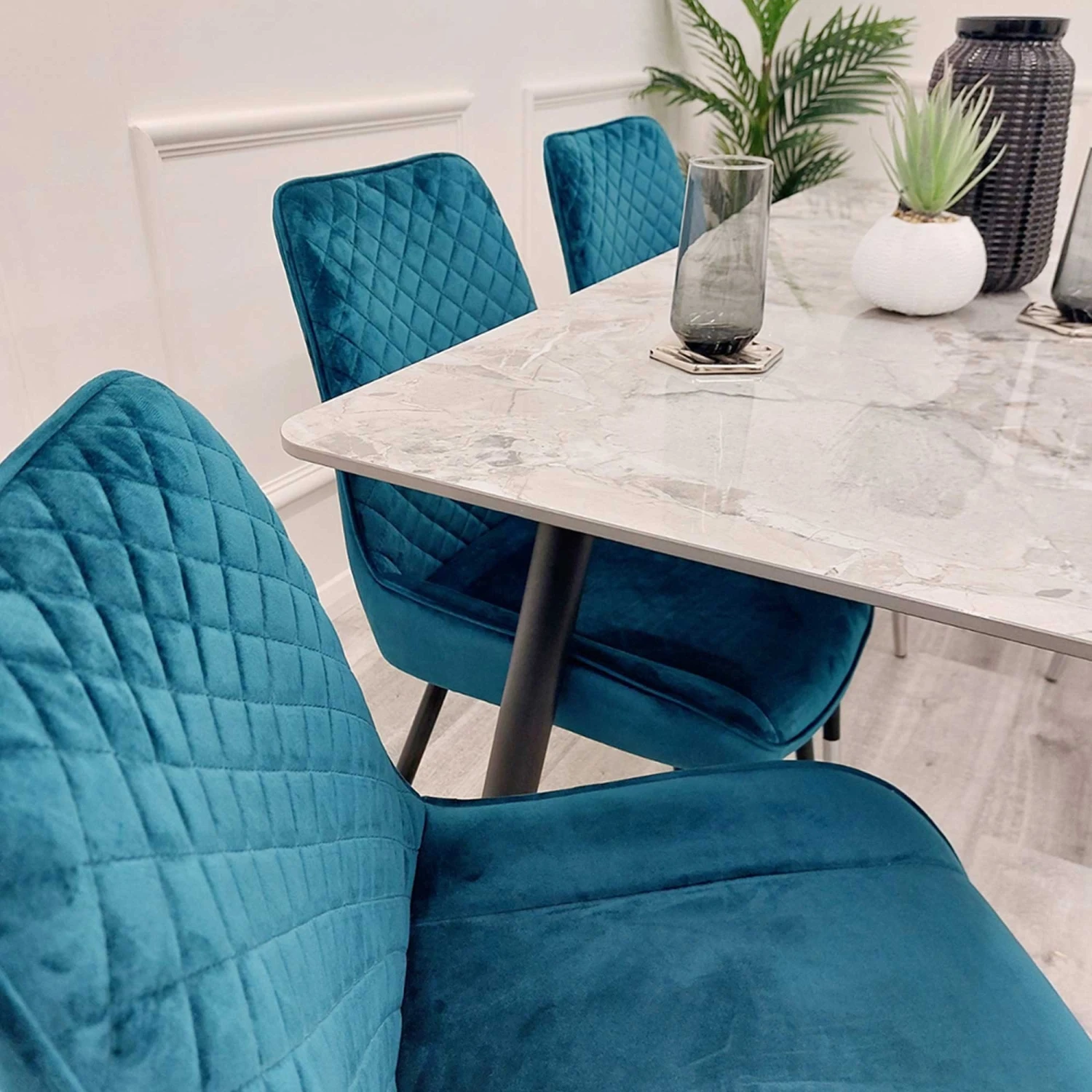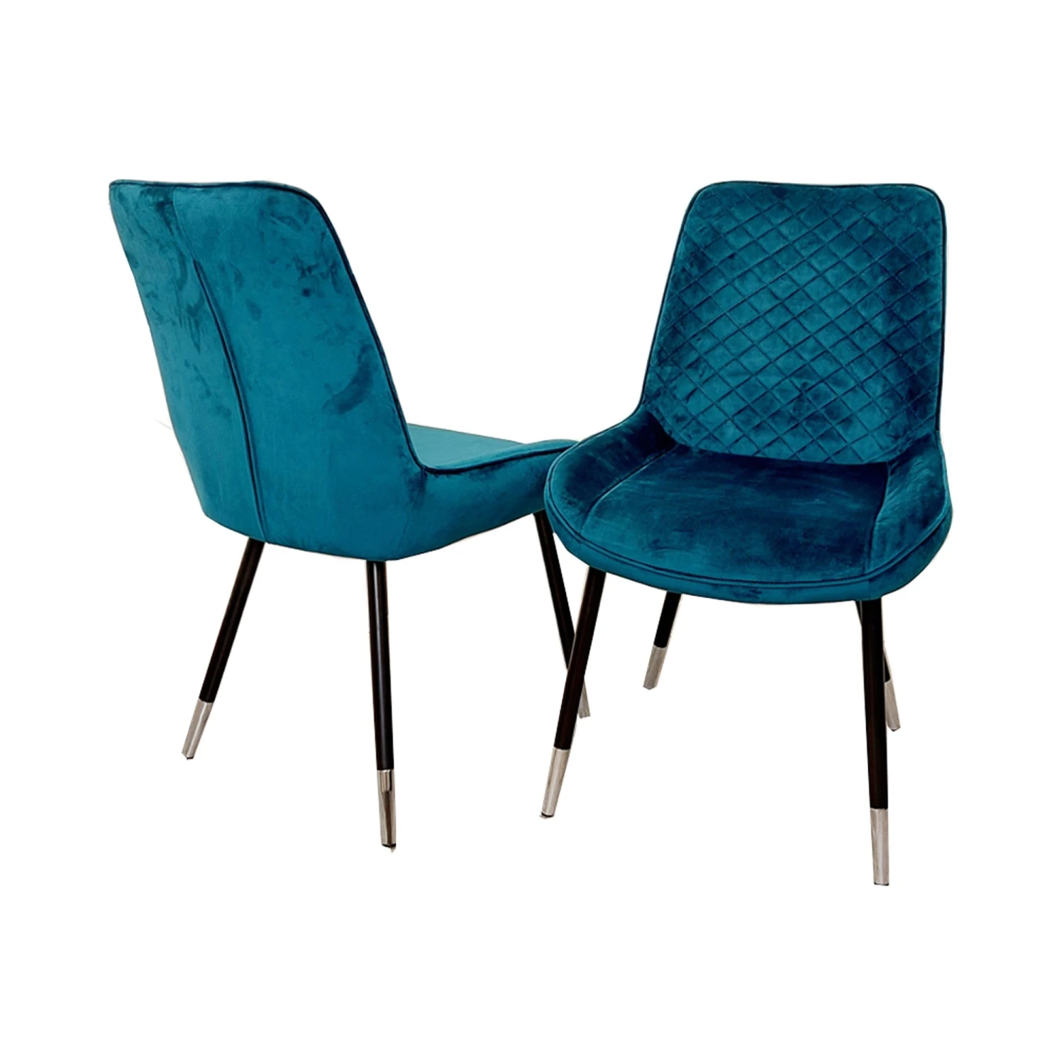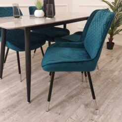 Super soft and comfy, the Luna Teal Velvet Dining Chair comes upholstered in a smooth velvet fabric with a beautiful and bright teal blue shade to enhance the room with a dash of colour. Featuring a cross stitch detailed back for added decoration, it stands upon black tapered legs with gold feet.