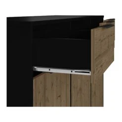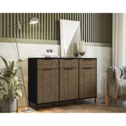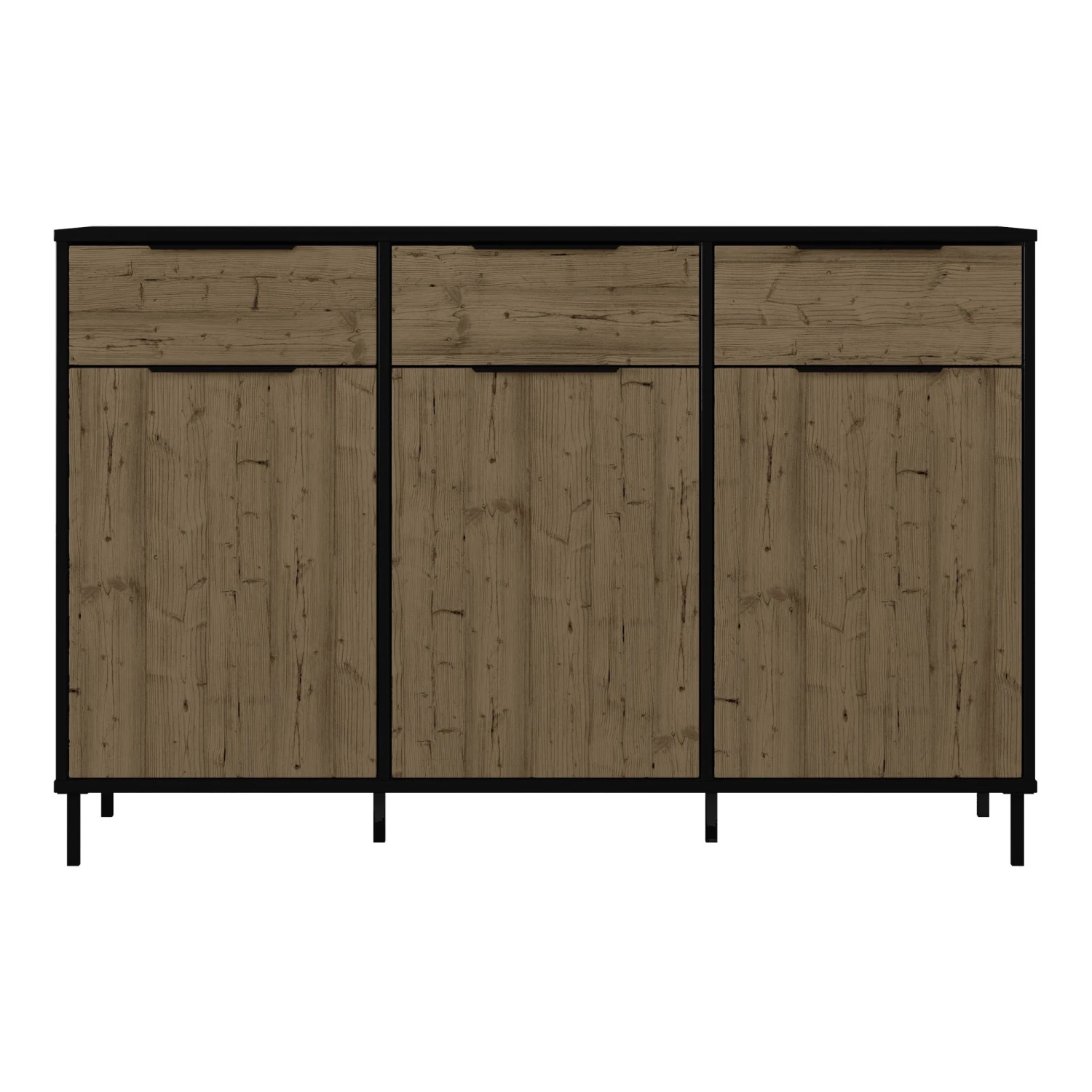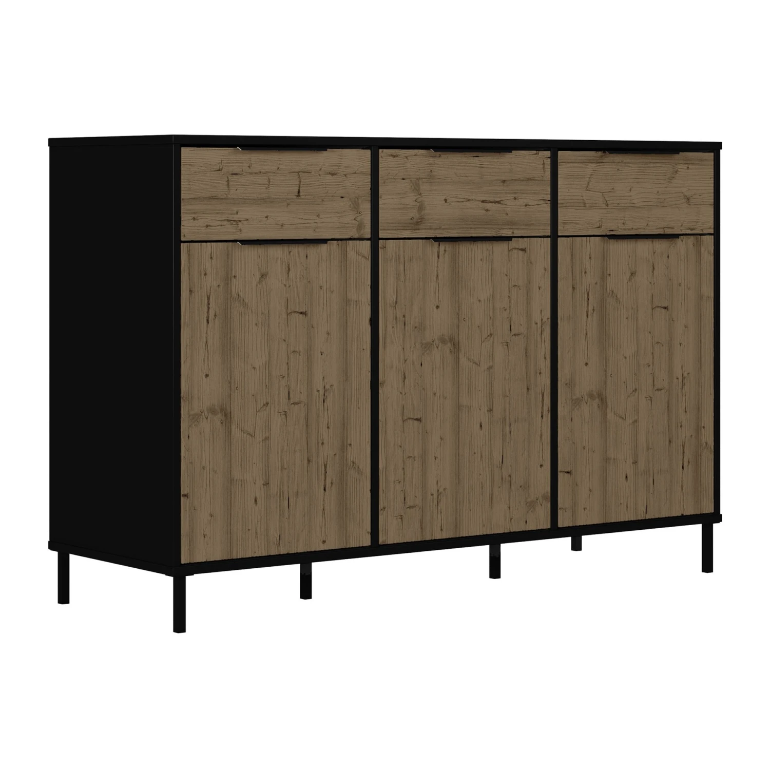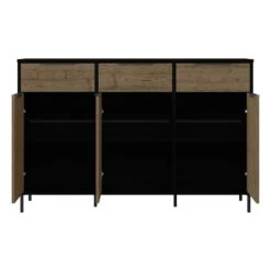 Create extra storage space in your kitchen or dining room when you introduce this beautiful Madrid 3 Door Sideboard. Coming with 3 doors with internal shelving and 2 drawers for spacious storage space, you will never run out! Crafted from top quality MDF and composite board, its hard-wearing properties will ensure a well-built sideboard that will be long-lasting. With a bold black finish and acacia wood effect on its door and draw fronts, its stunning design will certainly stand out, providing you with a functional and practical sideboard that will be very handy.