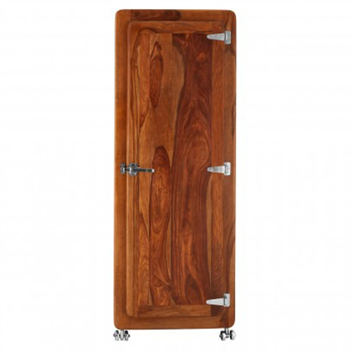 Introducing the Marwar Tall Cabinet. This stunning cabinet uses manmade and natural materials to form an exquisite and modern piece. The cabinet is crafted from mango wood and boasts waving natural wood markings throughout. The cabinet door conceals 4 tiers of storage for practicality and is fitted using contrasting, silver fittings. The cabinet is on silver wheels to add a modern edge.