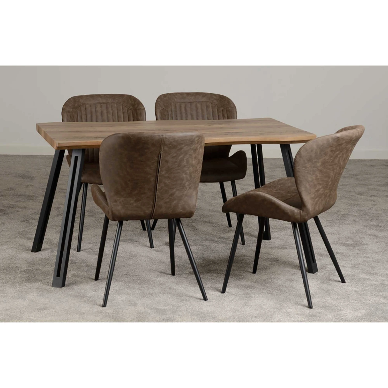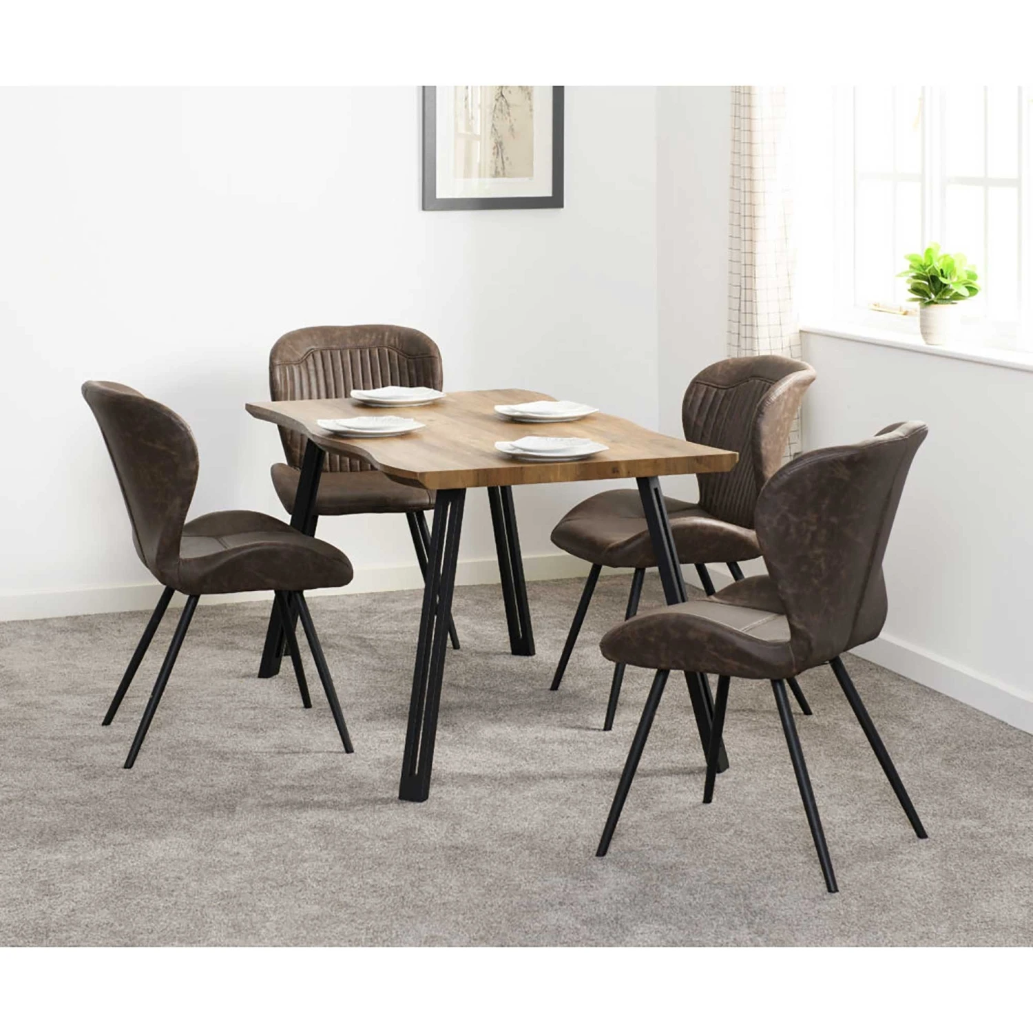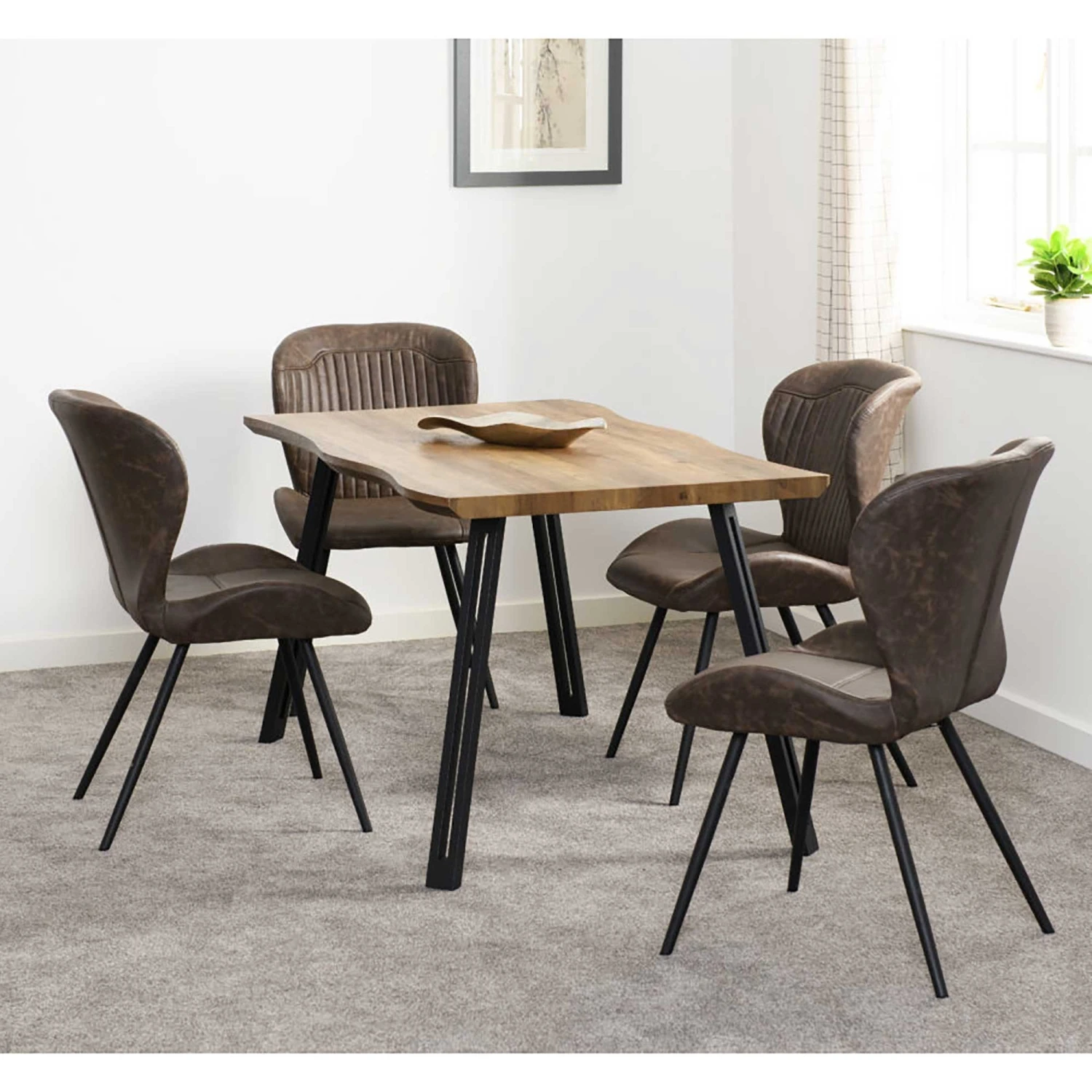 This Medium Oak Effect Quebec Wave Edge Dining Set seats up to 4 people and comes supplied with 4 dining chairs. Each dining chair is finished with luxurious brown faux leather and complete with a black metal legs. The dining table features a modern medium oak effect table top, ideal for any occasion.