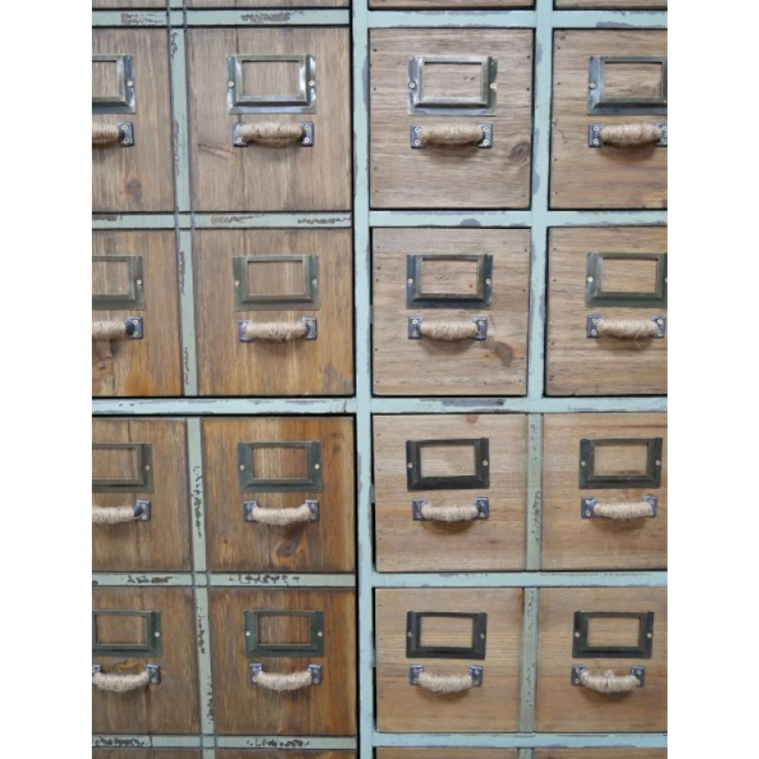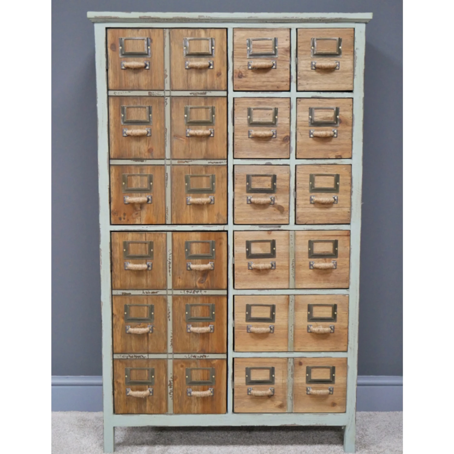 Luxury storage for your home, this multi drawer cabinet has two fir wood cupboards and nine additional drawers for all your storage needs. The distressed green will add a splash of colour to a room and the natural wooden drawers, brings a warmth. A great piece to add alongside a statement item.