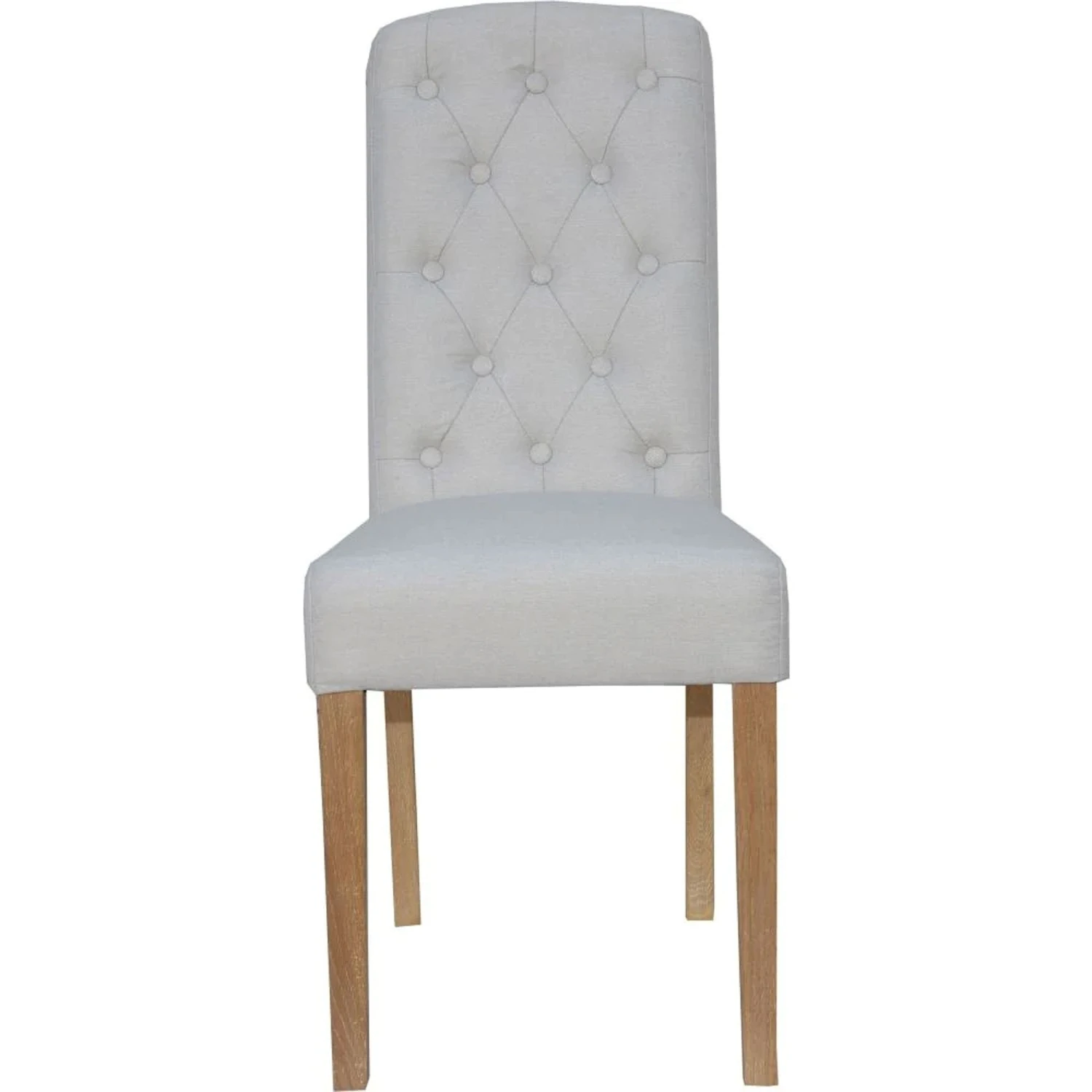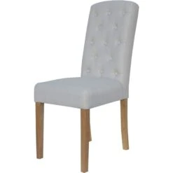 Adding a sophisticated design to your dining room with the Natural Button Back Upholstered Chair. The design comes in a stunning light grey fabric with button detailing to the back rest. The chair comes with a chunky seat for extra comfort and stands on 4 natural brown wood legs that compliment the fabric perfectly. Style with your dining table of choice to match your interiors.