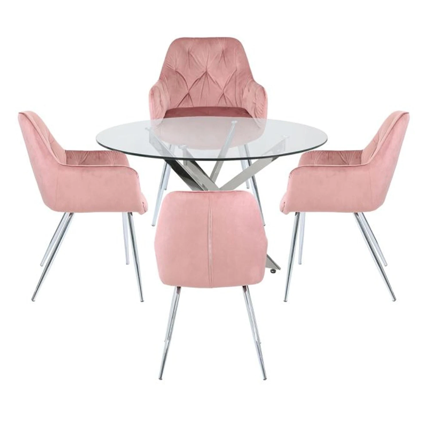 This Nova 100cm Dining Set with 4 Pink Stella Chairs is perfect for seating up to 4 people. The round glass dining table has a diameter of 100cm, suitable for smaller spaces. 4 Pink Stella dining chairs are supplied.