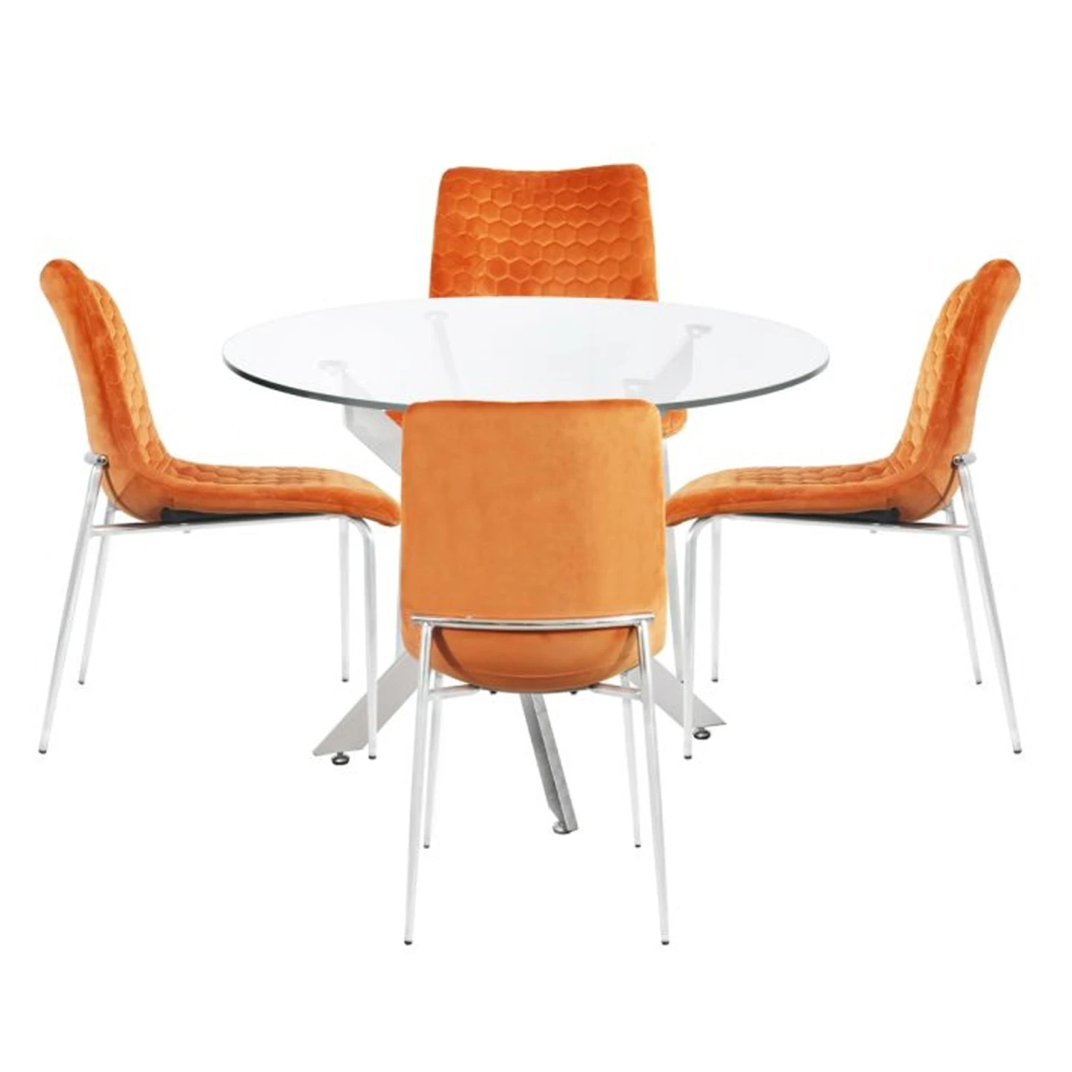 Brighten up your dining room with the Nova 100cm Round Dining Table And 4 Orange Zula Chairs! The round glass dining table comes supplied with 4 Orange Zula chairs, bright enough to turn any dull space into a lively one! The chairs are contoured to the shape of the body for comfort. Other colours available.