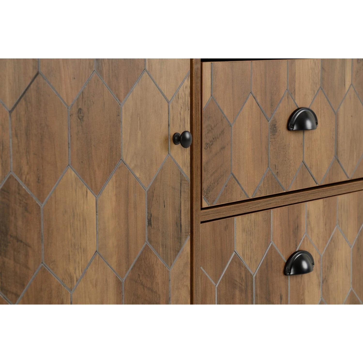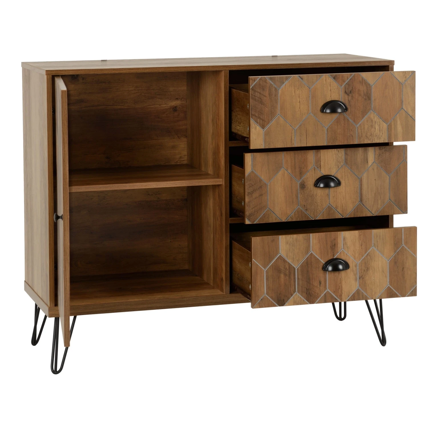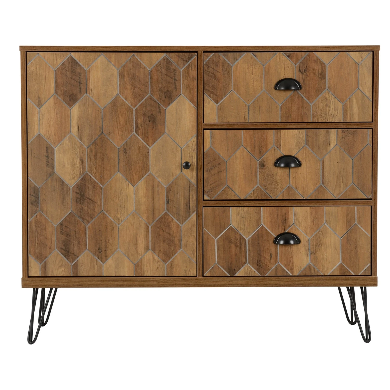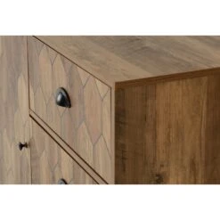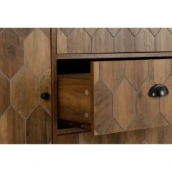 Introducing the Ottawa Sideboard, this large sideboard is certainly a fashionable piece with it’s mosaic-esque style of diamond frames that encompasses the front of the sideboard. This side board features a large door and is complimented with three large drawers.