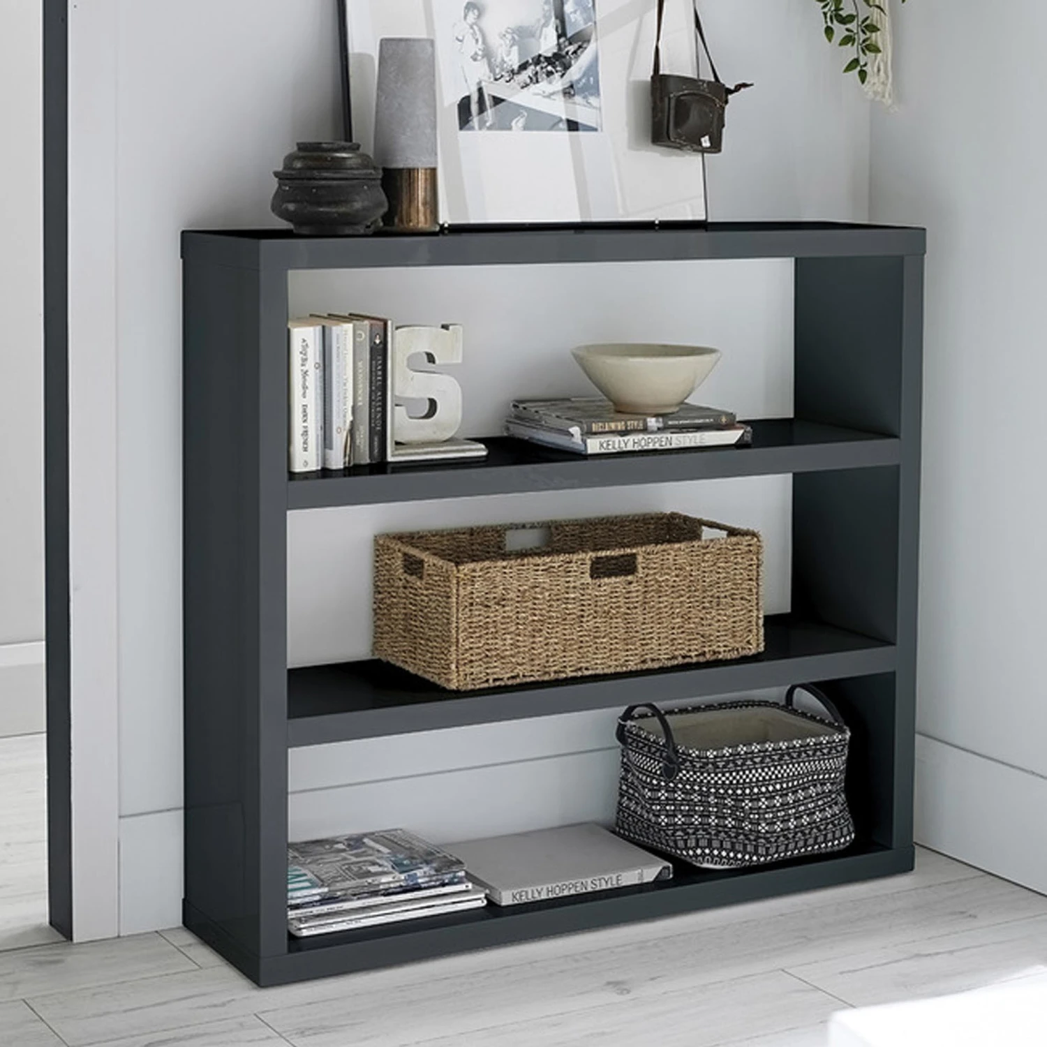 This stunning, modern bookcase would be the most perfect and practical new addition to your home, bringing in a modern, sleek style while providing plenty of storage space. This book shelf features a charcoal sleek exterior and comes with three open shelves, plenty of space to store things and also provides ample space on top for any extra space you may need for things.