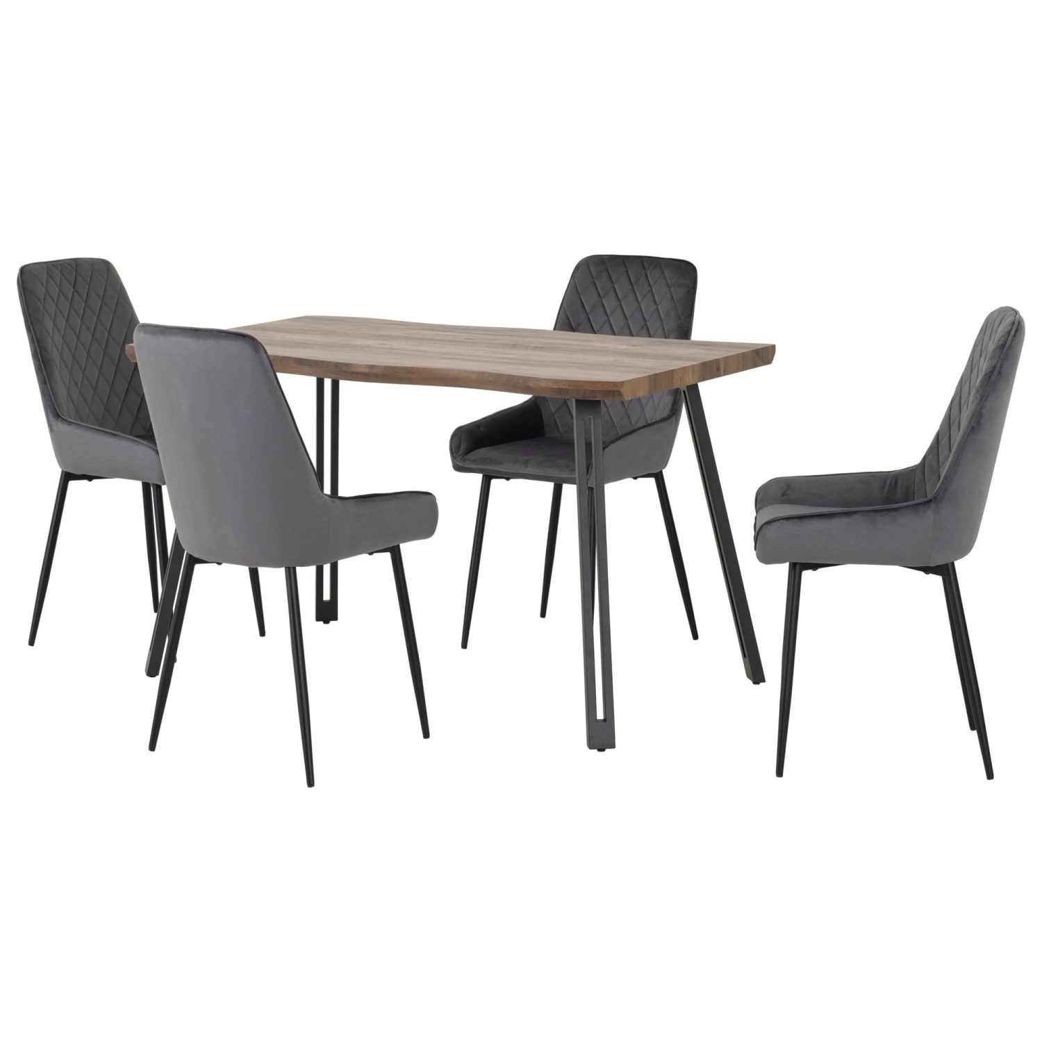 This modern Quebec Medium Oak Wave Edge Dining Set with Grey Velvet Avery Chairs will be a welcome addition in any home, perfect for couples or families. Coming with a wave edge designed dining table in a beautiful natural medium oak, it’s paired with velvet upholstered chairs in a grey shade. Both stylish and comfortable, it has a quilted stitched pattern on the back rests and will be a uniquely designed dining set that will draw attention.