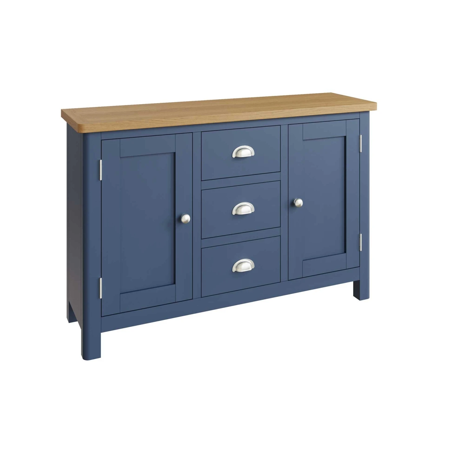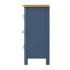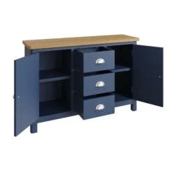 This Ranston Blue Large Sideboard has plenty of storage space for all your plates and bowls! This large sideboard features 2 doors and 3 drawers storage, keeping all your items neatly organised in their own compartments. This modern sideboard is painted in a contemporary blue and finished with a contrasting oak table top and brushed steel handles to complete the look. Matching items available.