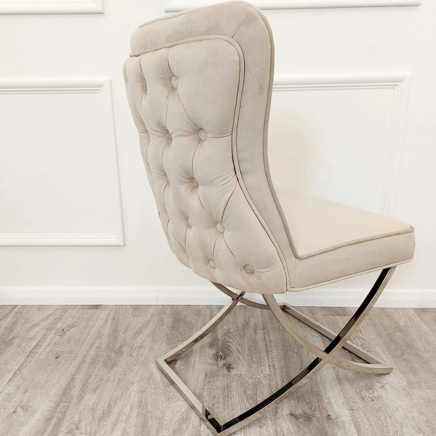 Adding style and comfort to your dining room this stunning Sandhurst Cappuccino Dining Chair with Buttoned Back & X Cross Legs will add a luxurious feel to your home. The chair features a stunning soft velvet fabric in a cappuccino colour. The back of the chair features a decorative touch with deep buttoned upholstered detailing. To finish the chair is complete with chrome curved X crossed legs. Style this dining chair with a matching dining table or similar.