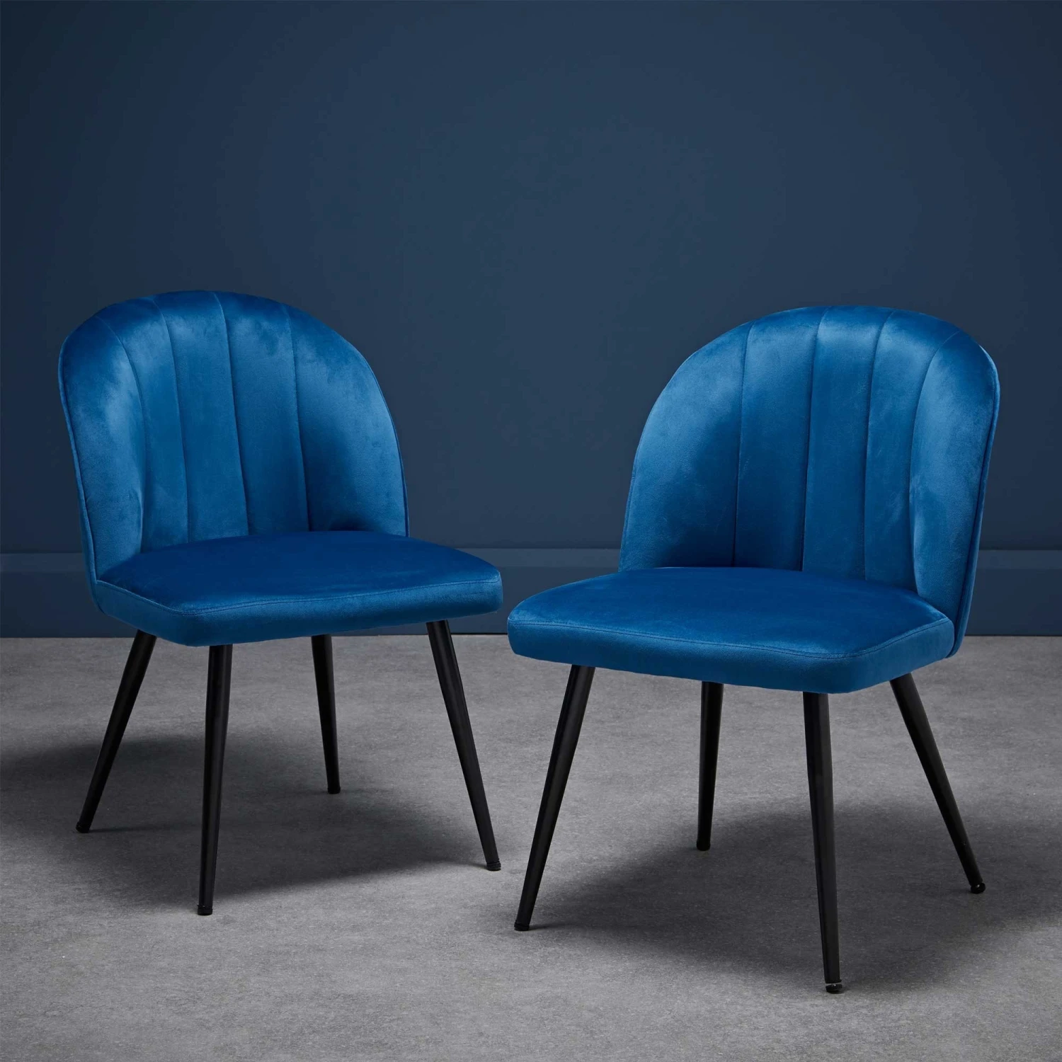 Discover this Set of 2 Orla Blue Dining Chairs, a fabulous contemporary styled set of dining chairs that will add both comfort and style to your home. Coming with a rounded back for you to sink back into, these dining chairs provide a comfortable seat, making meal times more enjoyable. In a vibrant blue colour, they feature a velvet upholstery that is super smooth to the touch and are positioned upon black metal legs to ensure a hard-wearing finish.