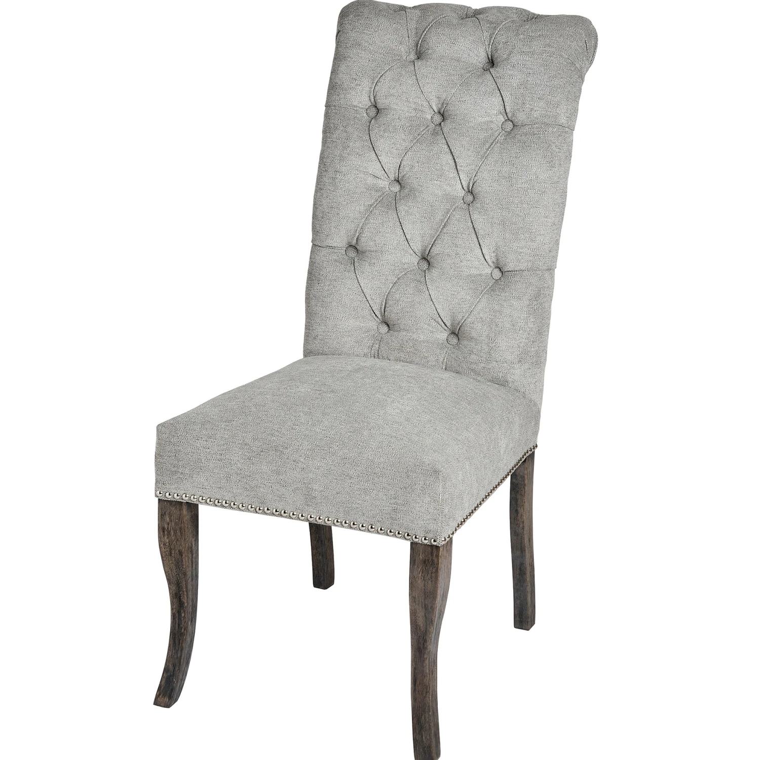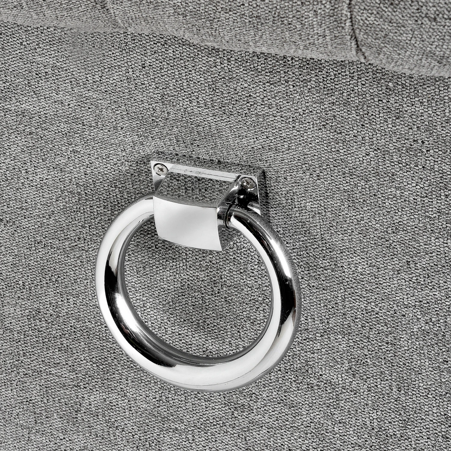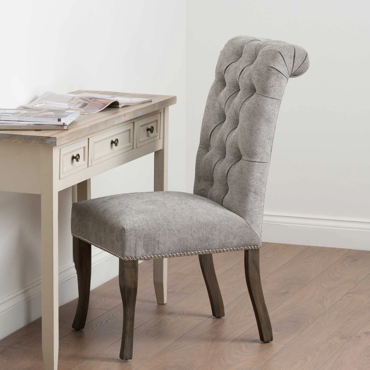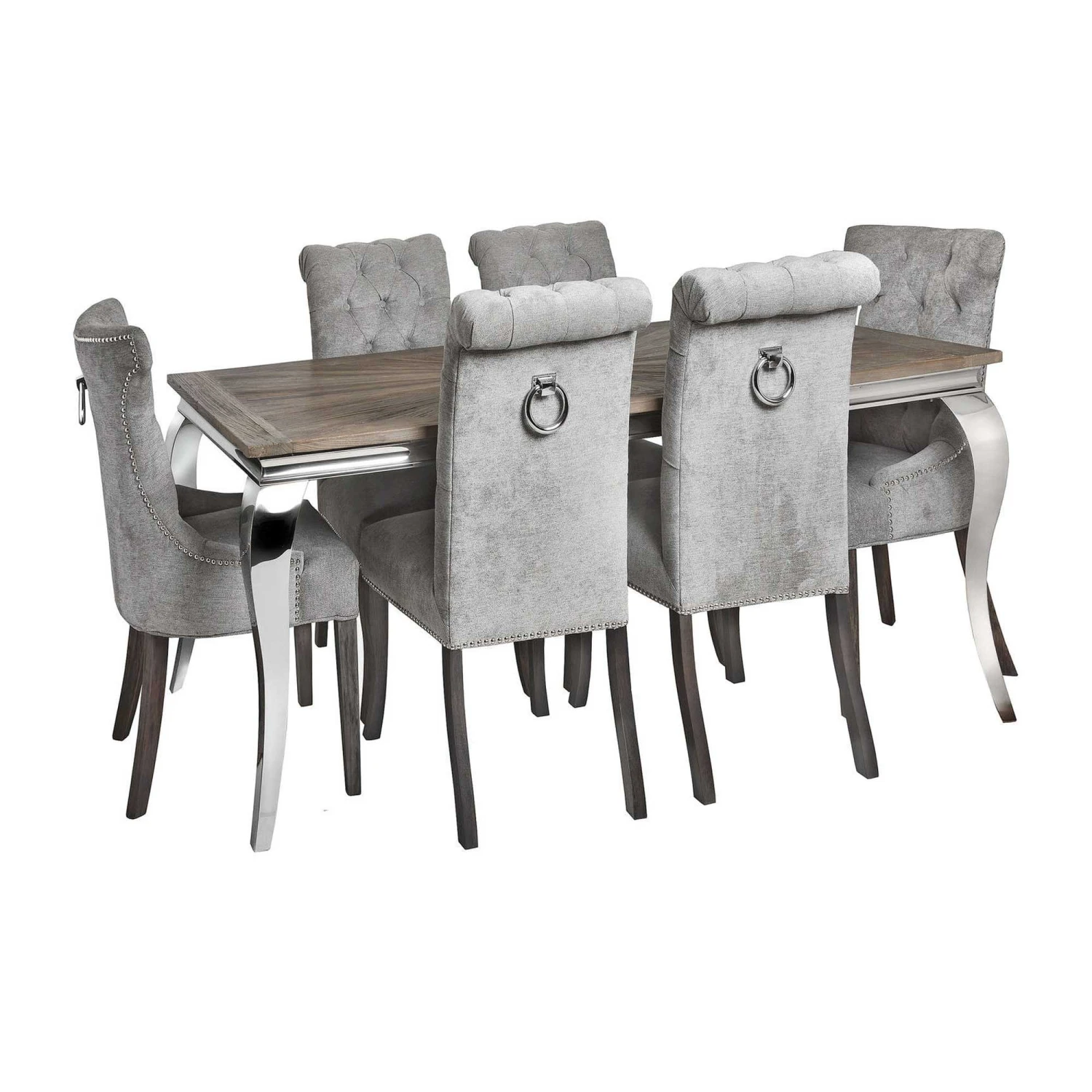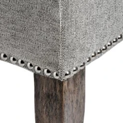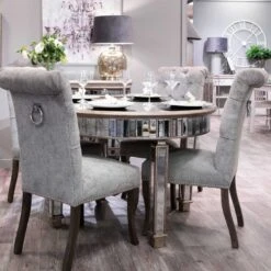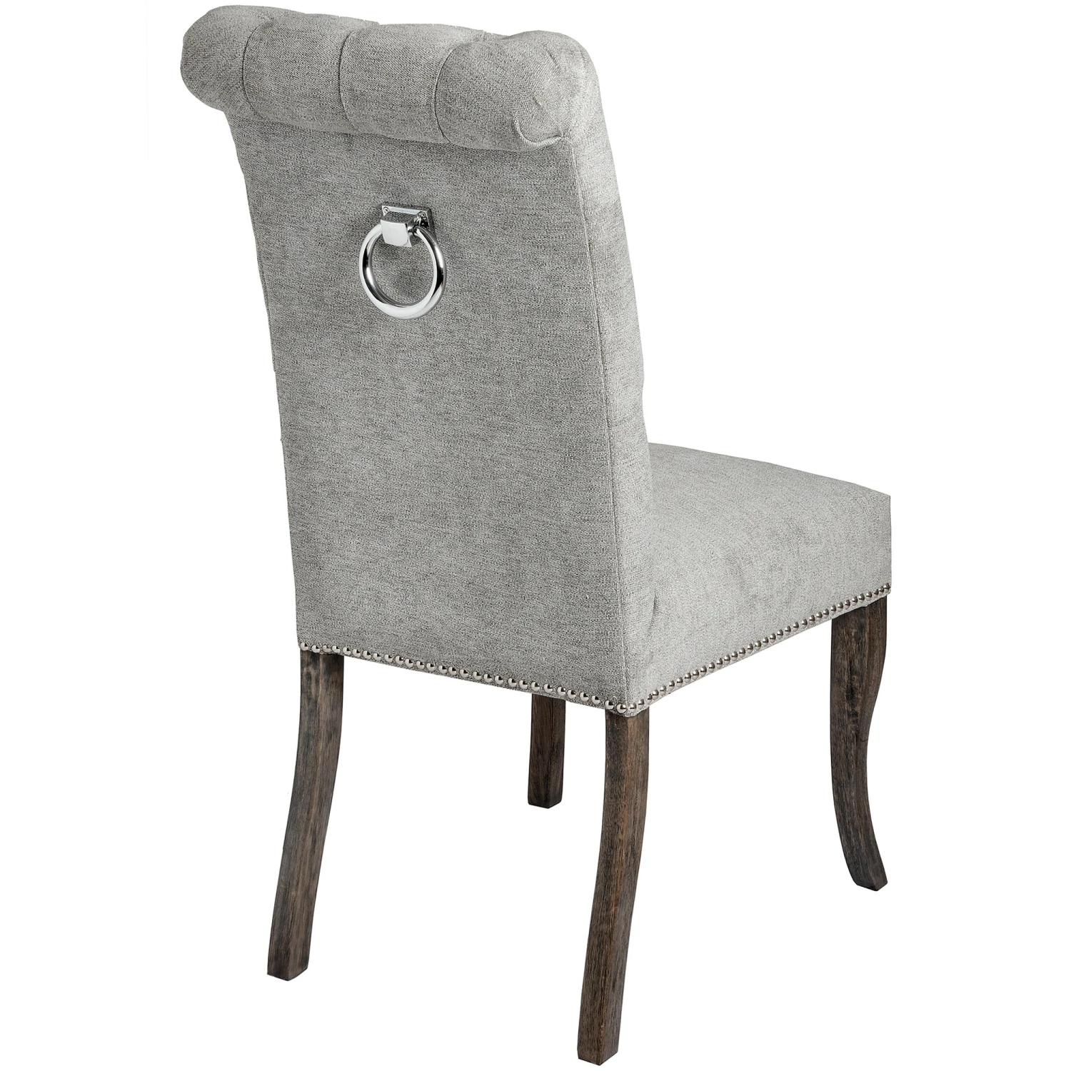 Built from a rubber wood frame, known for its dense grain and strength, the Silver Roll Top Dining Chair With Ring Pull is perfect for use around a dining room table. Upholstered with a silver coloured cotton and polyester blend to add to its aesthetically pleasing look and comfortable feel, the back of the knocker chair features a button pressed style for added detail. Complete with a roll top and ring-pull metal back, it makes it easy to slide the chair out from underneath the table, making it practical also.