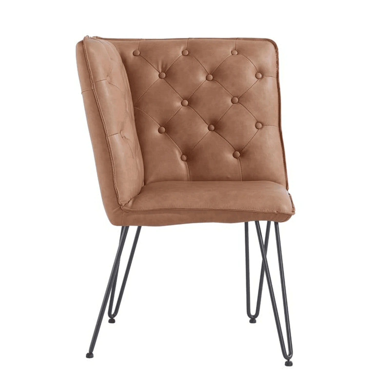 Transform the look of your dining room or kitchen with this Tan Studded Back Corner Bench. Perfect for when you are limited to floor space, this is super practical and can be pushed up against the corner of a wall, to create a smaller dining set up thanks to its compact design. Crafted with a black metal frame and legs, it creates a stable and sturdy dining bench that is upholstered in a stunning PU leather in a tan colour. With a padded back rest and seat for ultimate comfort, it is finished with button stud detailing for effortless style.